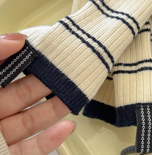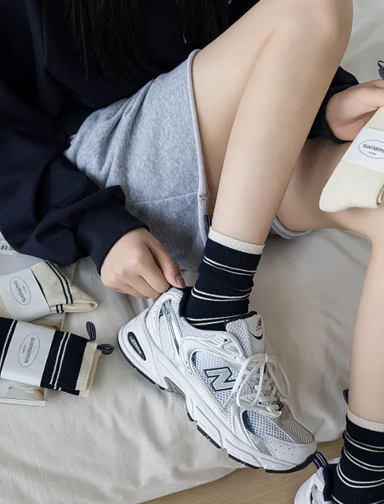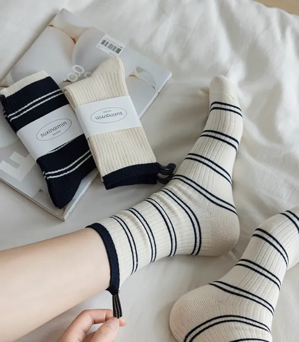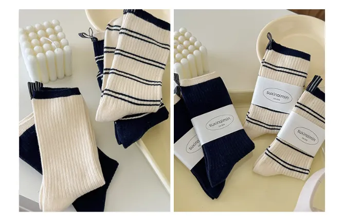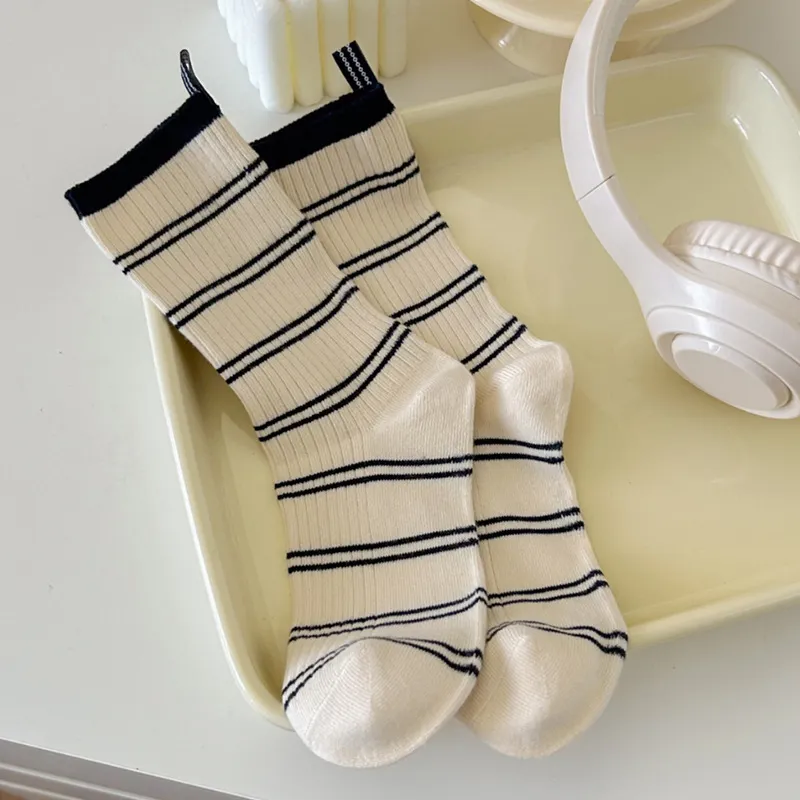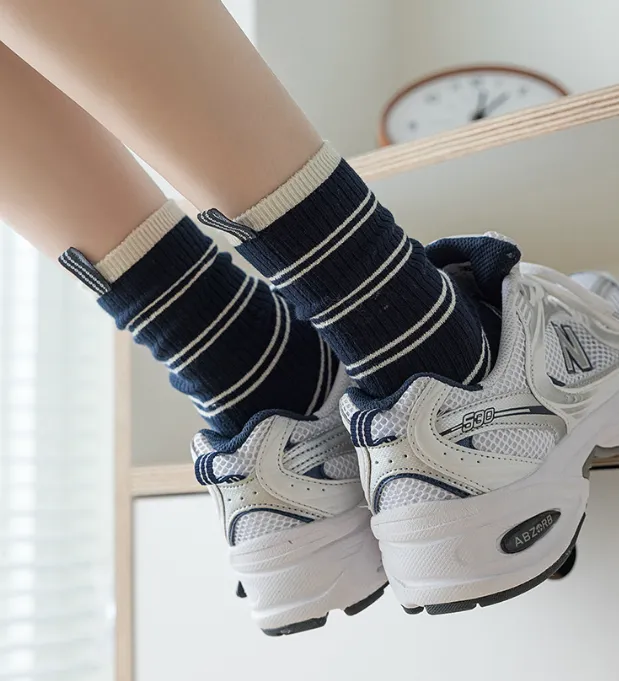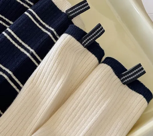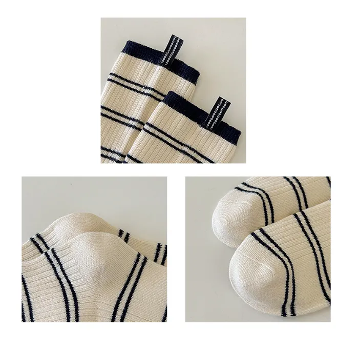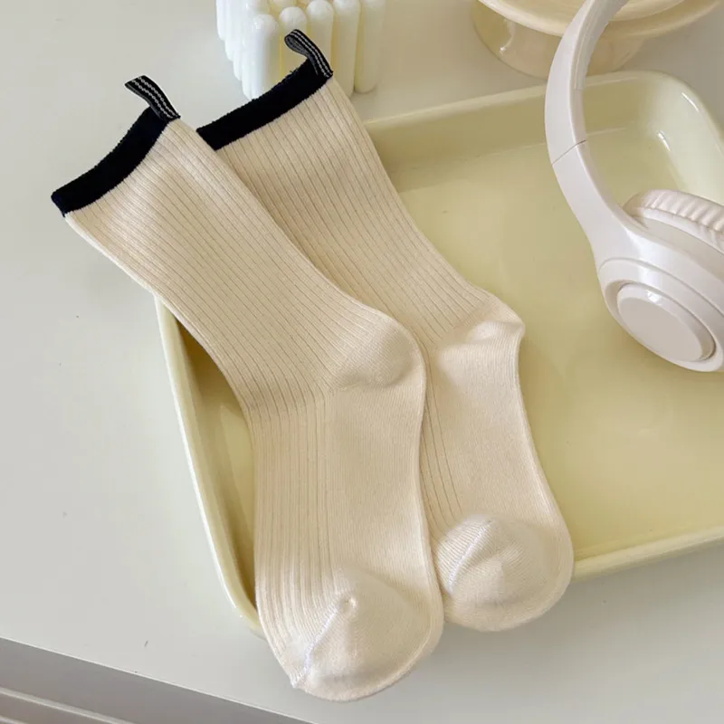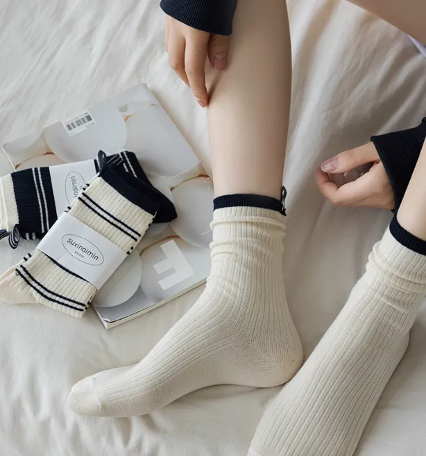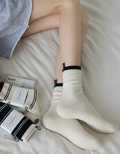 撞色條紋後標設計日系中筒堆堆襪 4色