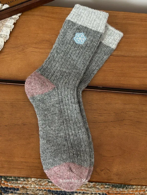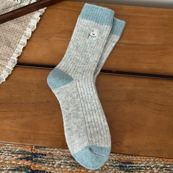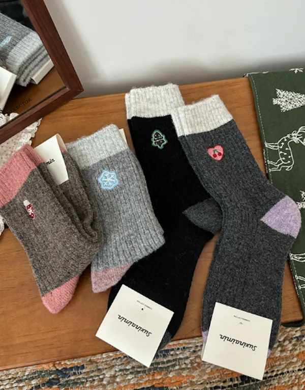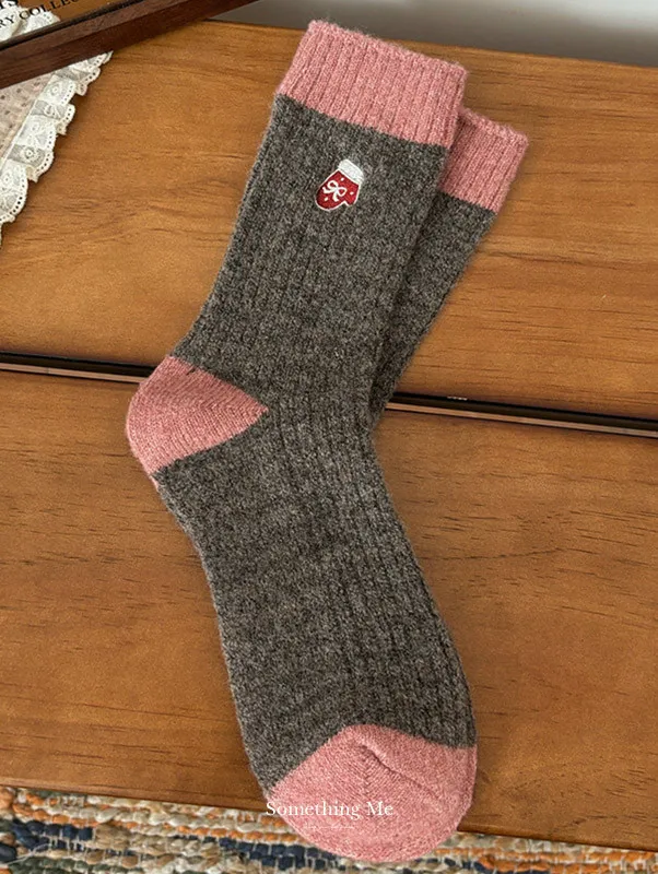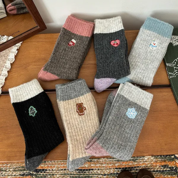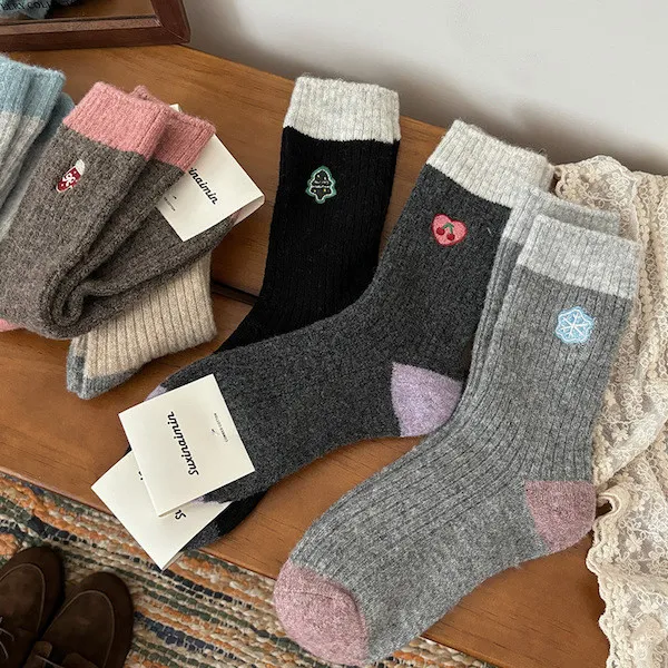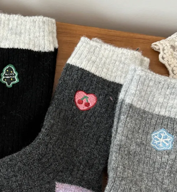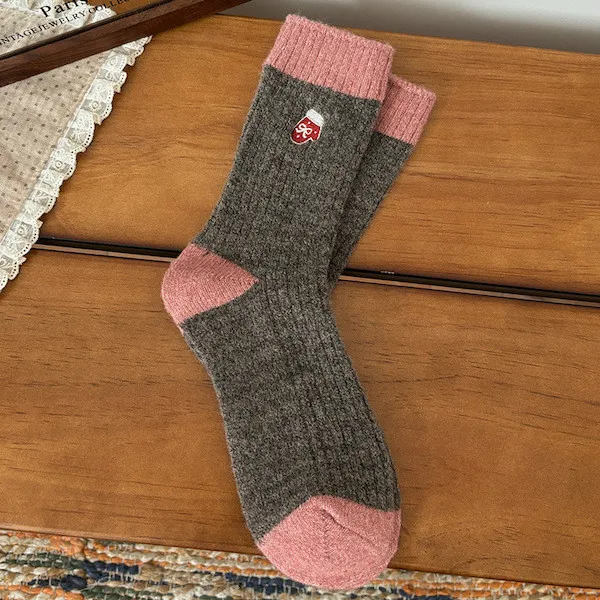 溫柔冬日 復古刺繡保暖羊毛中筒襪 6色