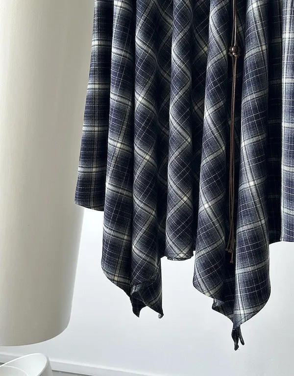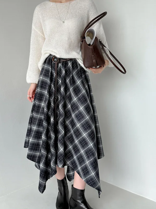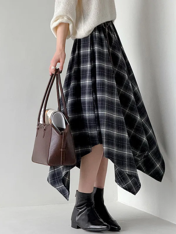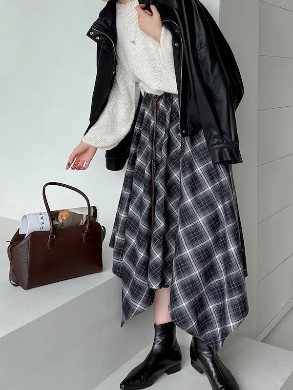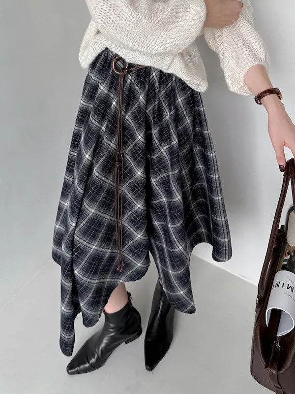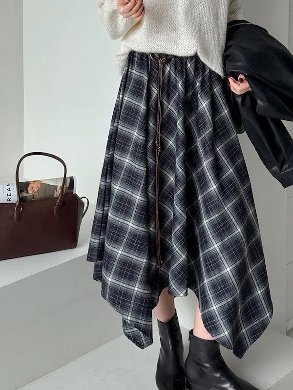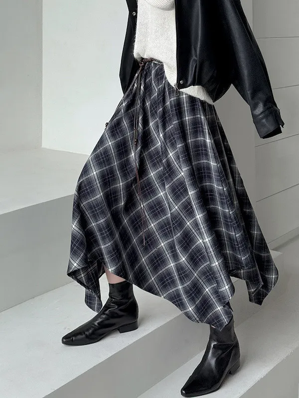 多變風格設計感格紋不規則傘擺長裙
