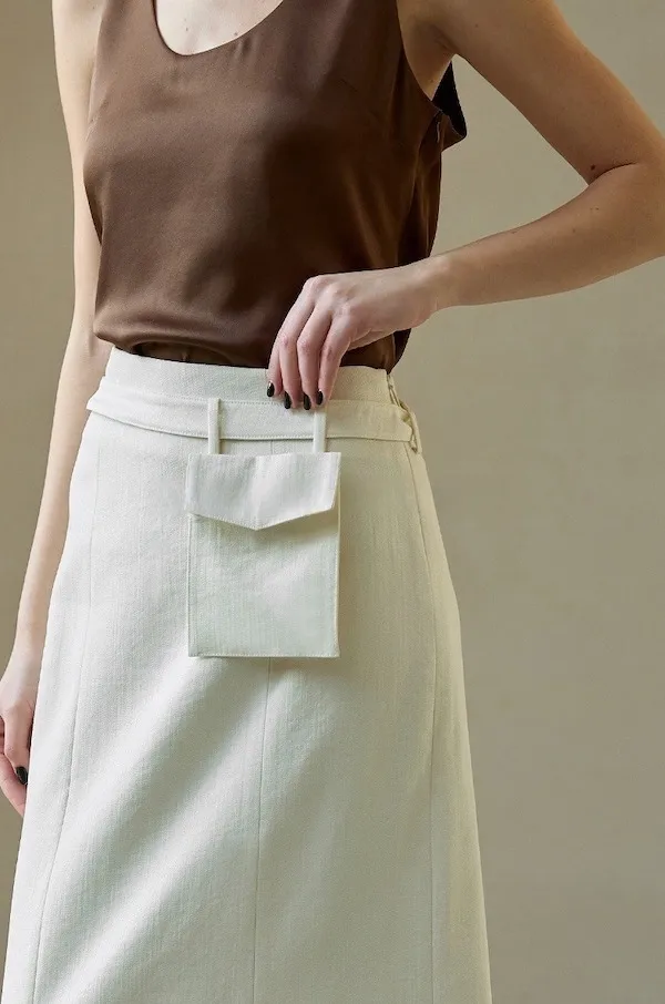搭配腰間的細節處理,與時髦的同色系繫帶袋子造型