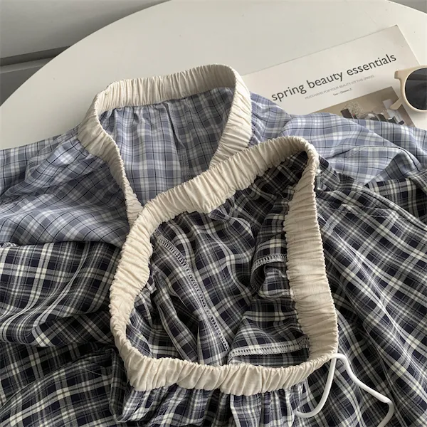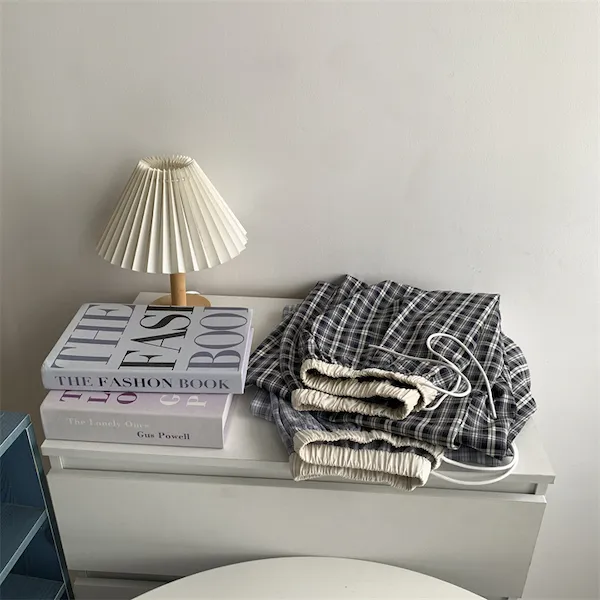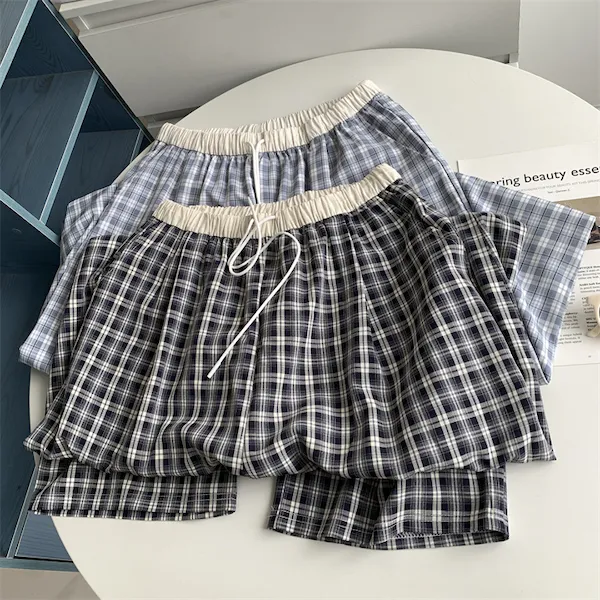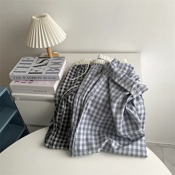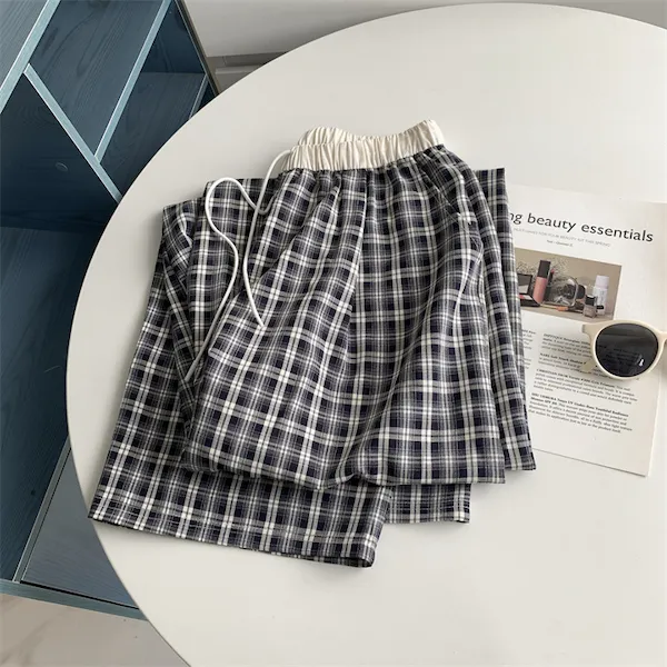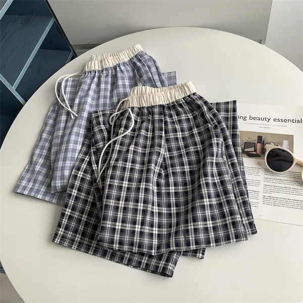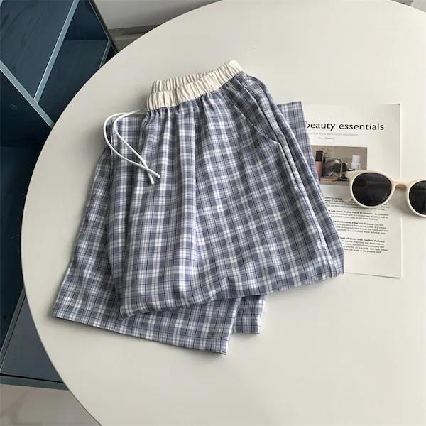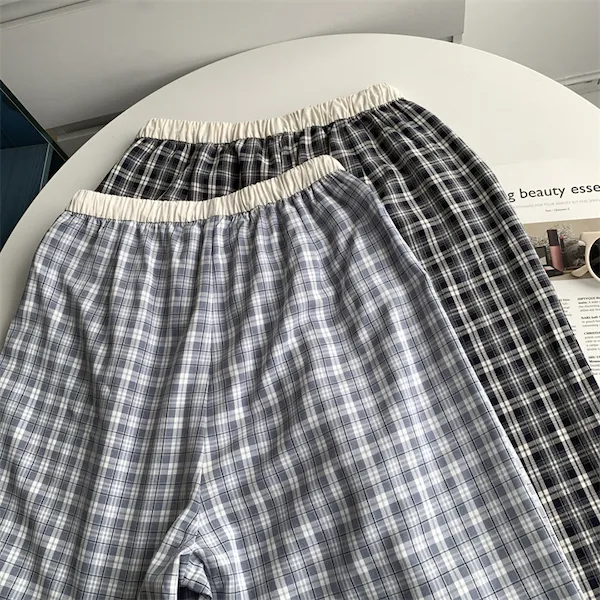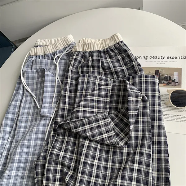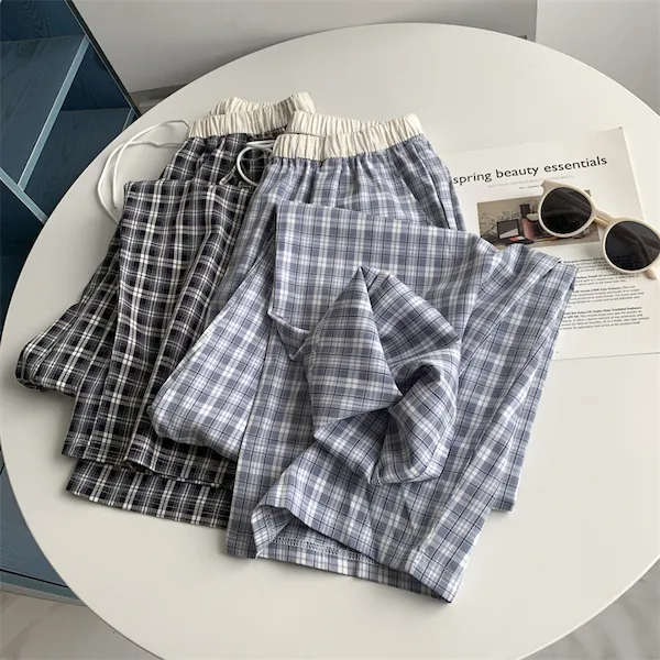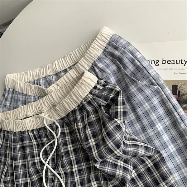 慵懶學院 拼接腰頭格子抽繩休閒長褲 2色