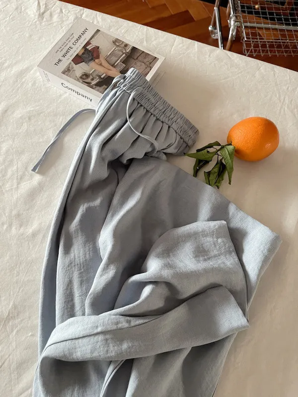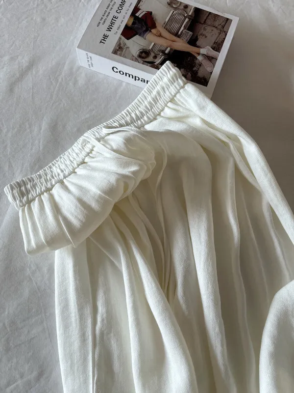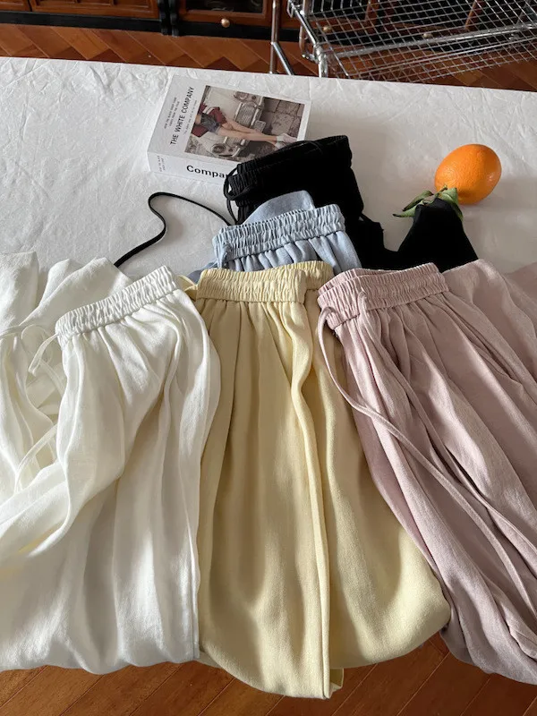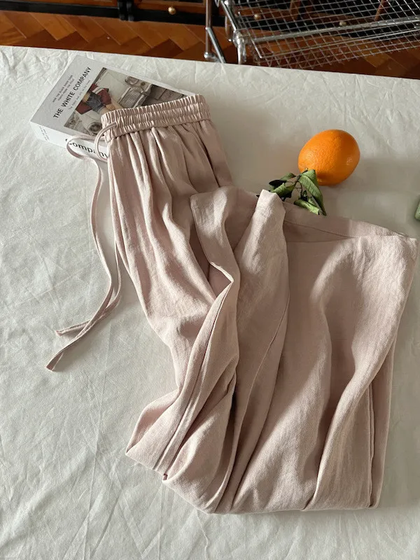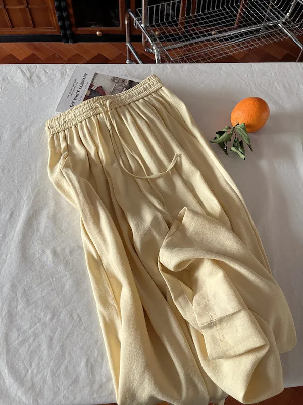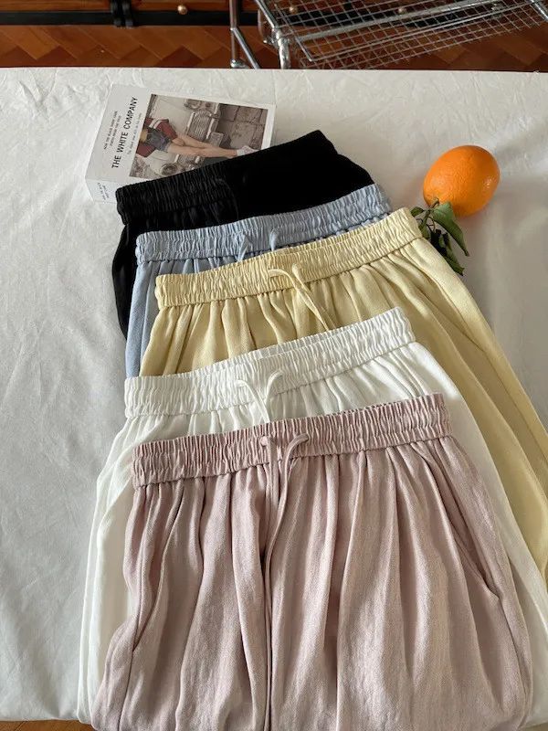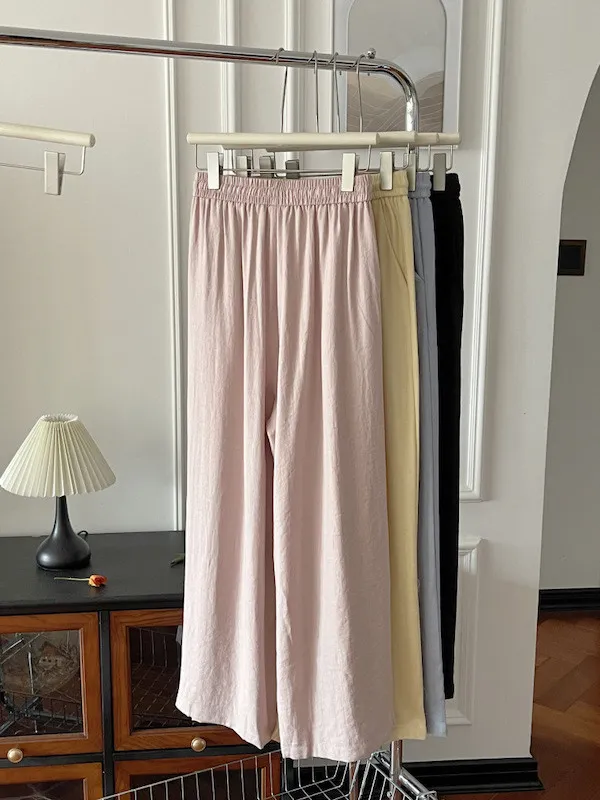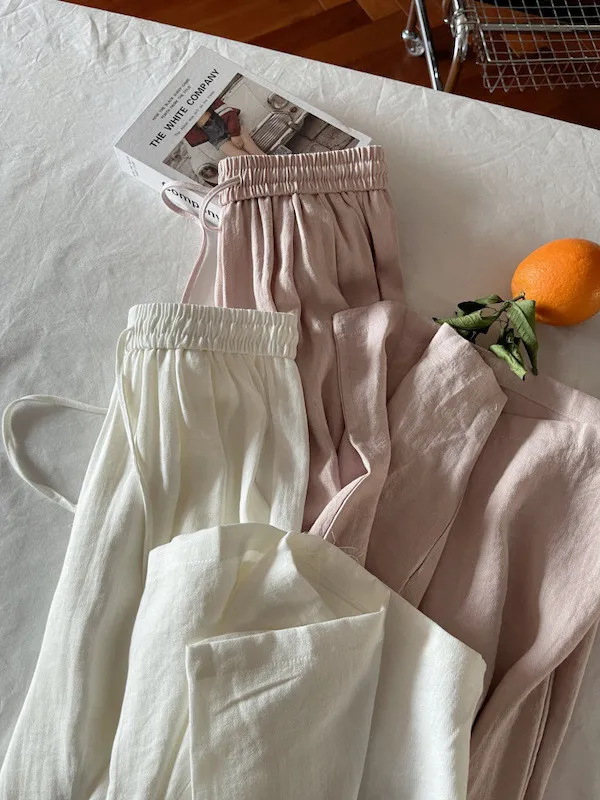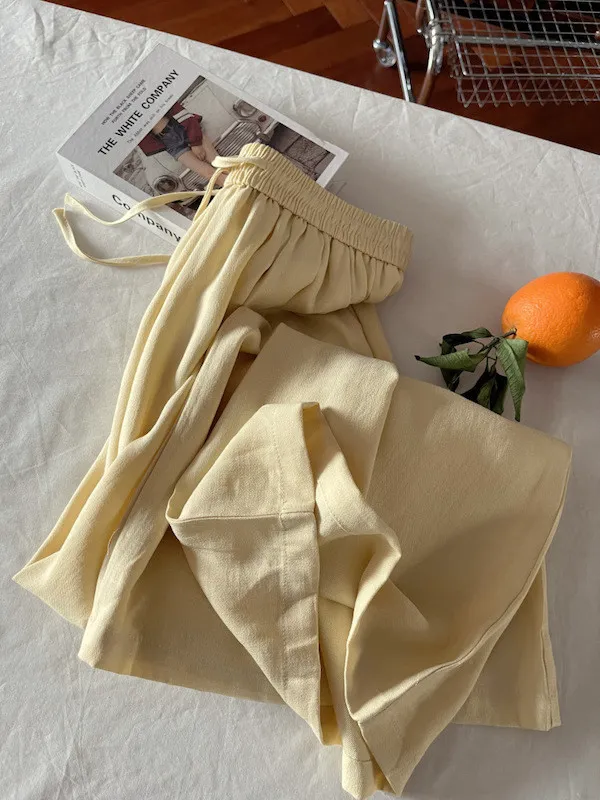 白色/粉色/鵝黃/霧籃/黑色 尺寸(公分) Free Size 腰圍 66-76 臀圍 144 大腿圍 62 褲長 101 ※尺寸為手工測量,誤差±3-5cm上下為合理範圍※ 材質 / 麻混紡,聚酯纖維