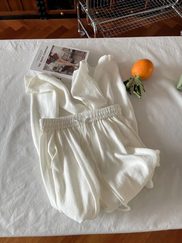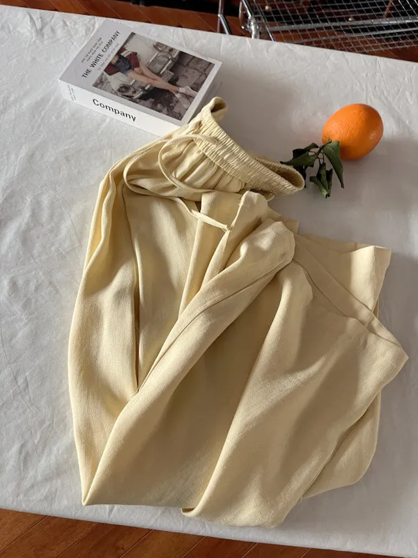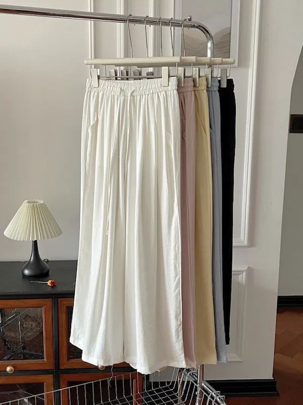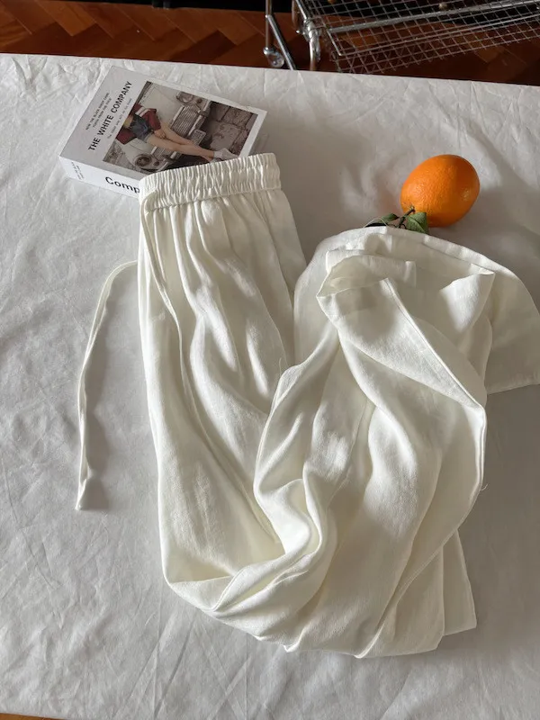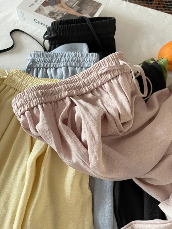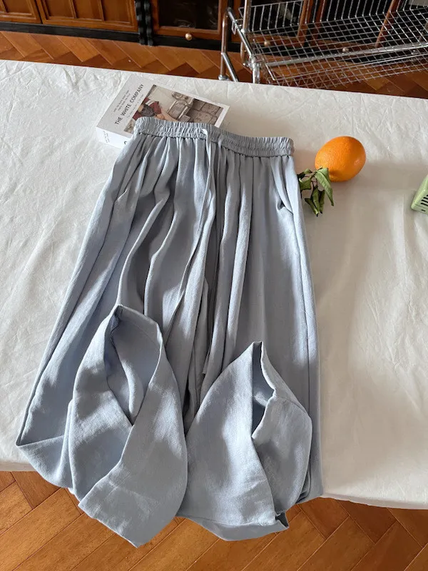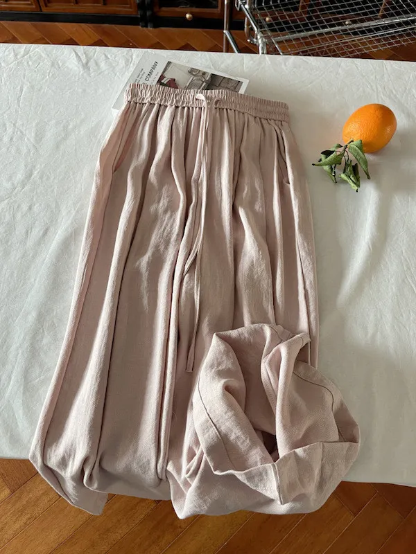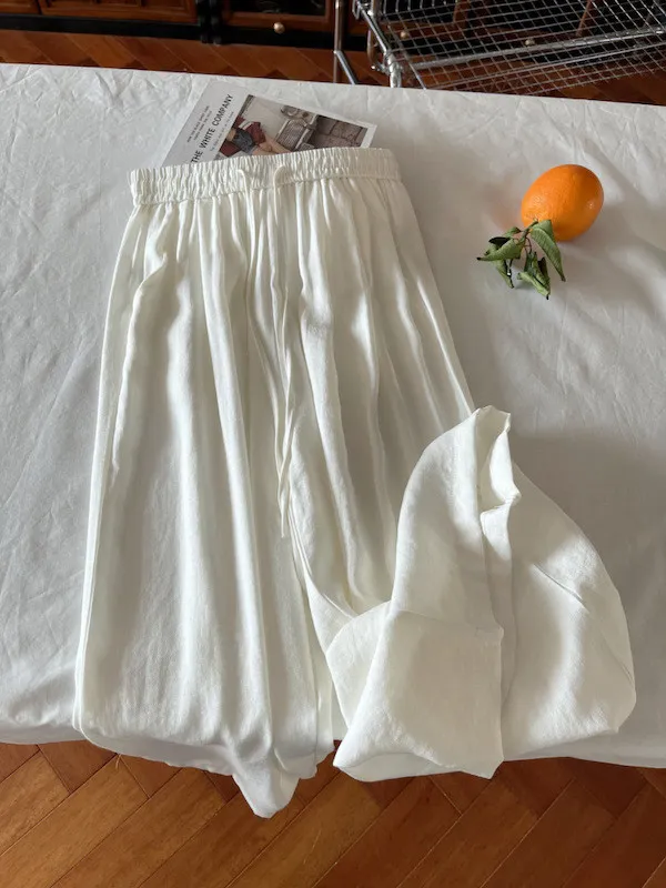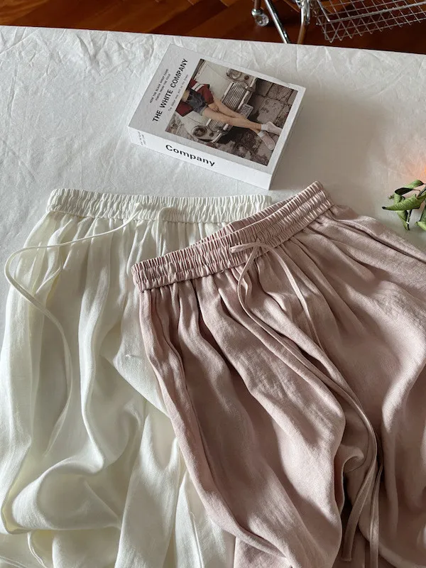 白色/粉色/鵝黃/霧籃/黑色 尺寸(公分) Free Size 腰圍 66-76 臀圍 144 大腿圍 62 褲長 101 ※尺寸為手工測量,誤差±3-5cm上下為合理範圍※ 材質 / 麻混紡,聚酯纖維