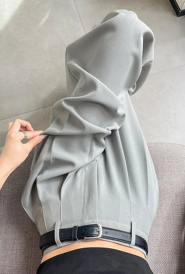 灰色/杏色/黑色 尺寸(公分) M L XL 腰圍 66 70 74 臀圍 98 102 106 大腿圍 60 62 64 褲長 99 100 101 ※尺寸為手工測量,誤差±3-5cm上下為合理範圍※ 材質 / 西裝布料(棉,聚酯纖維混紡)
