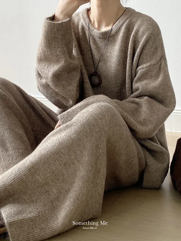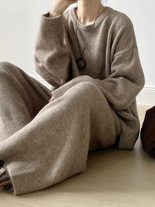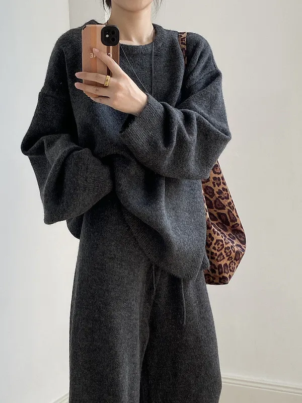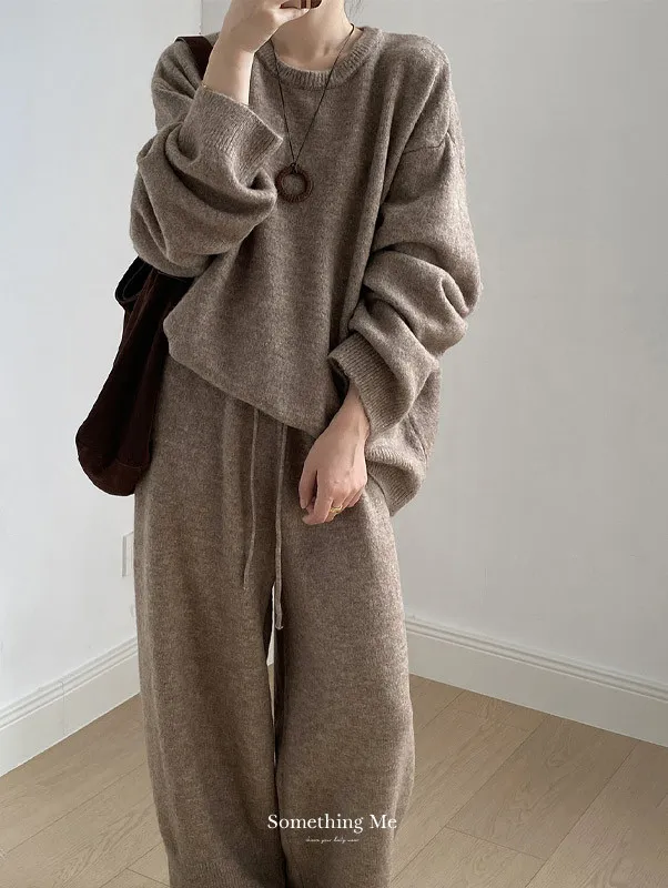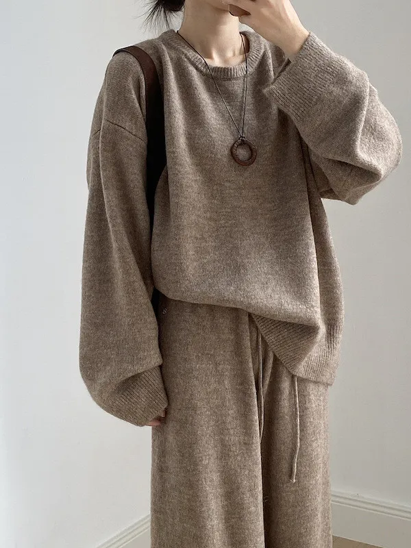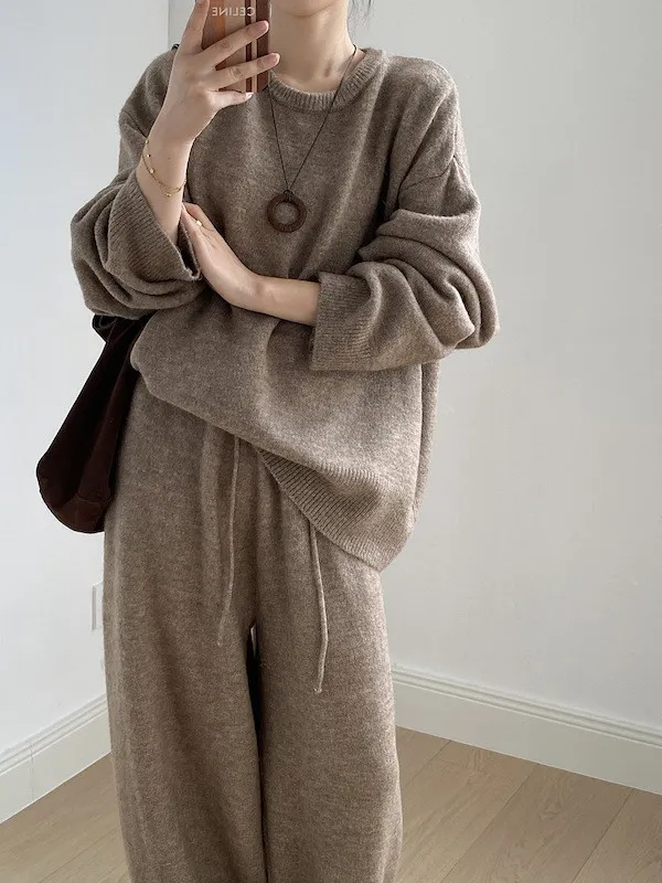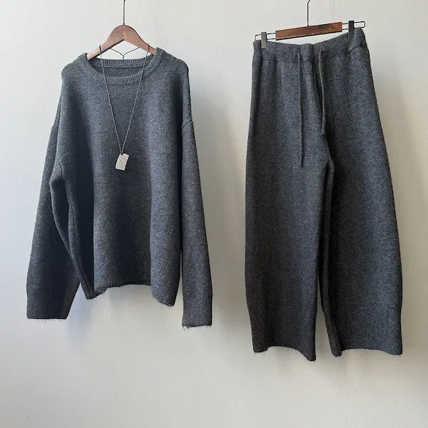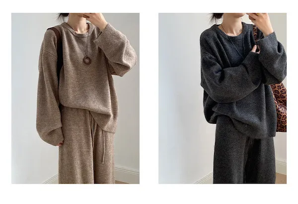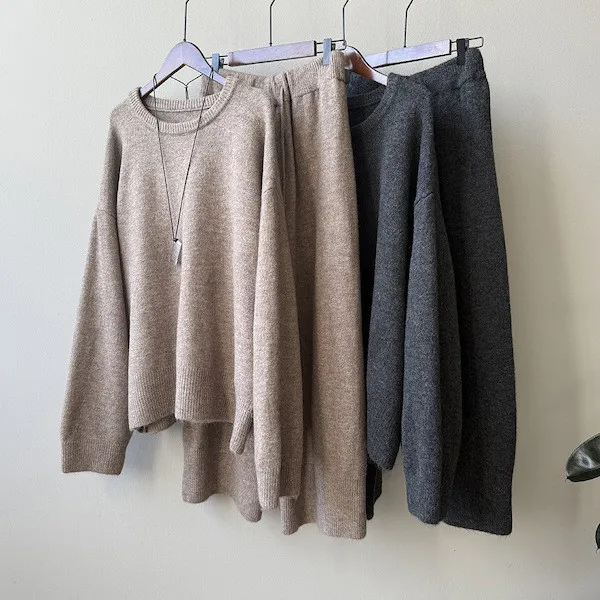 慵懶落肩 垂墜鬆感針織毛衣套裝(毛衣+長褲) 2色
