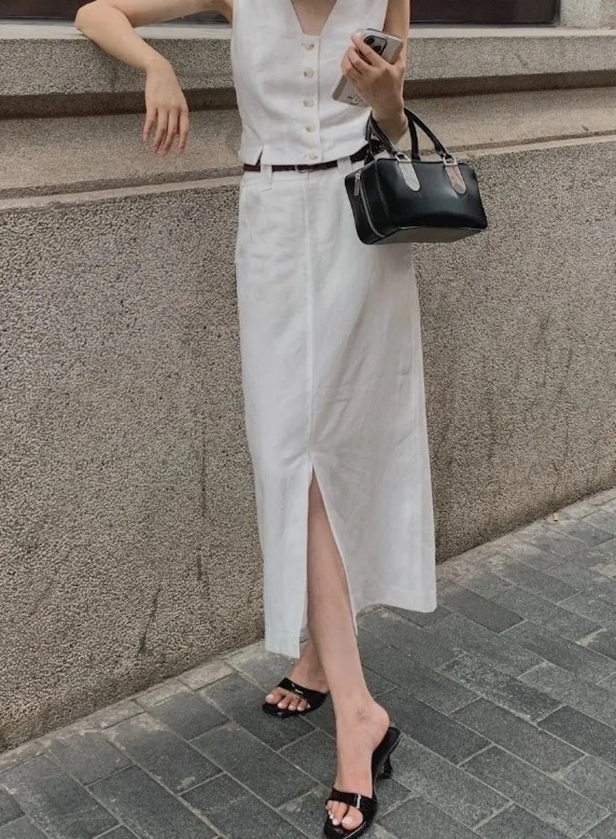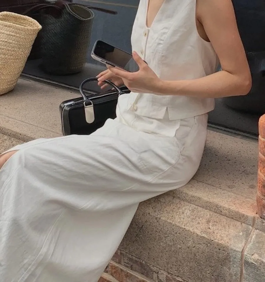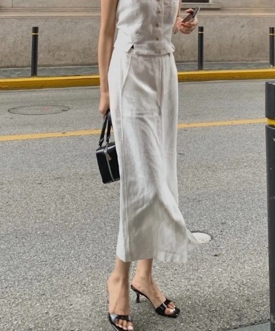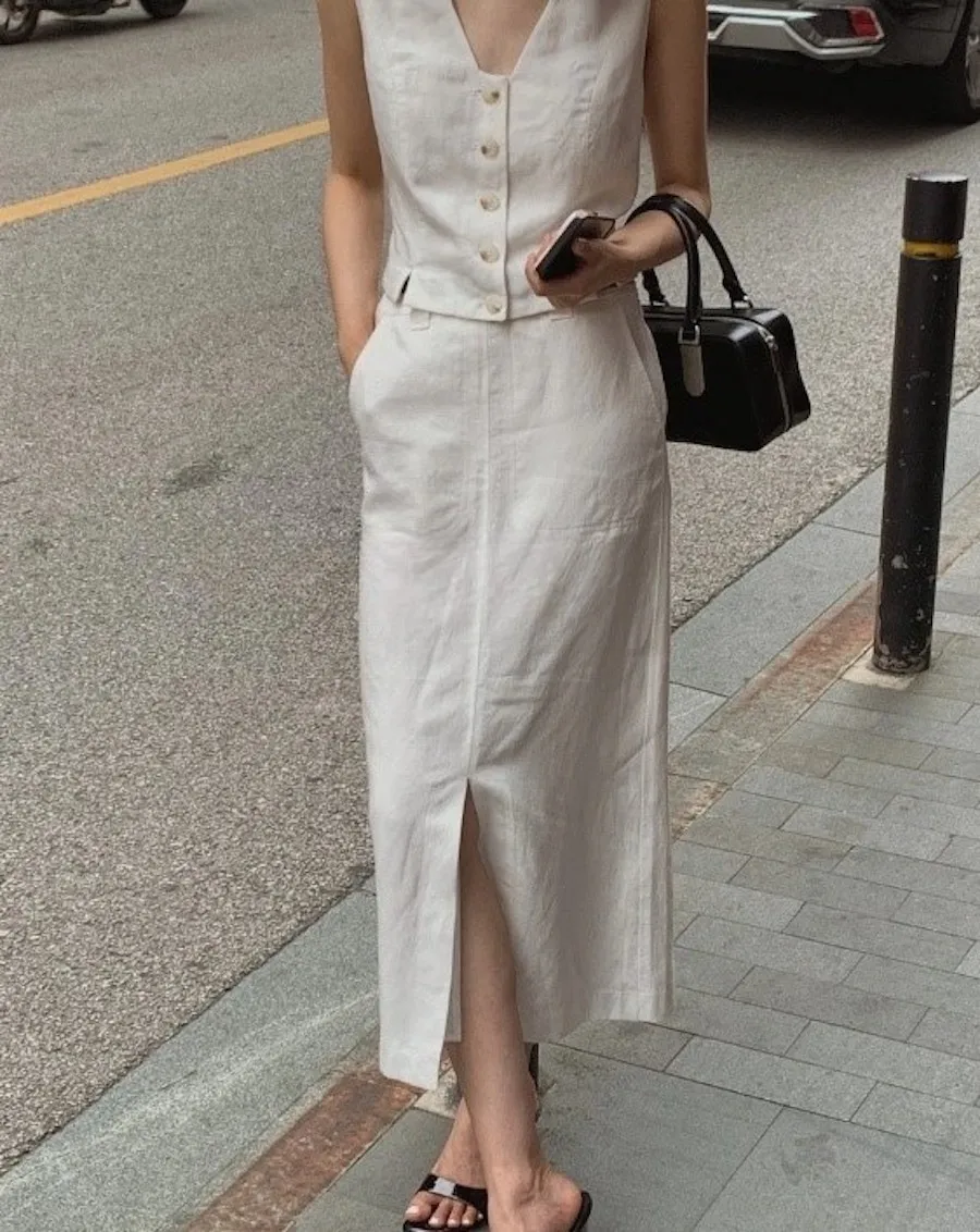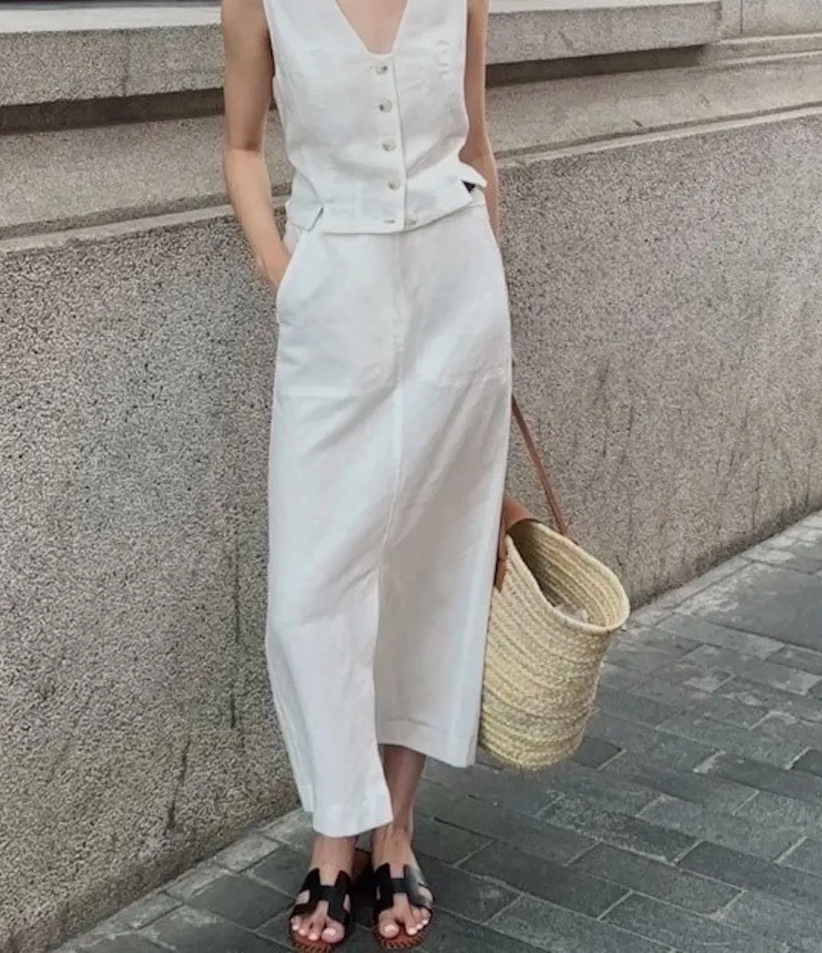 JF240527 老錢渡假感~亞麻西裝背心套裝 白色長裙