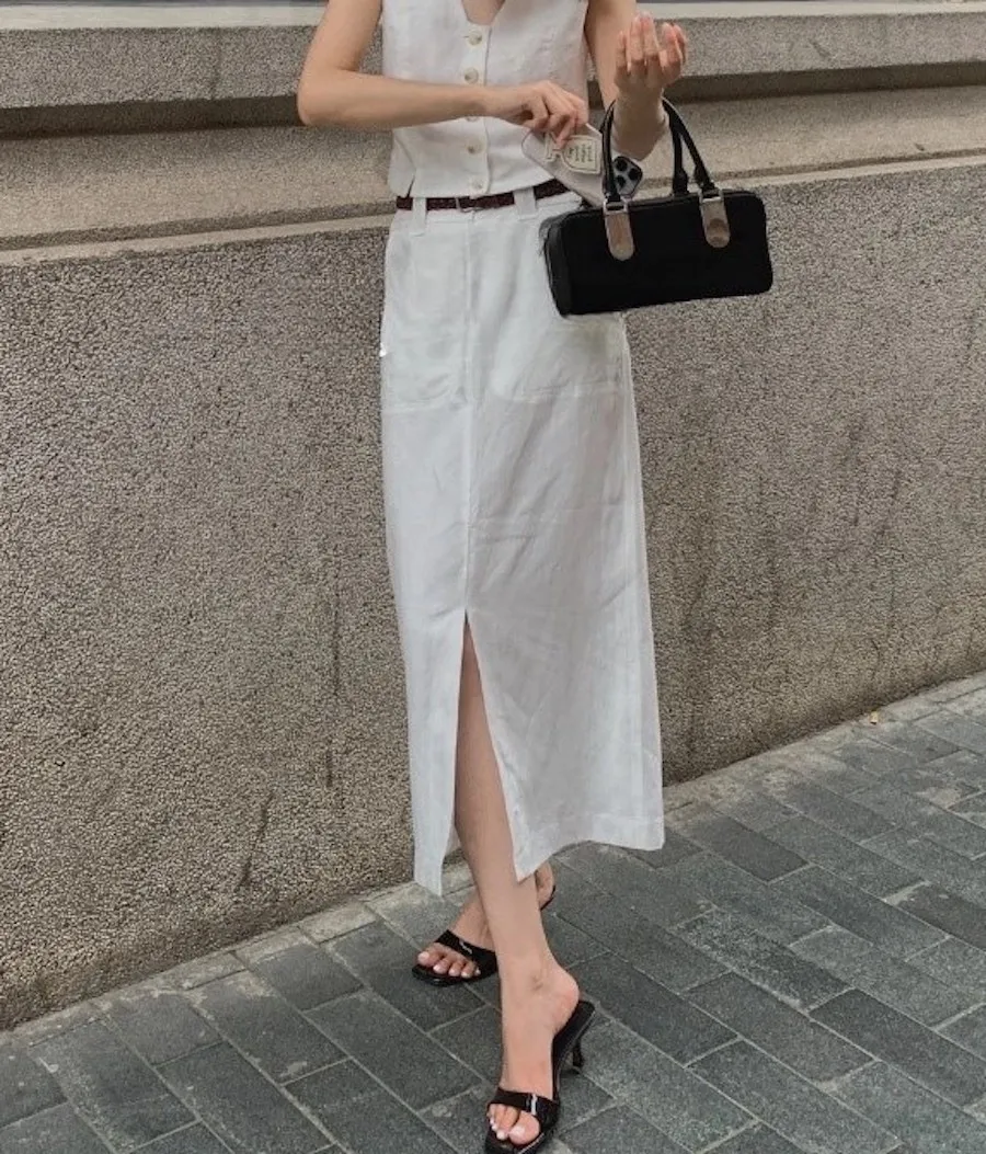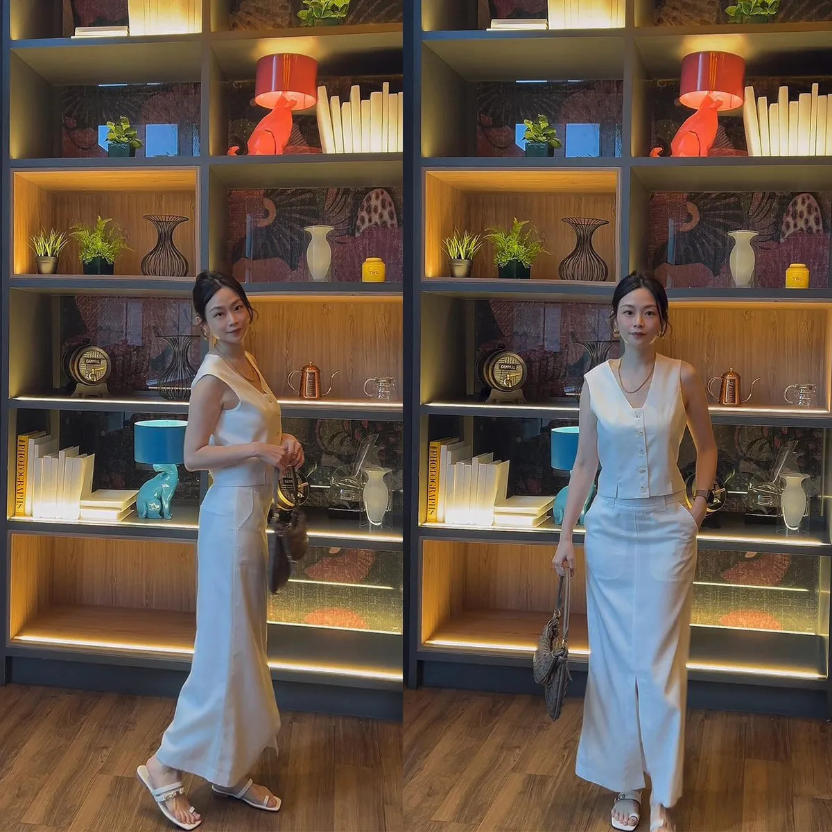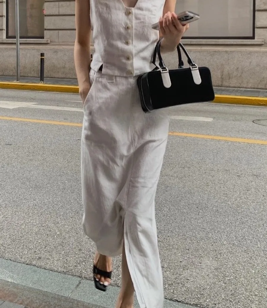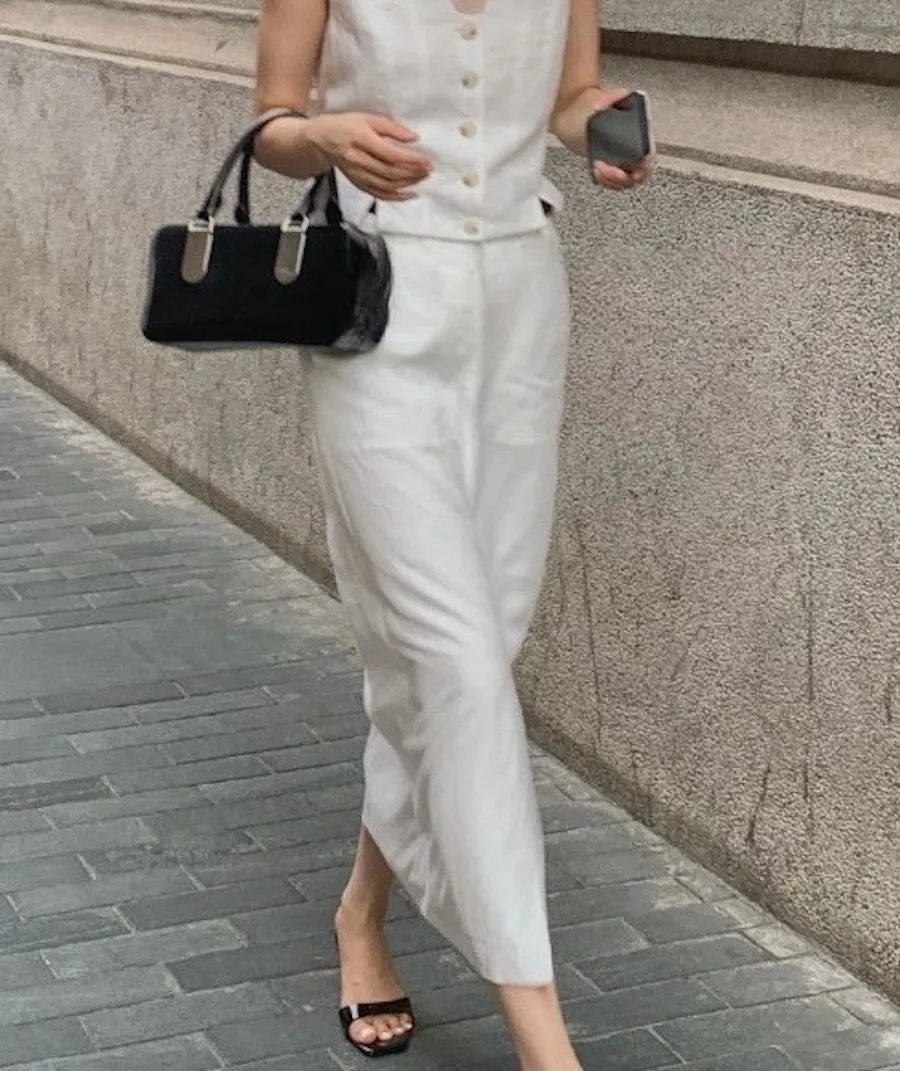 JF240527 老錢渡假感~亞麻西裝背心套裝 白色長裙