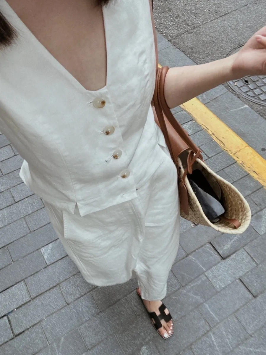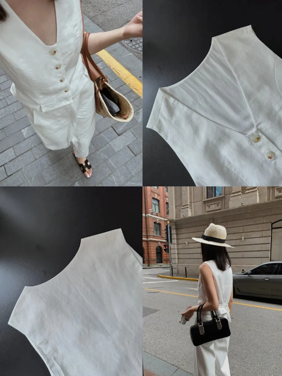 JF240527 老錢渡假感~亞麻西裝背心套裝 白色背心