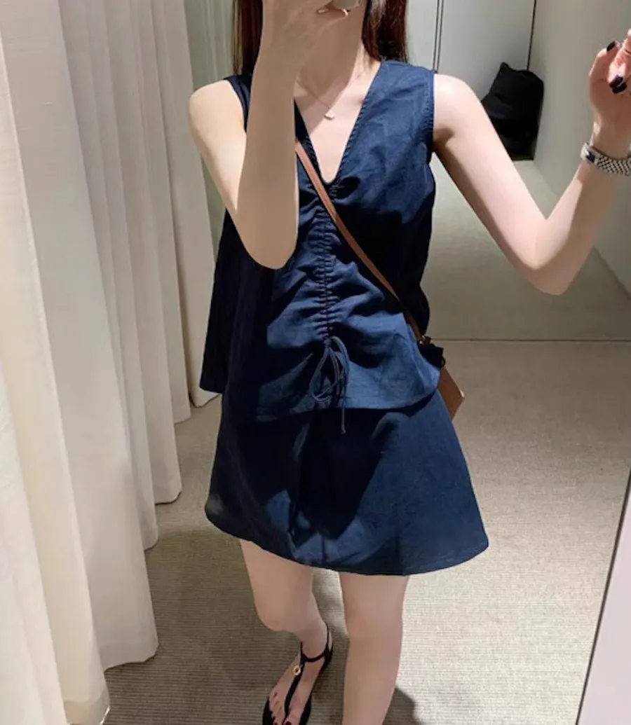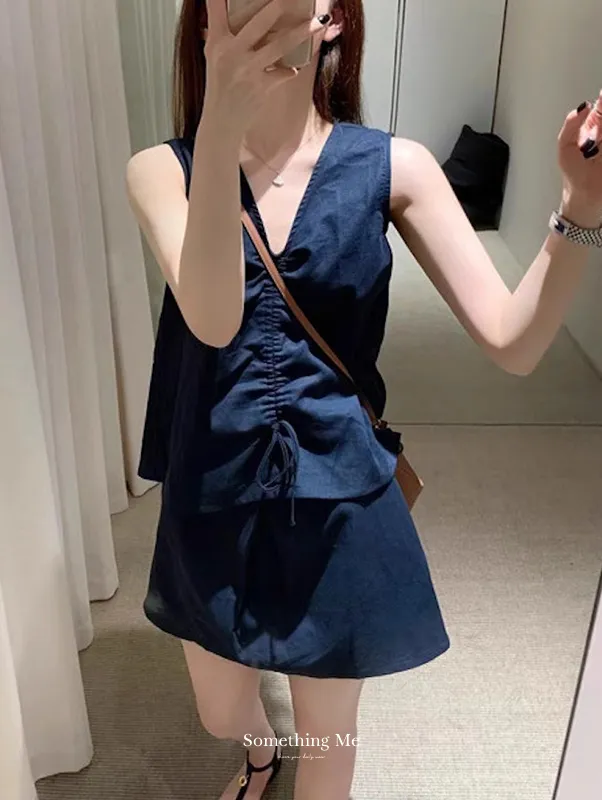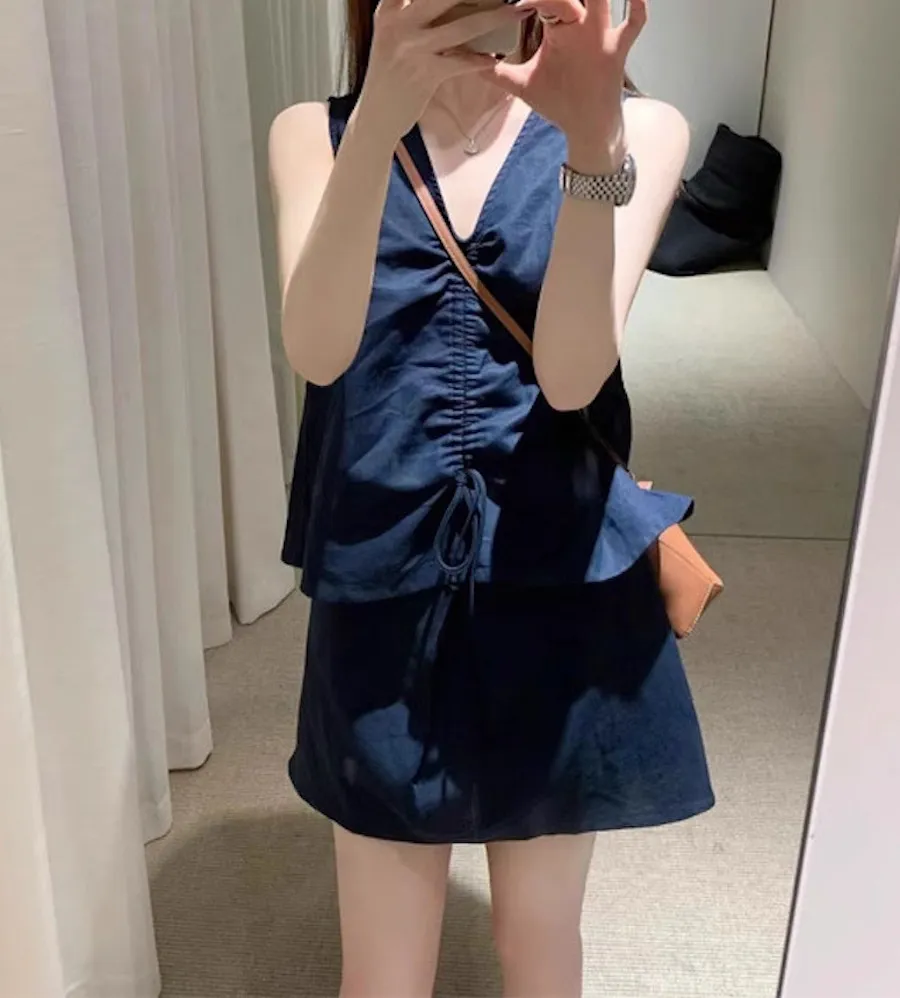 絕美藏藍抽皺同色系套組(背心+短褲裙)