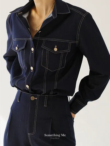 老錢風~深藍色調麻質背心套裝