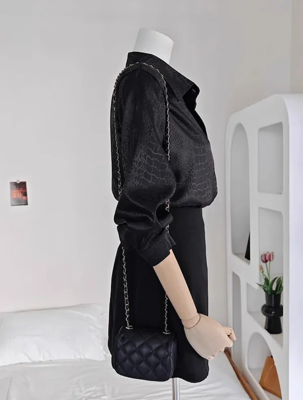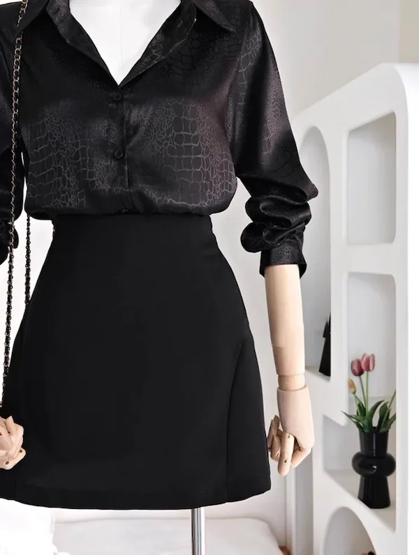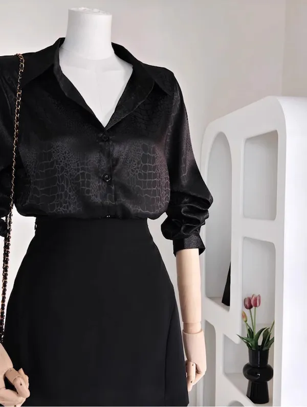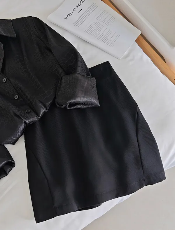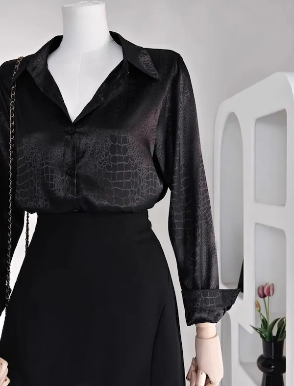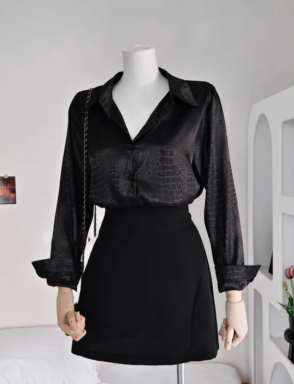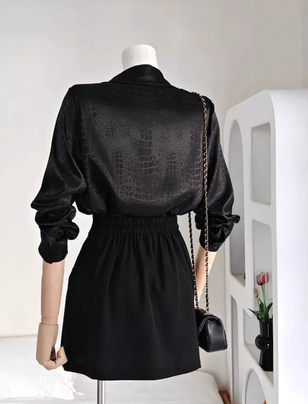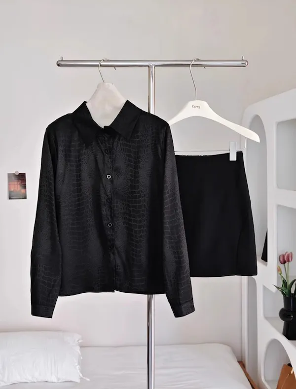 午夜星辰.鱷魚紋緞面襯衫短裙套裝