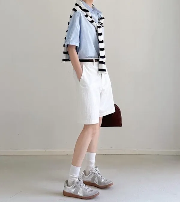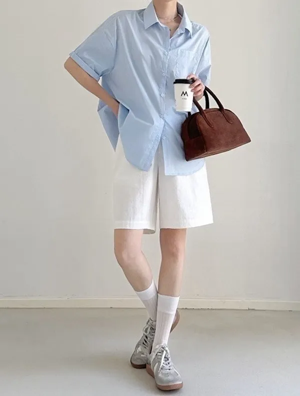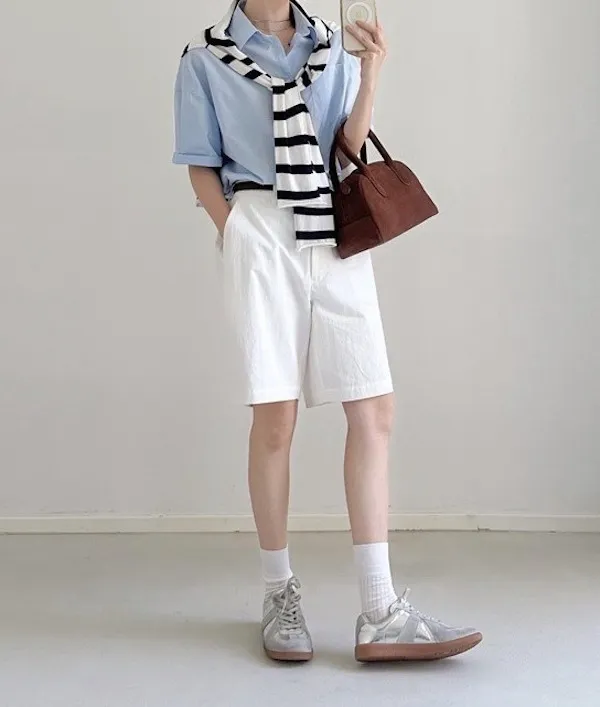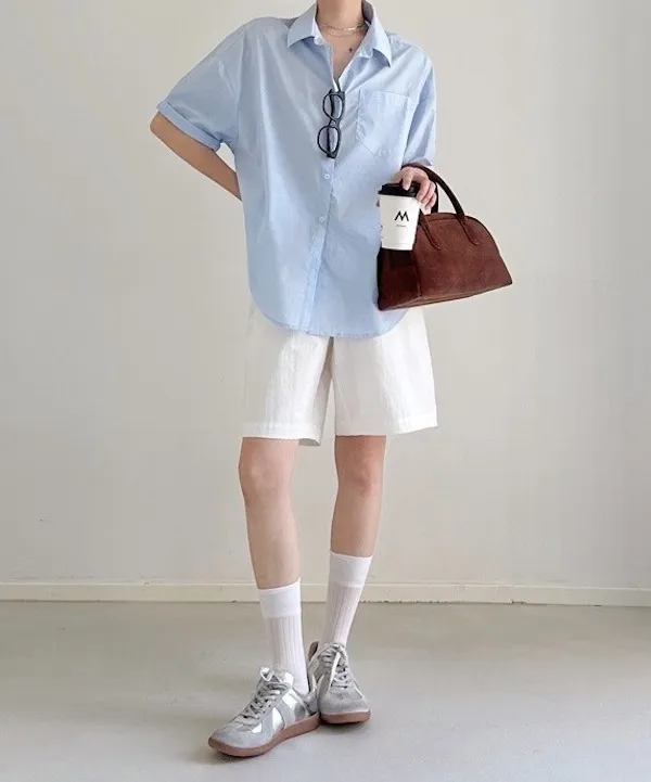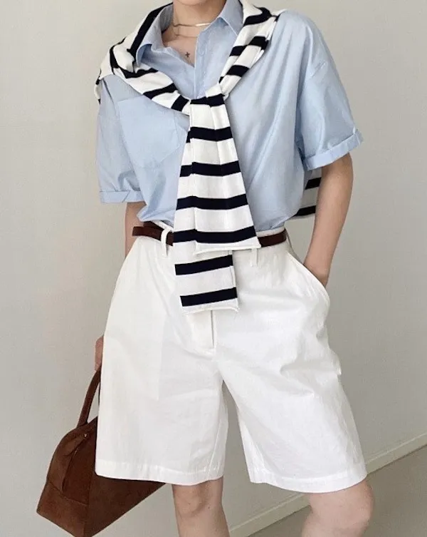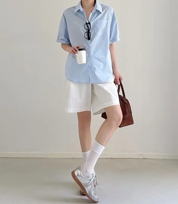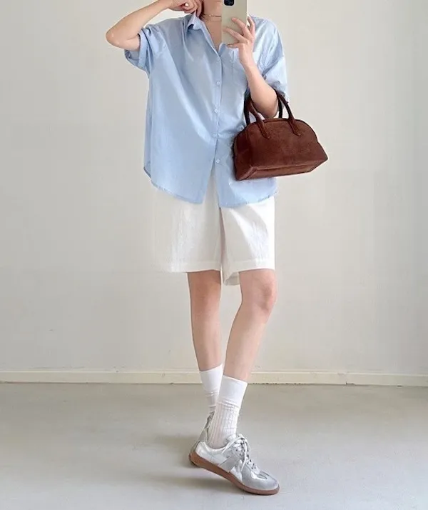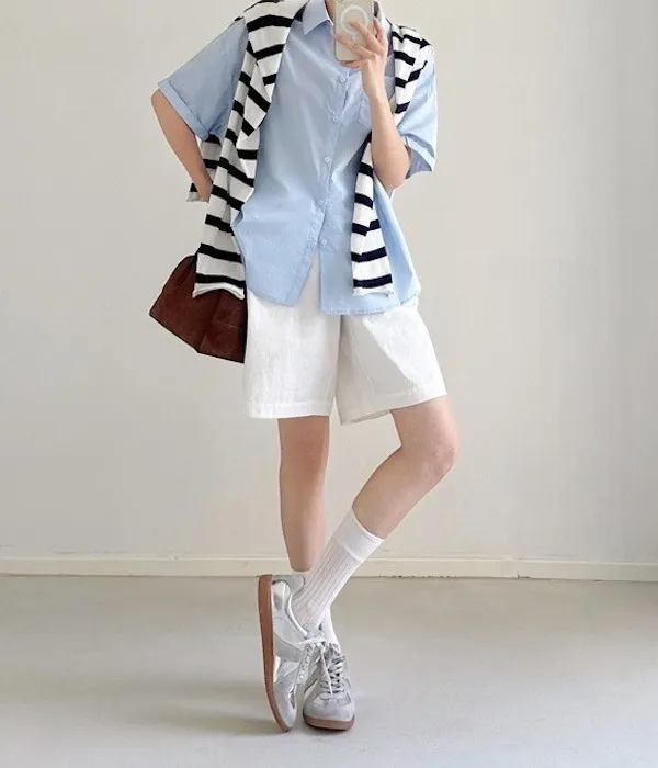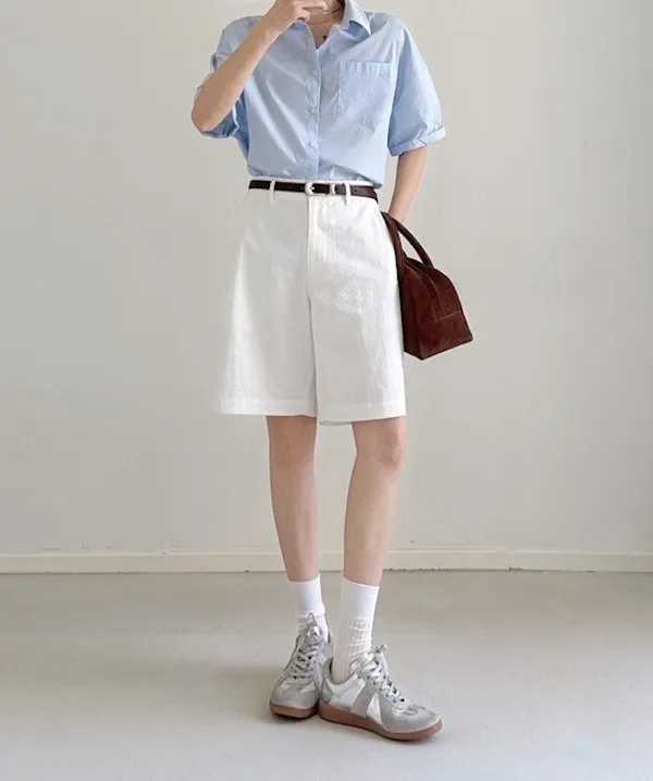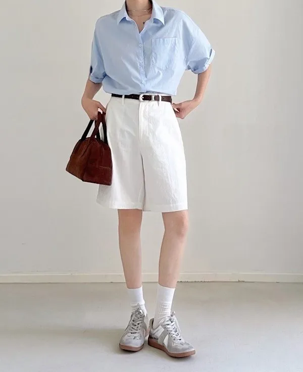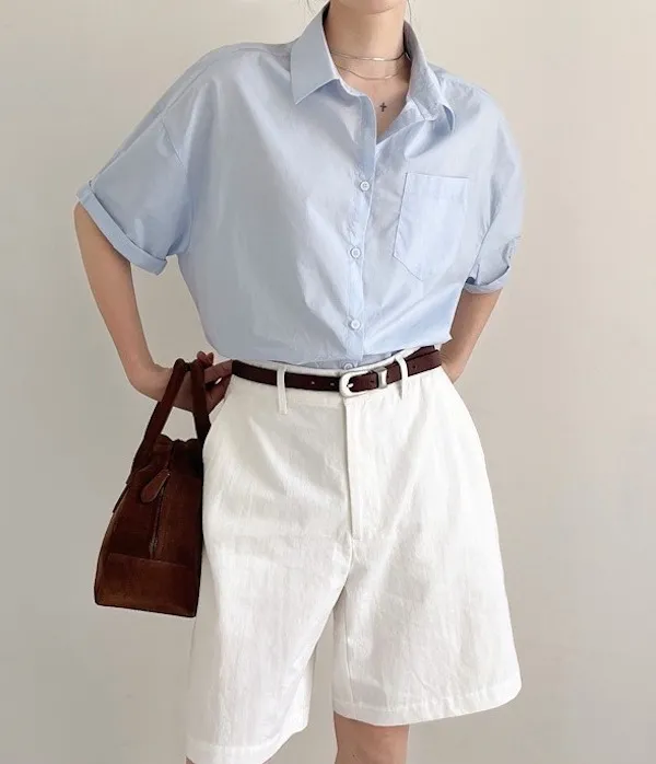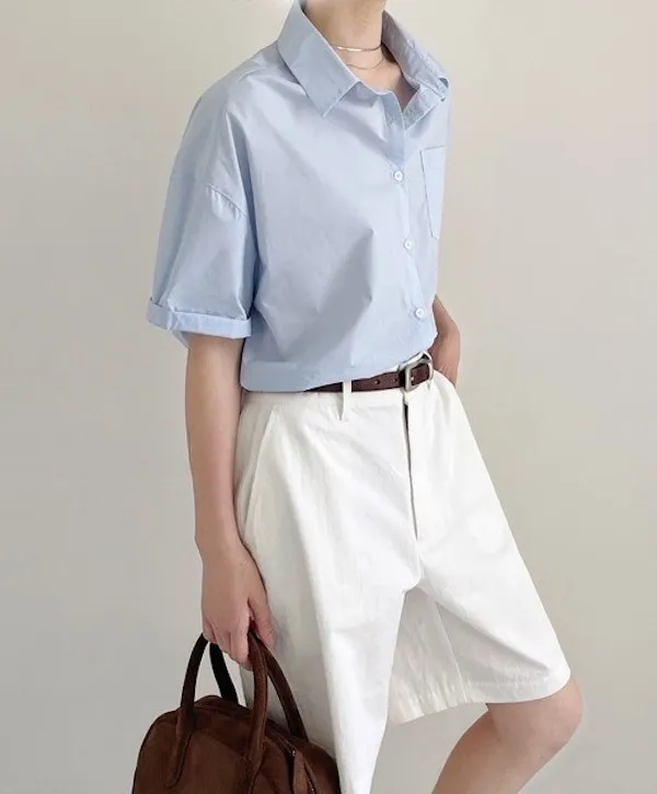 淺藍襯衫搭配純白短褲,穿上立刻變身清爽少年感