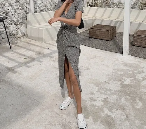 V領設計配上腰間的扭結,整個人看起來特別有曲線