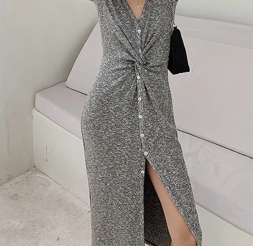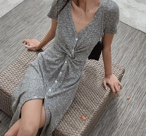 池畔夕陽 法式V領扭結開叉針織洋裝