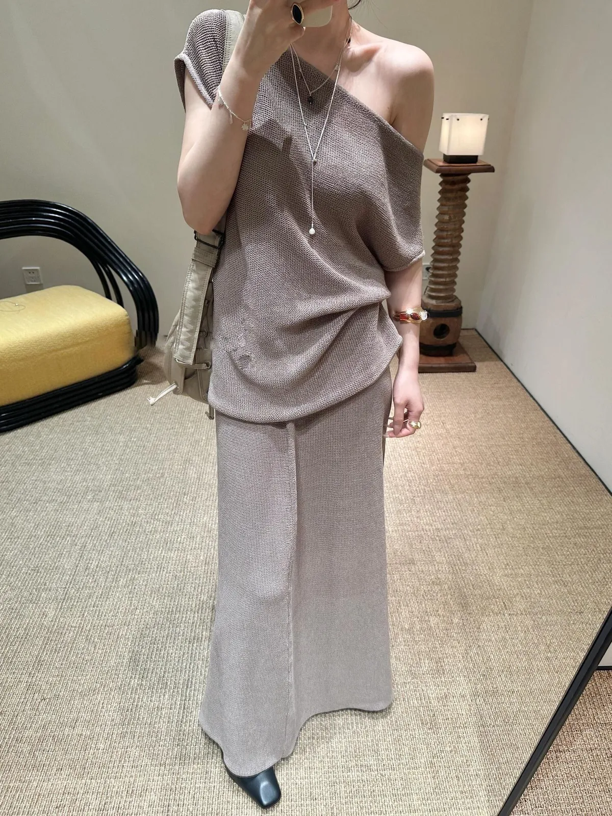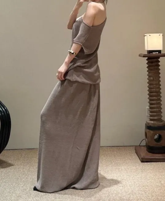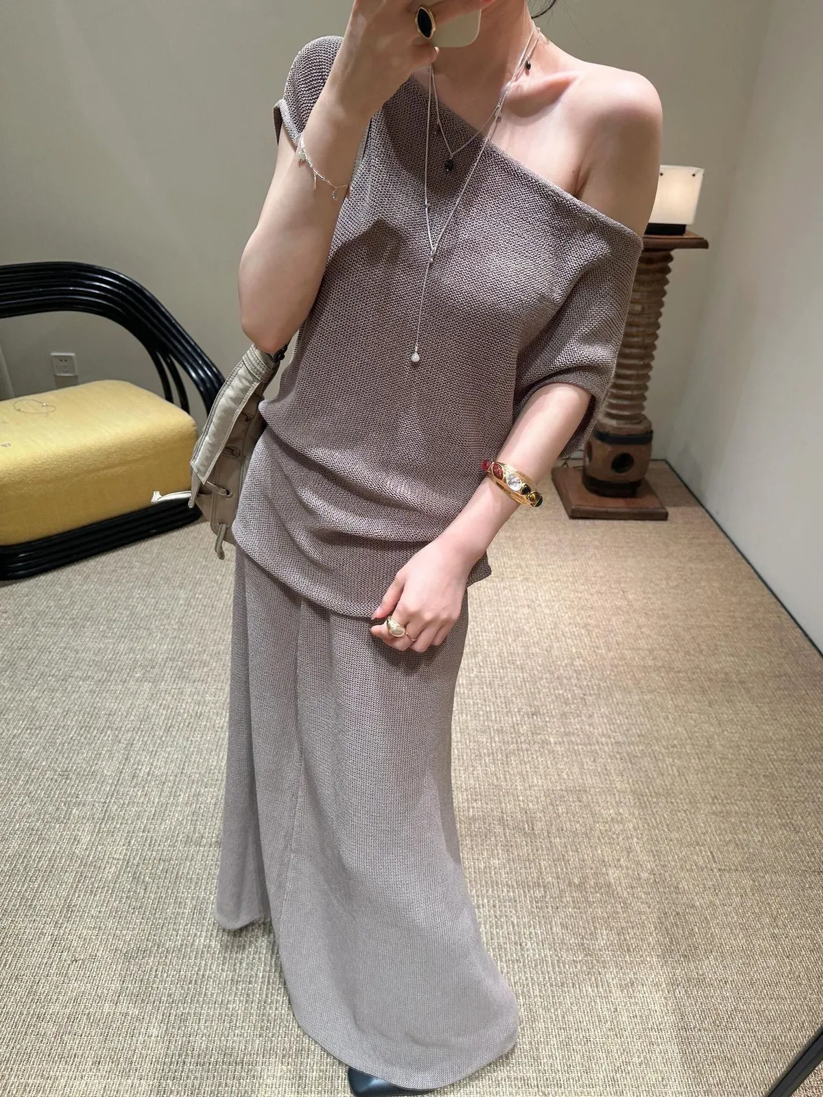 慵懶設計感斜肩針織套裝(上衣+長裙)