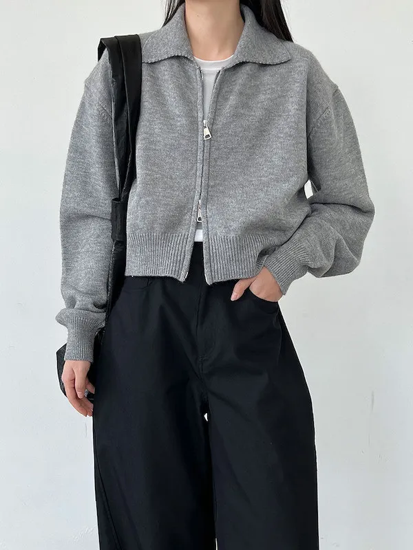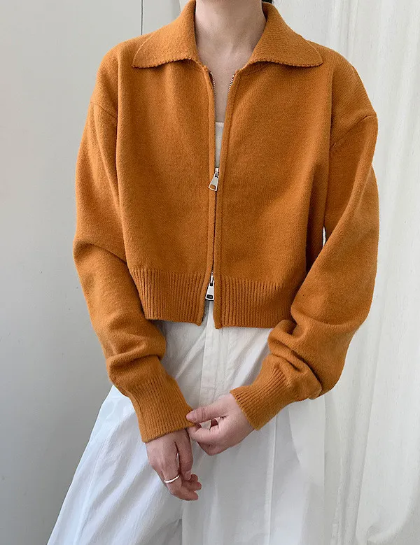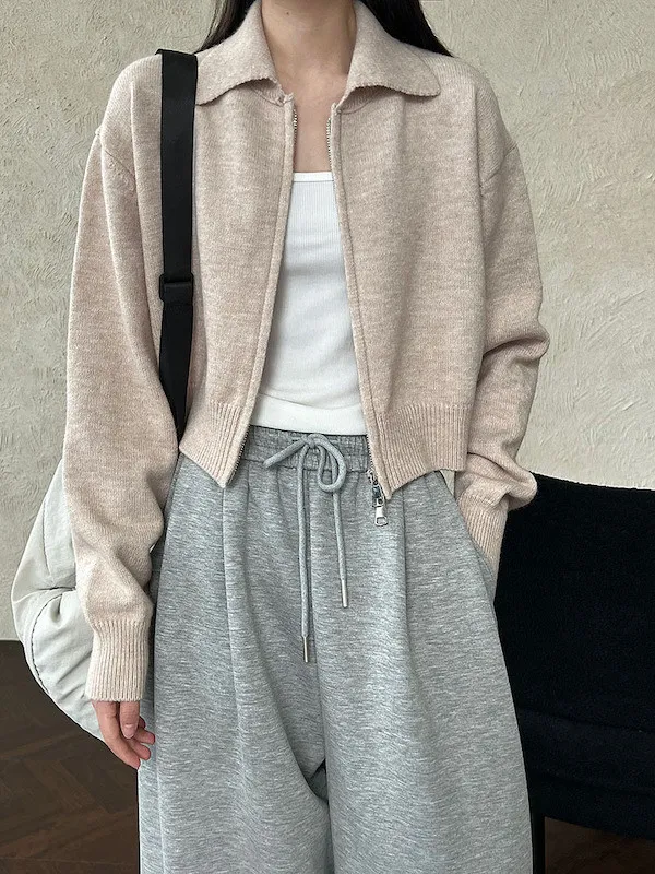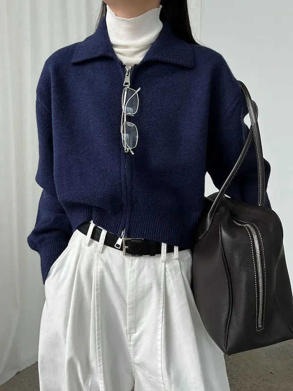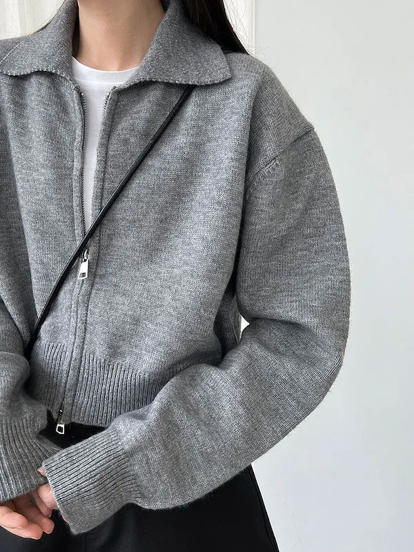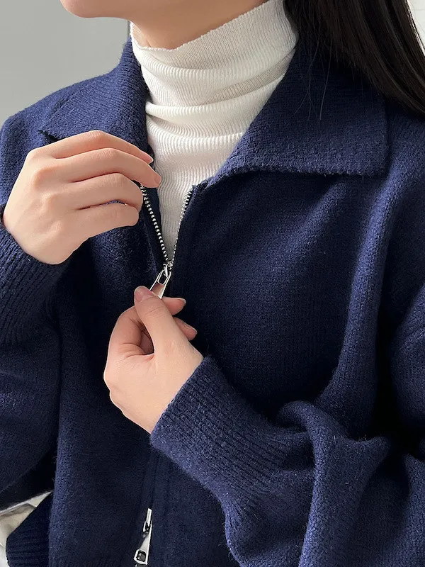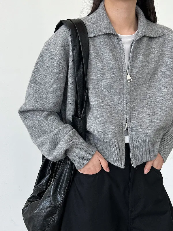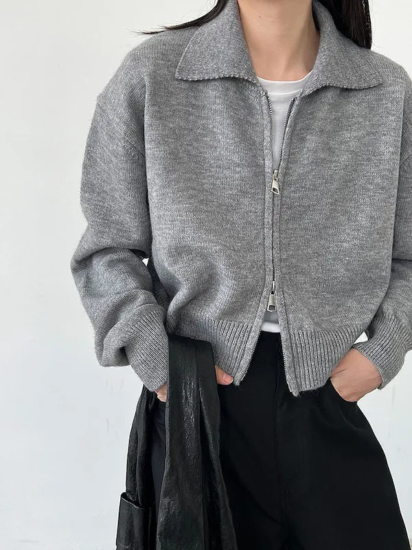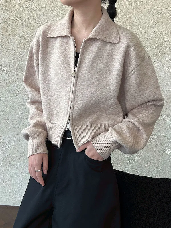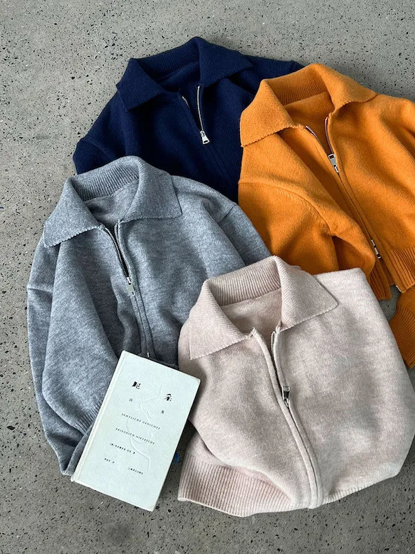 秋日溫柔感~雙拉鍊針織Polo開衫外套 4色