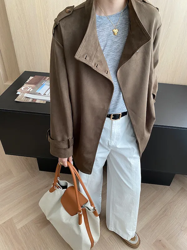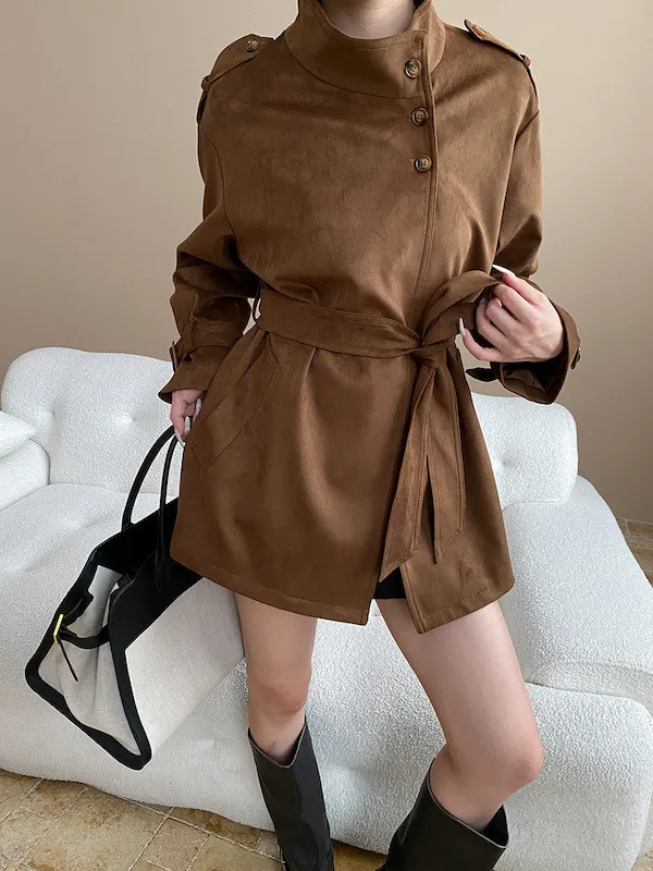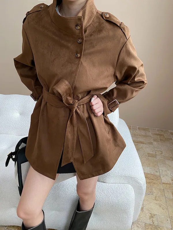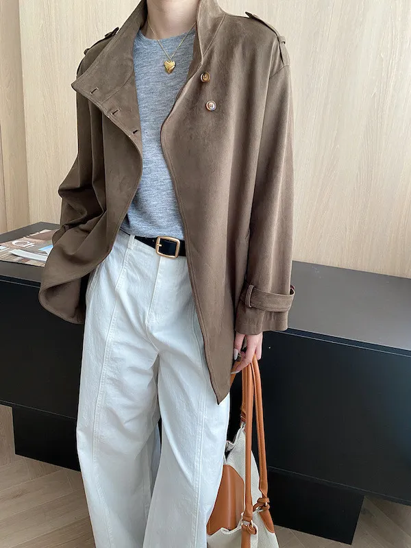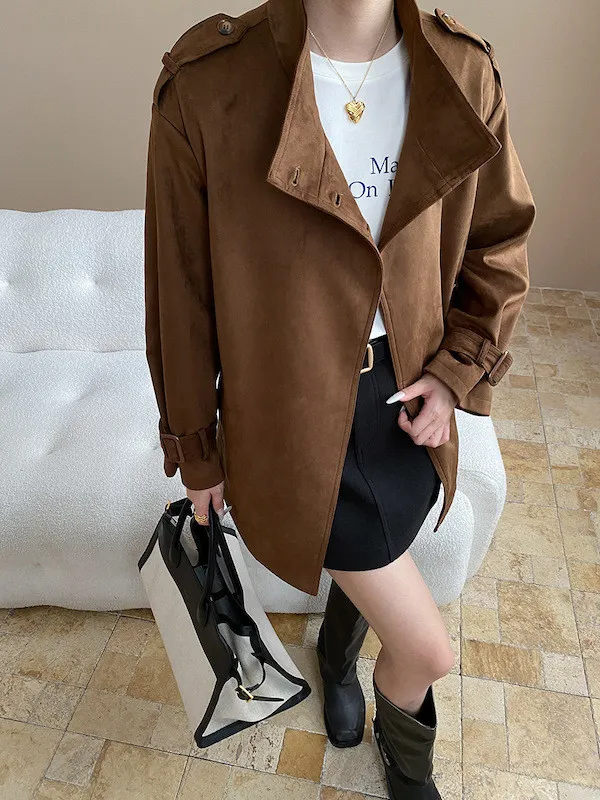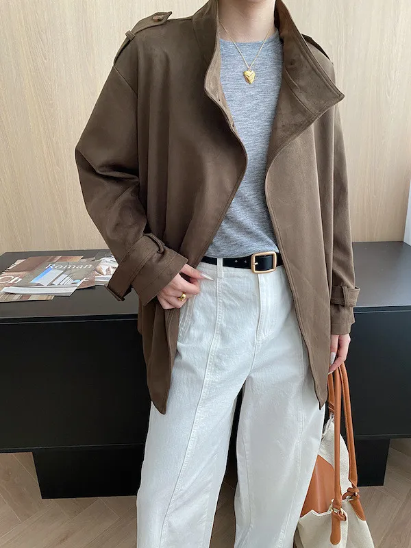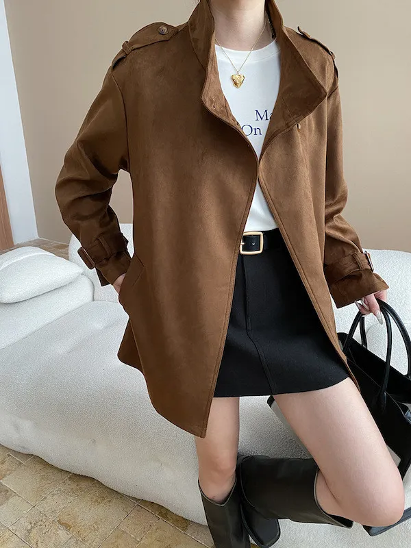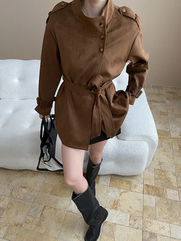 英倫氣質 仿麂皮絨立領收腰風衣外套 2色