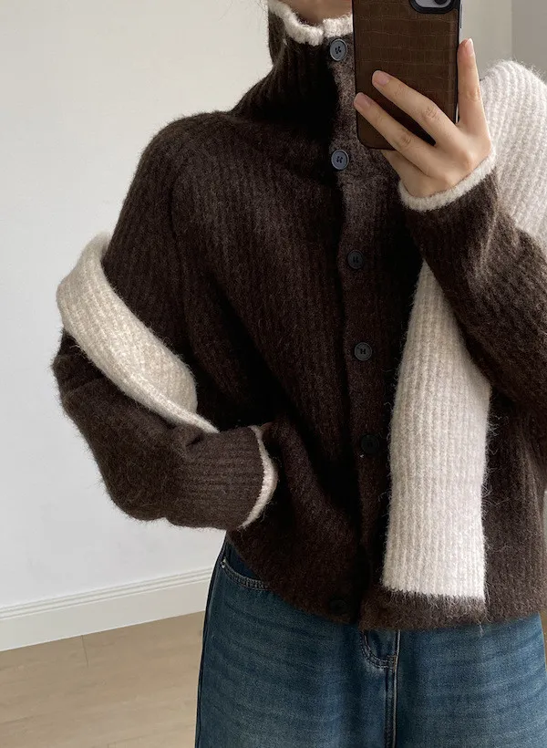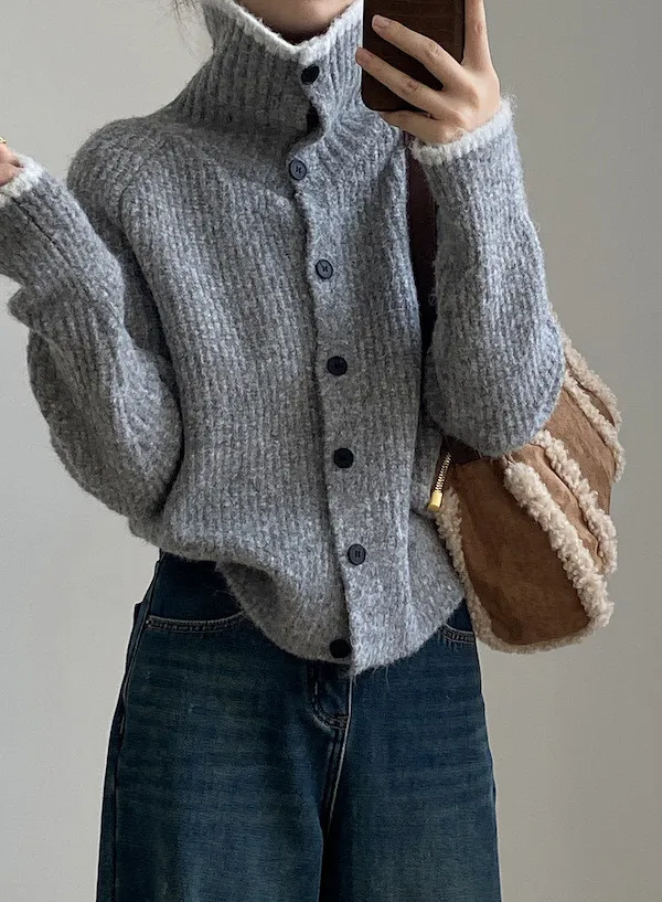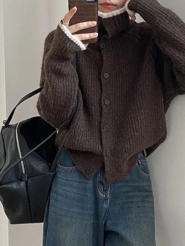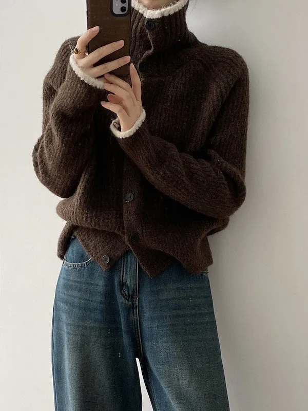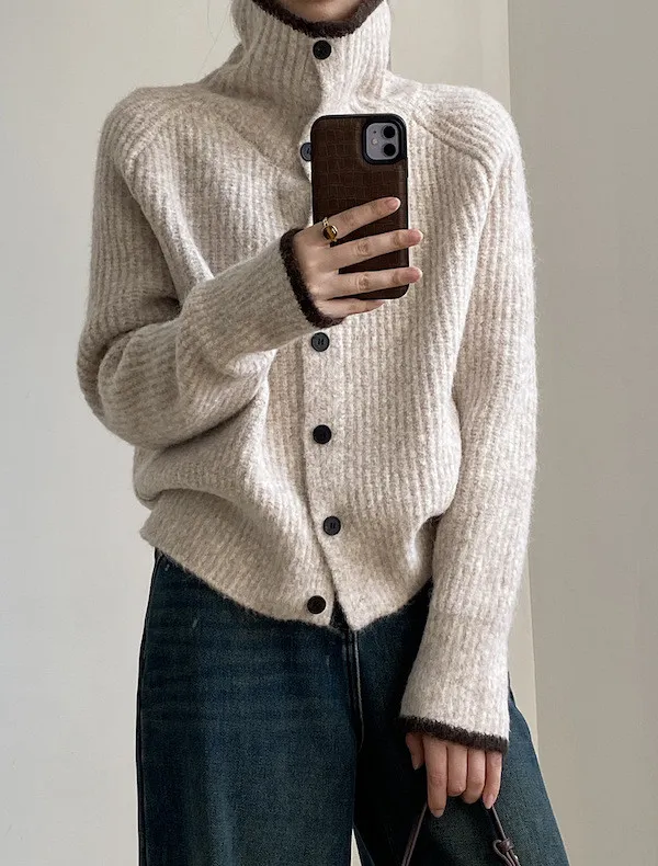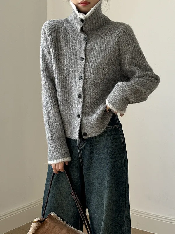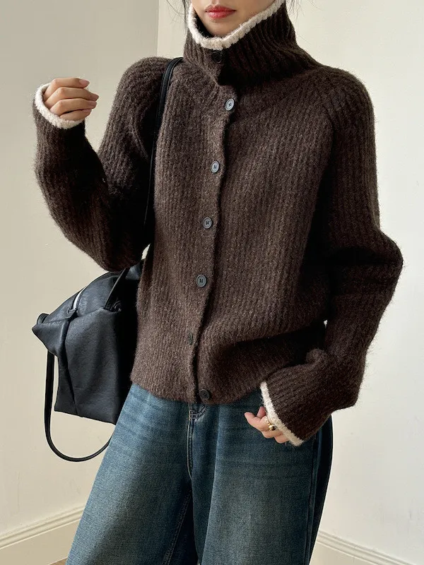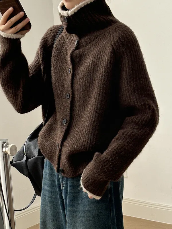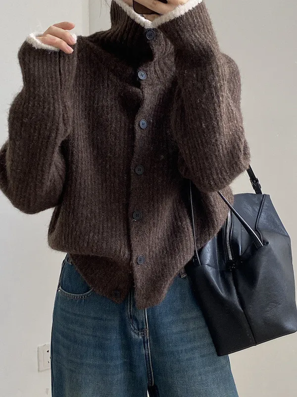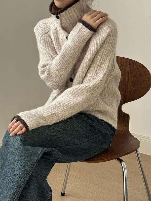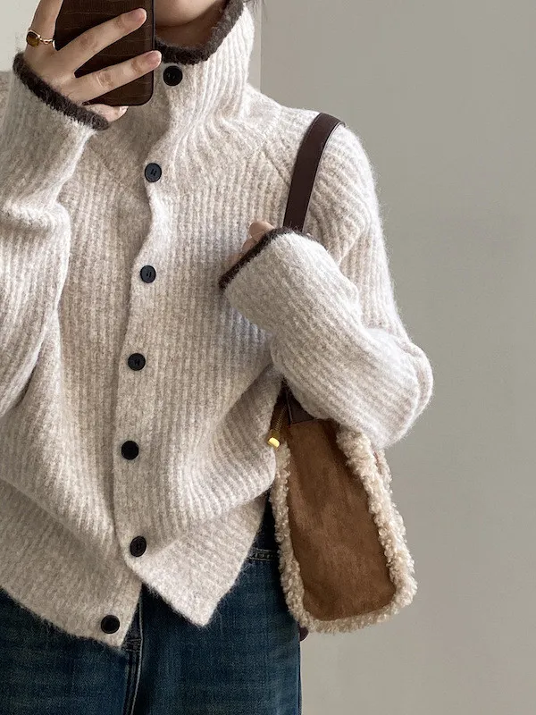 柔感絮語 撞色翻領單排扣針織毛衣外套 4色