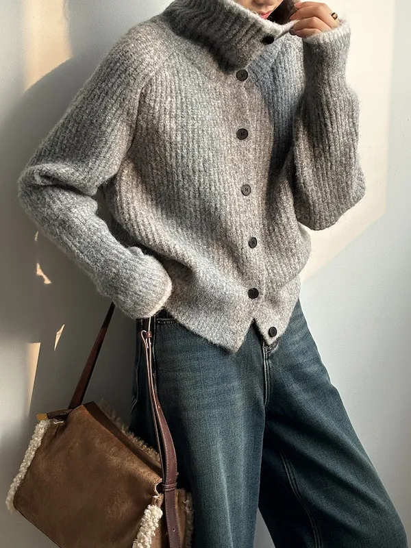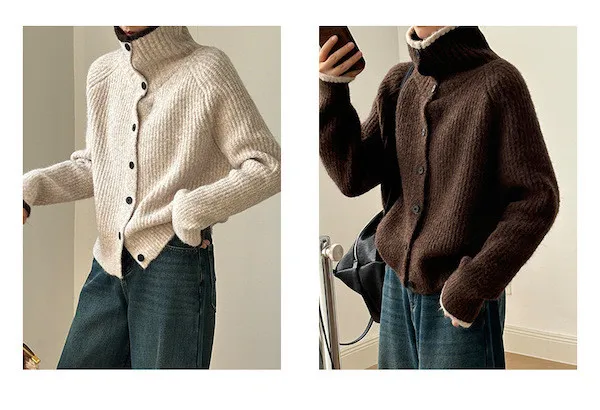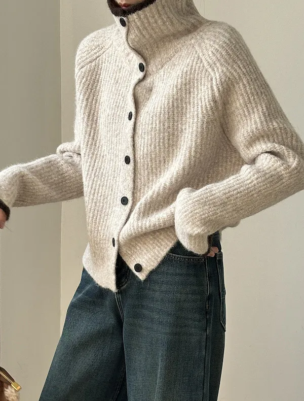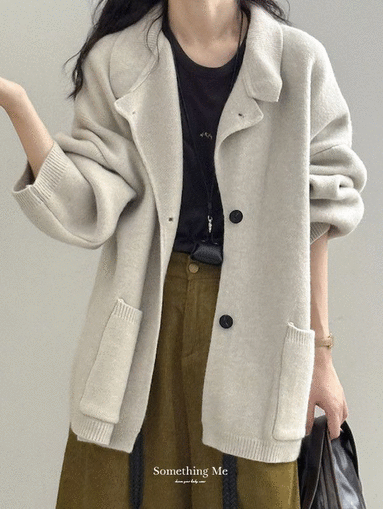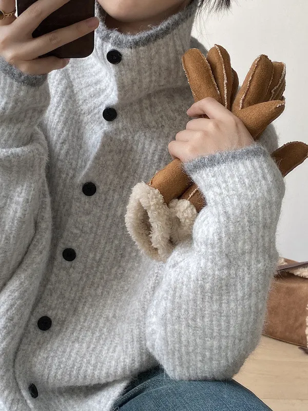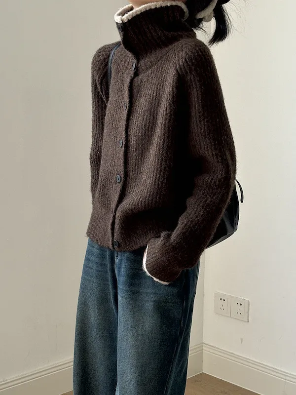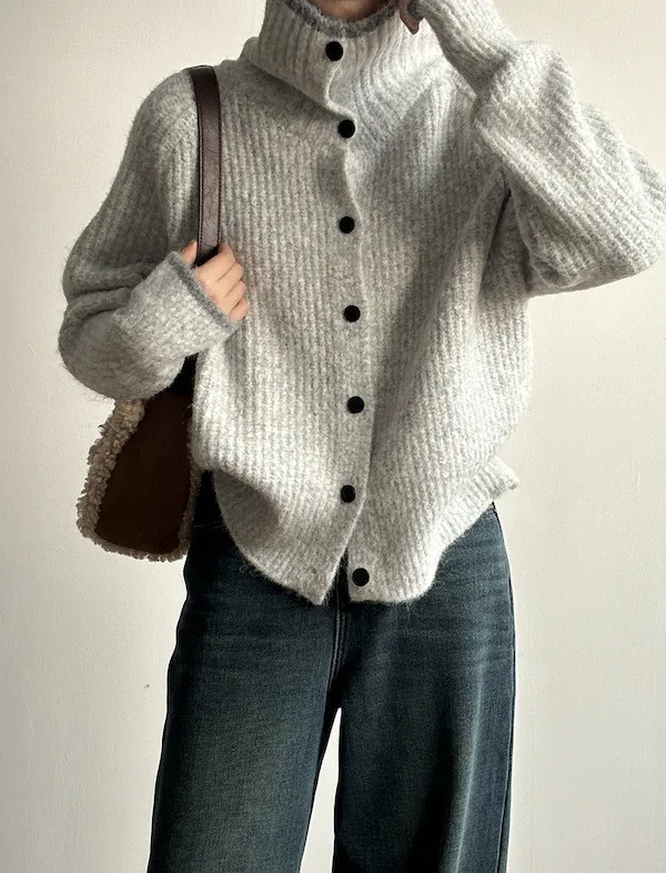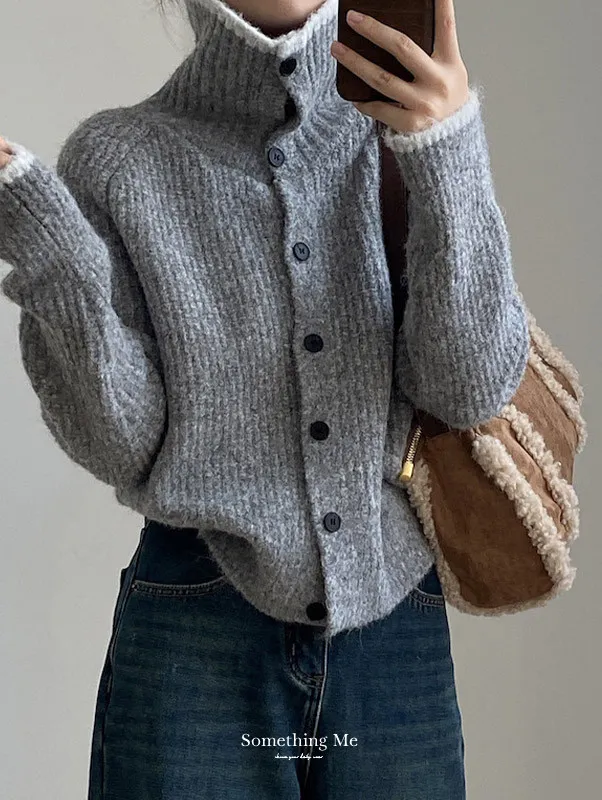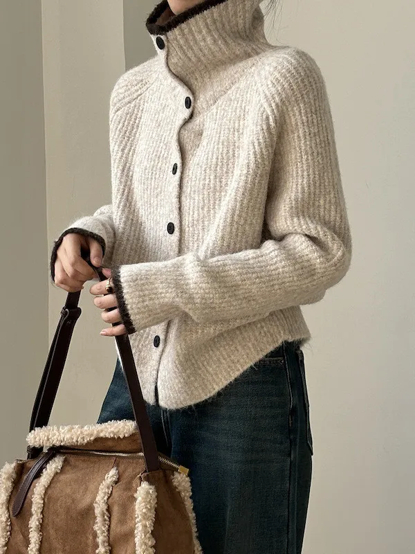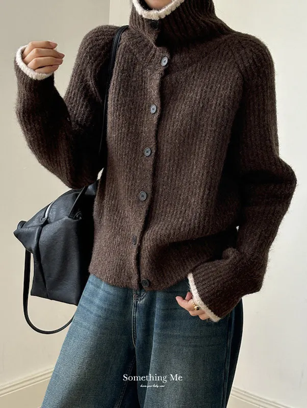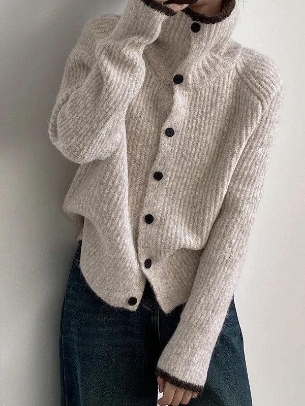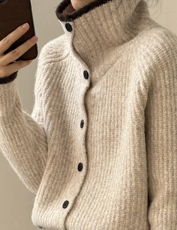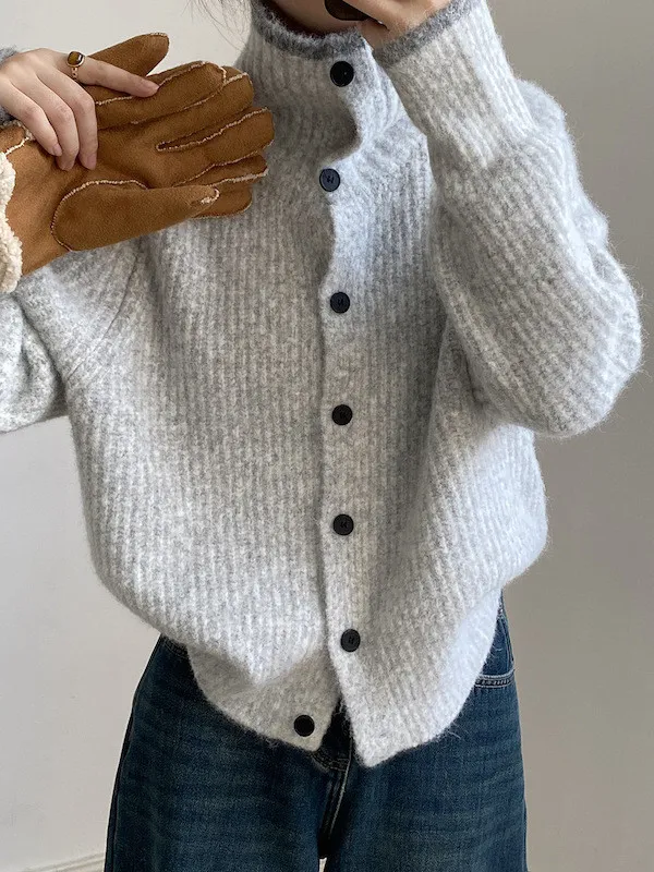 柔感絮語 撞色翻領單排扣針織毛衣外套 4色
