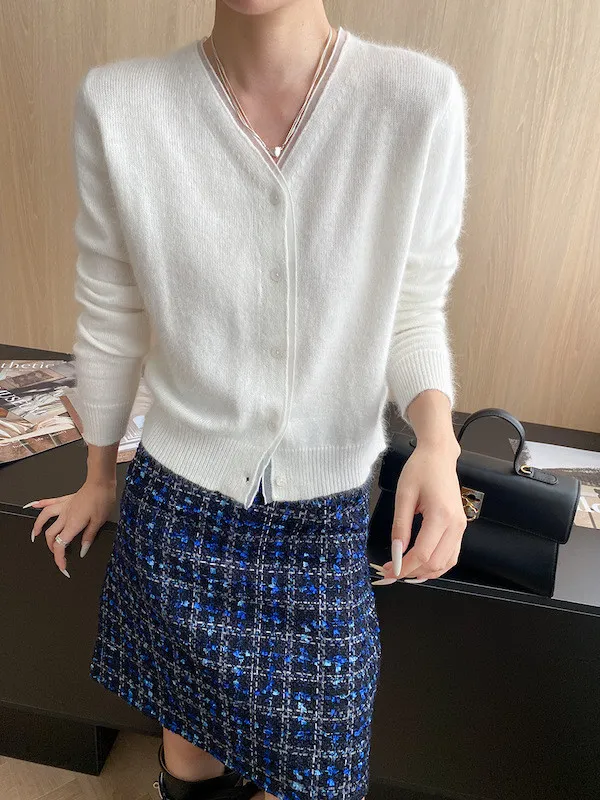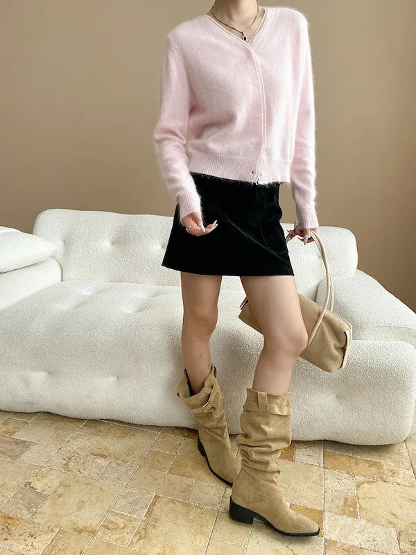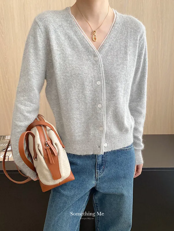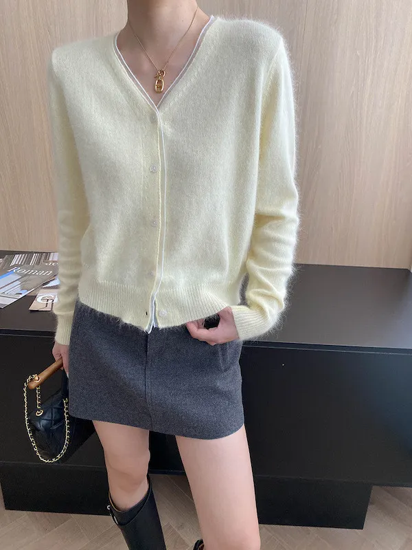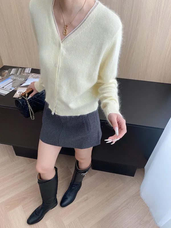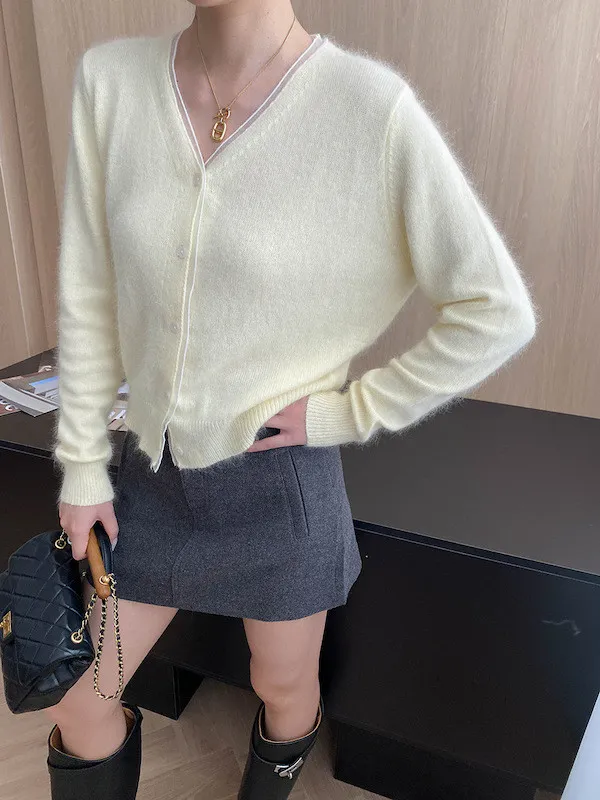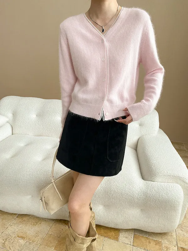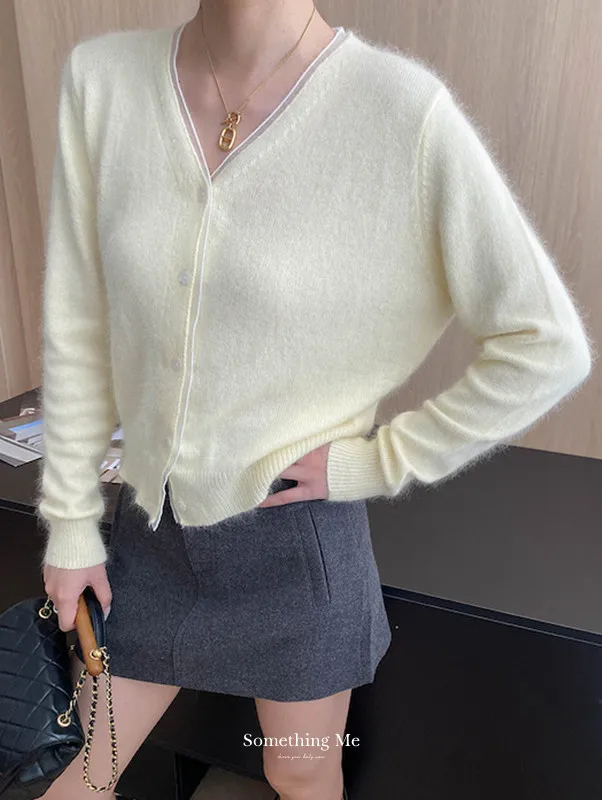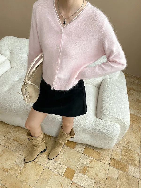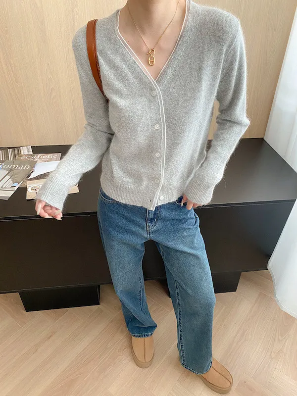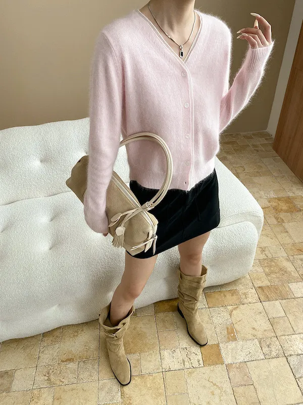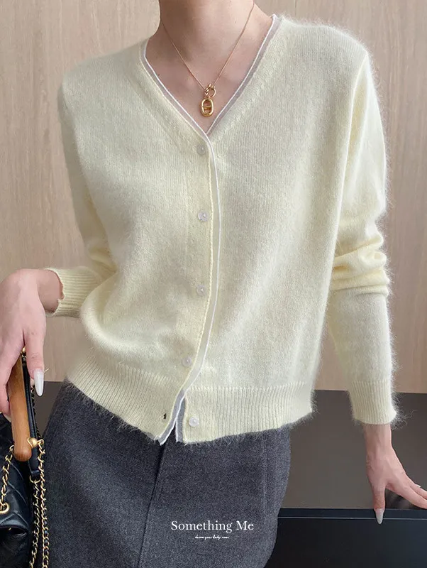 溫柔質感 蕾絲拼接V領浣熊絨針織開衫 5色