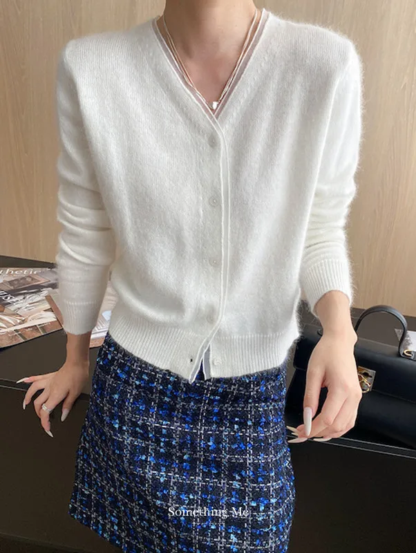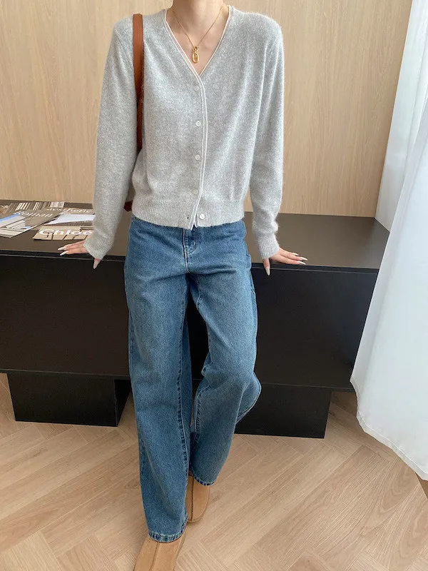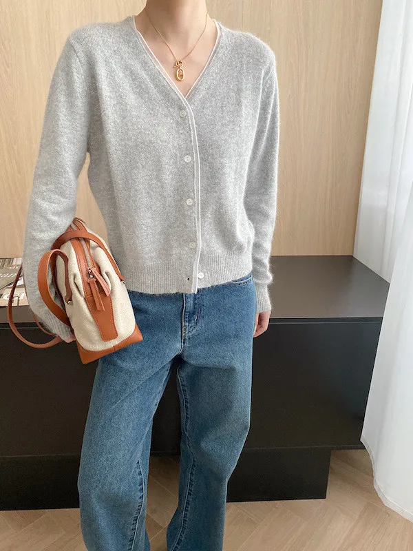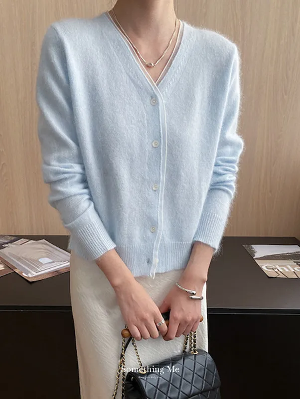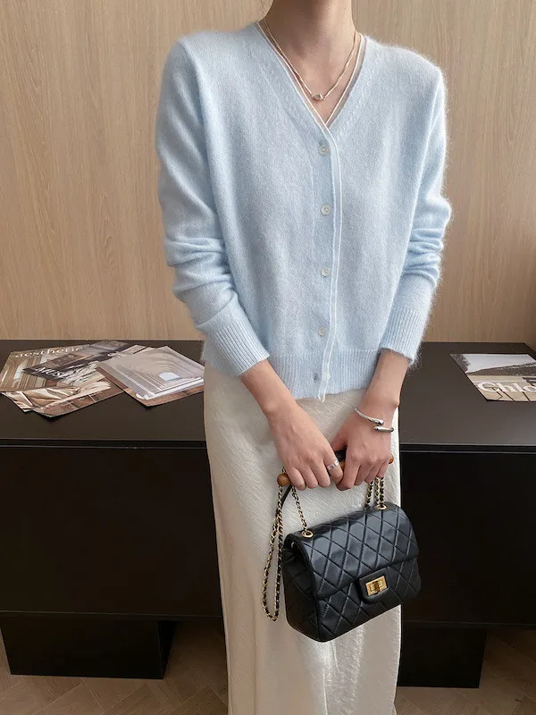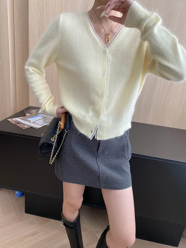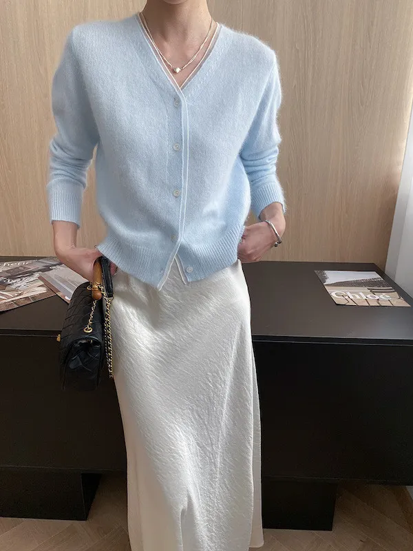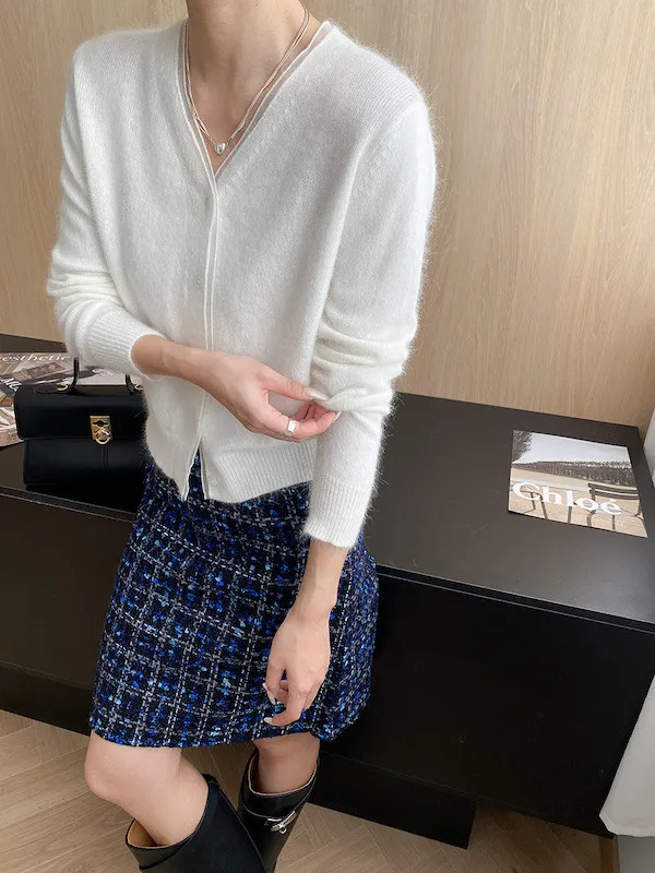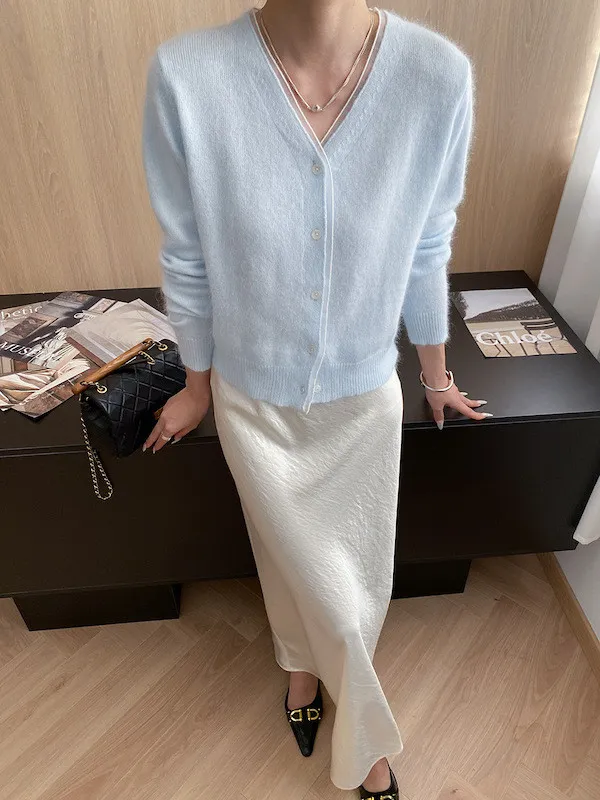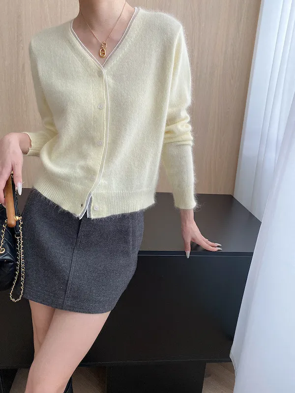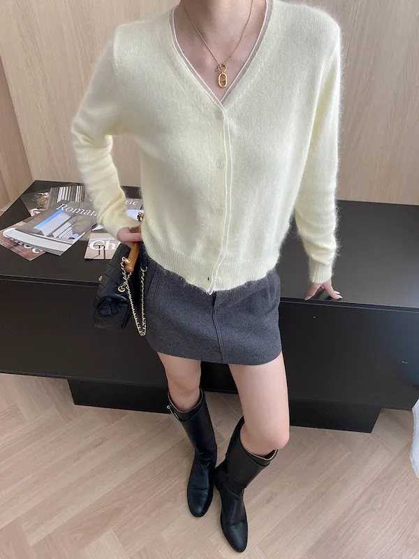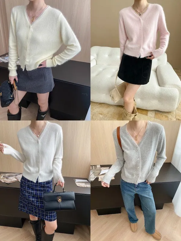溫柔質感 蕾絲拼接V領浣熊絨針織開衫 5色