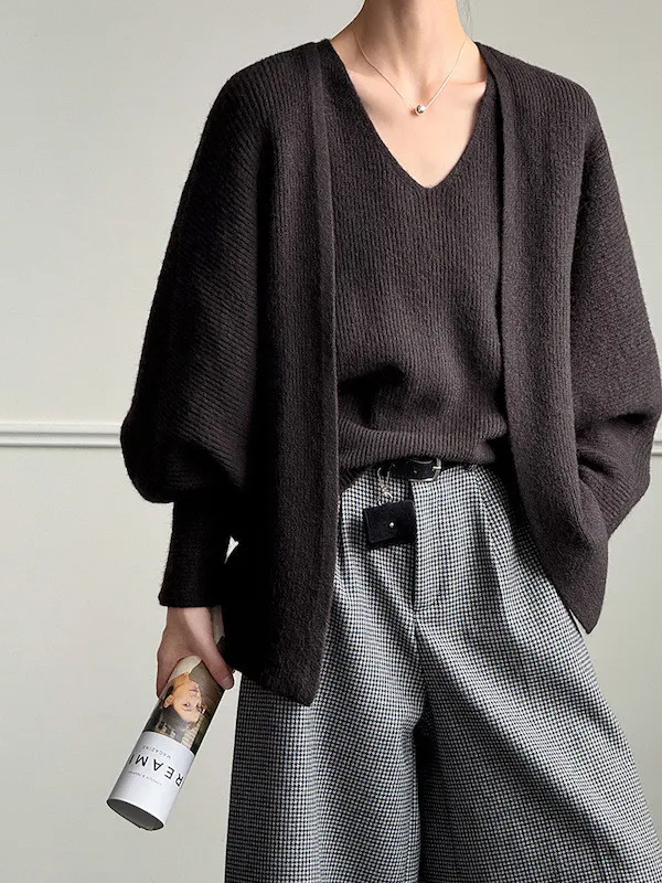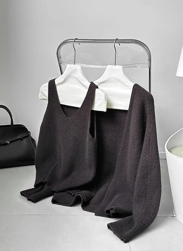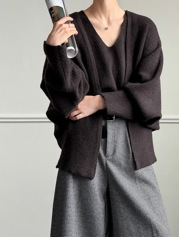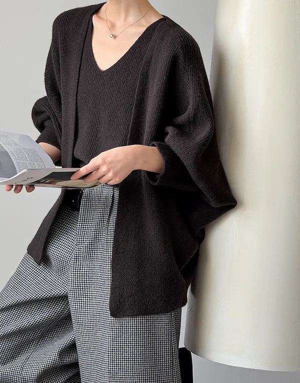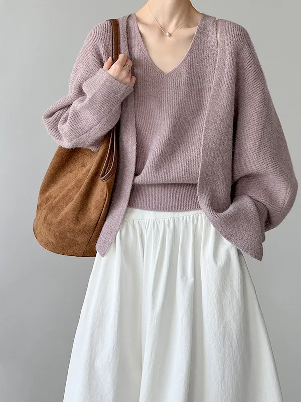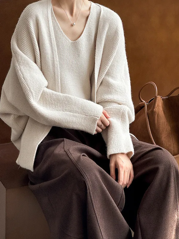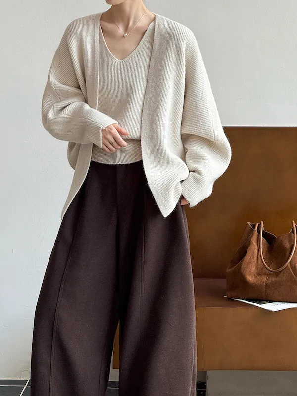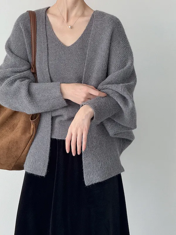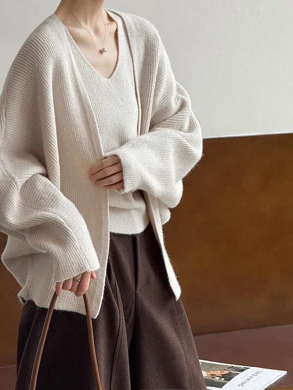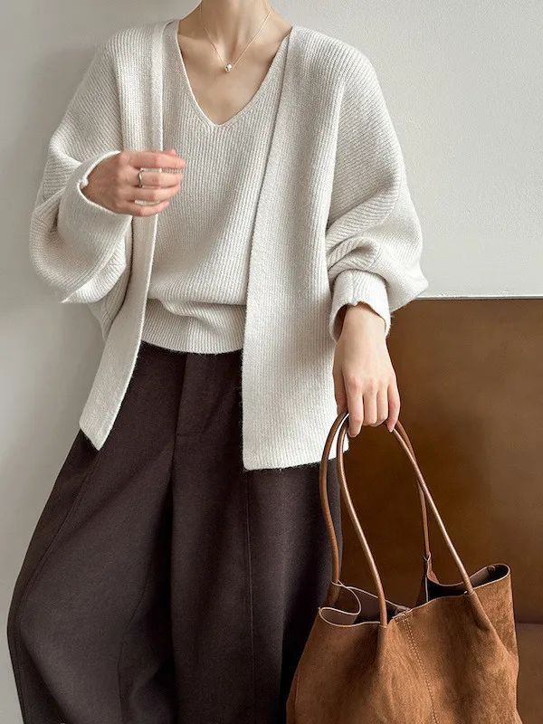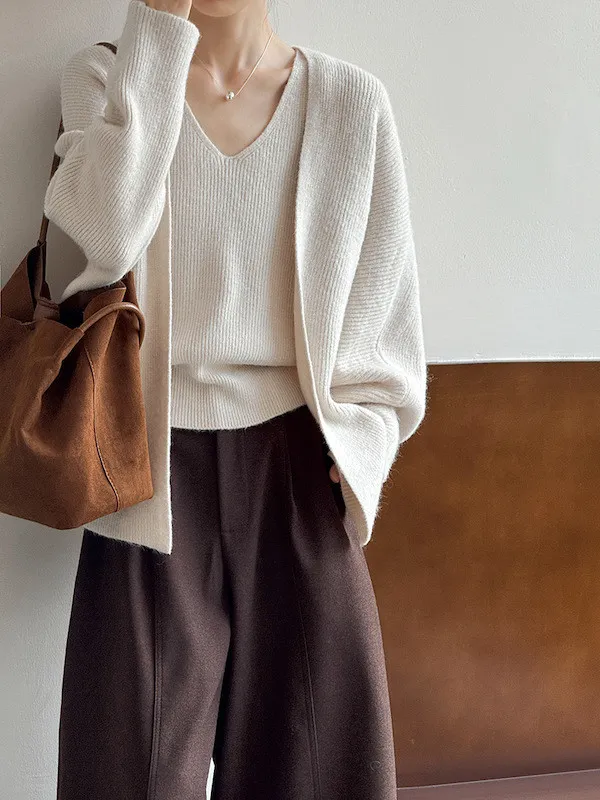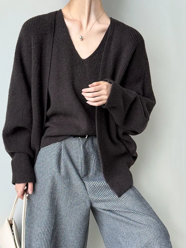 雲朵觸感 慵懶V領針織套組(外套+針織背心) 4色