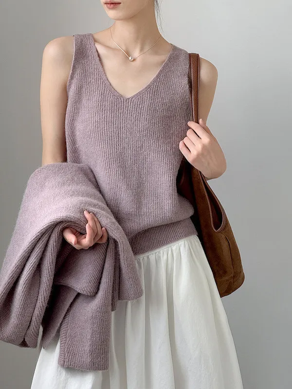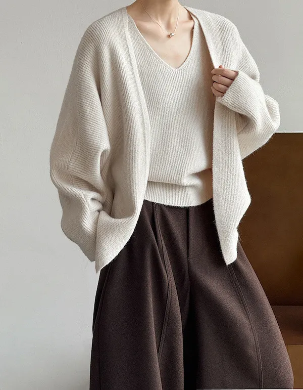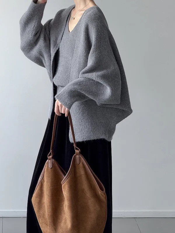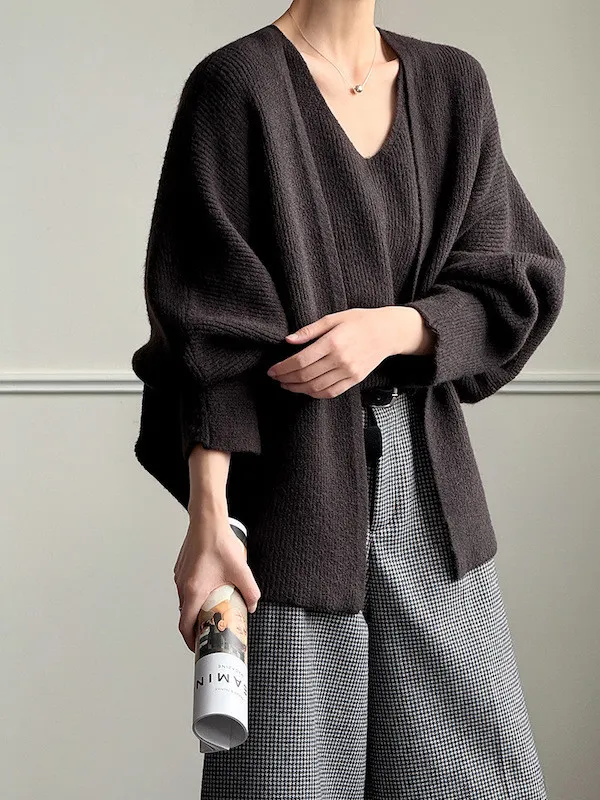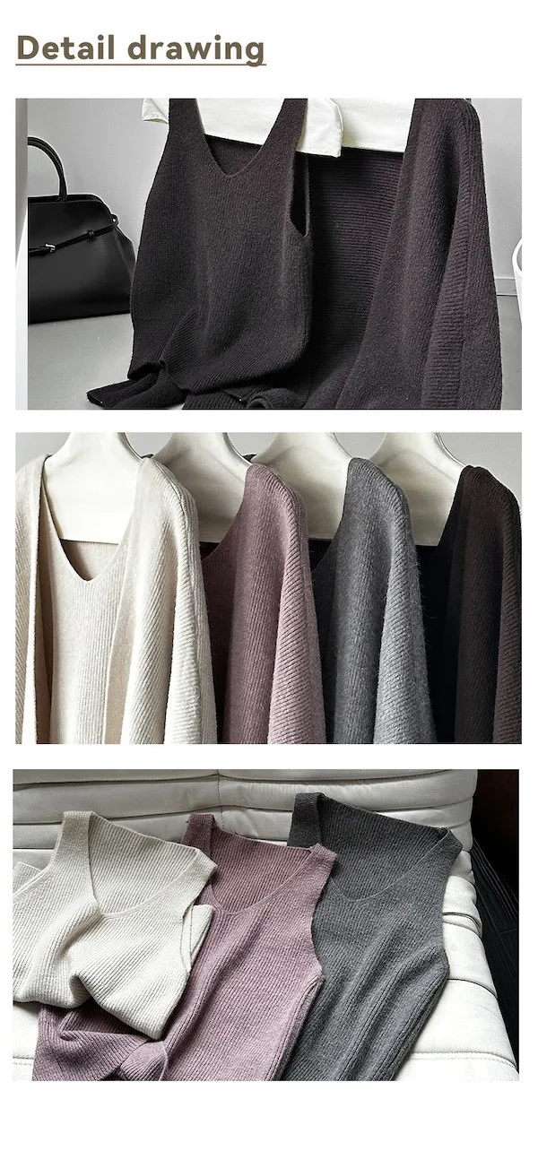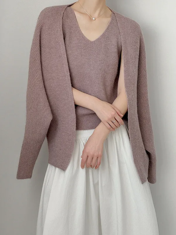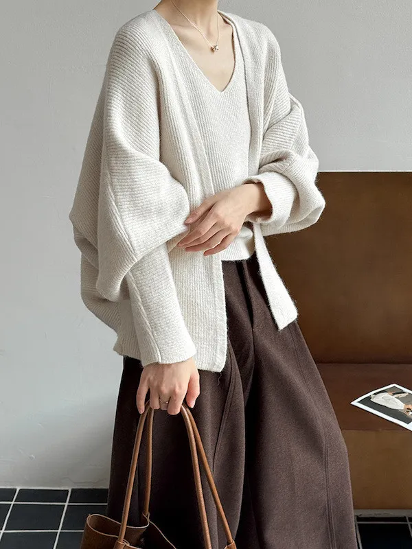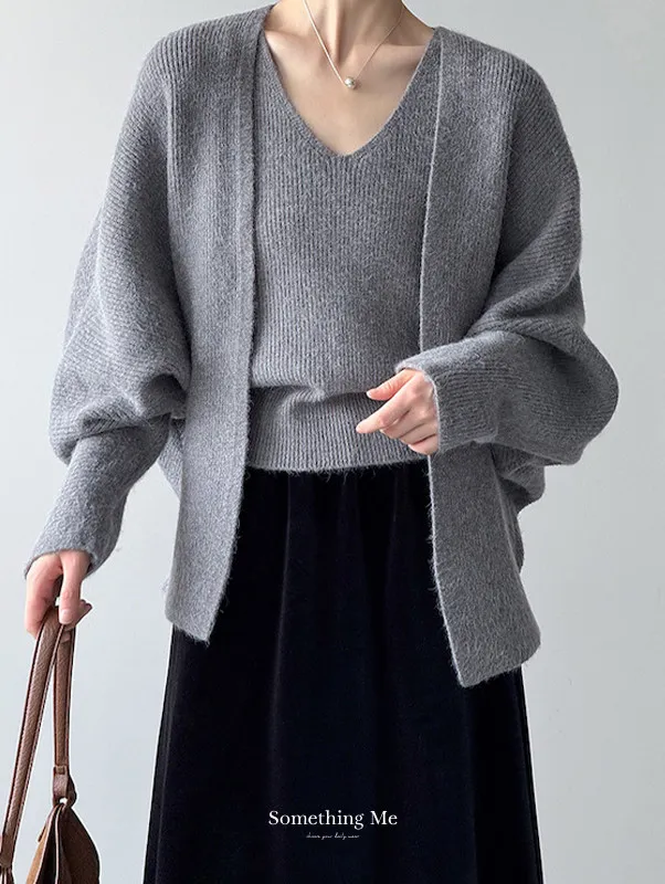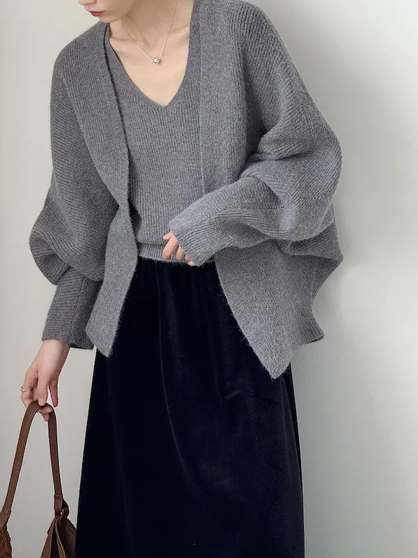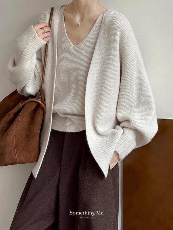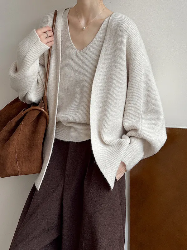 雲朵觸感 慵懶V領針織套組(外套+針織背心) 4色