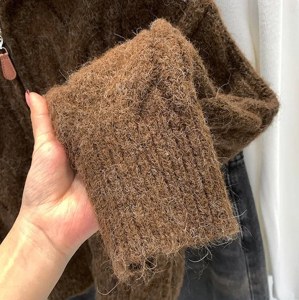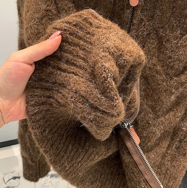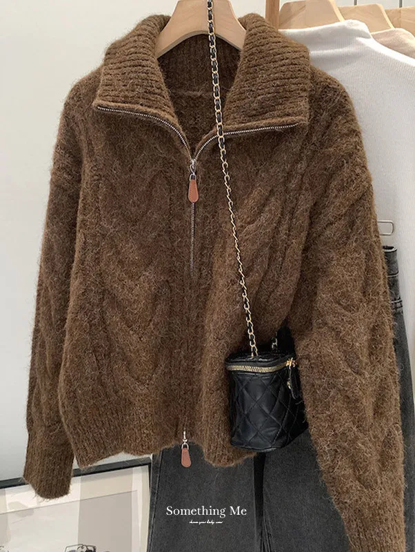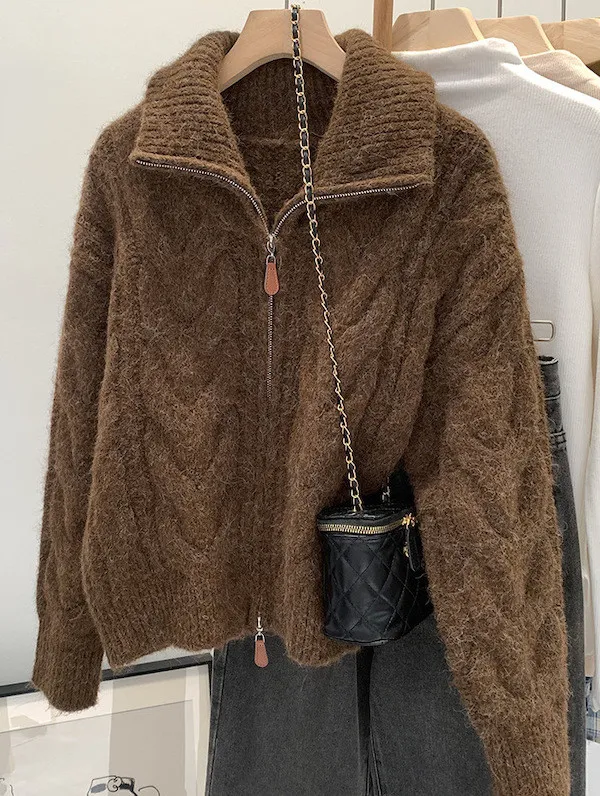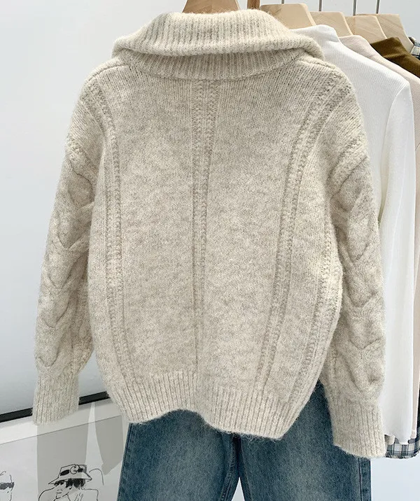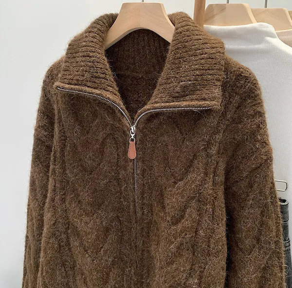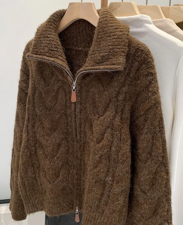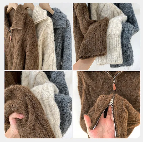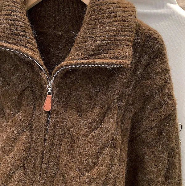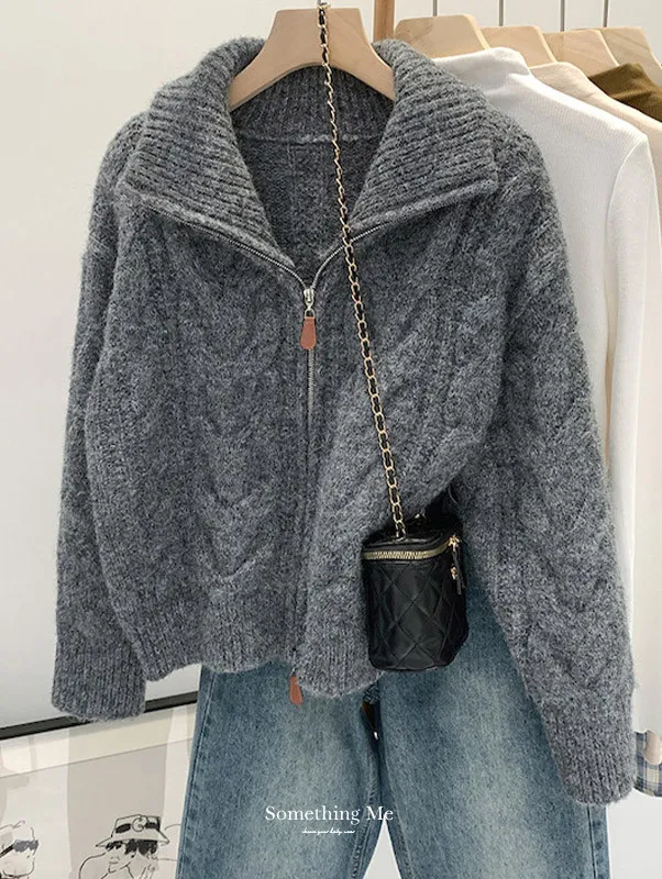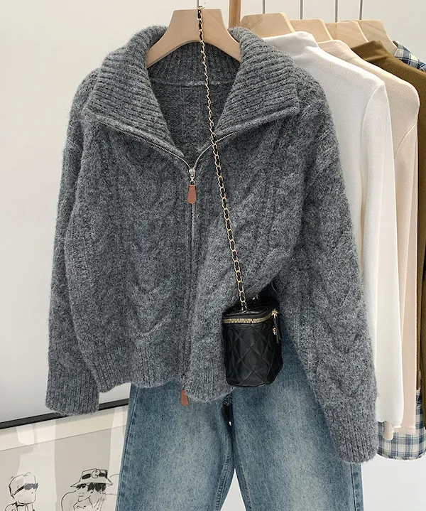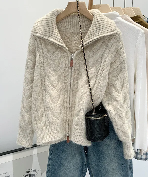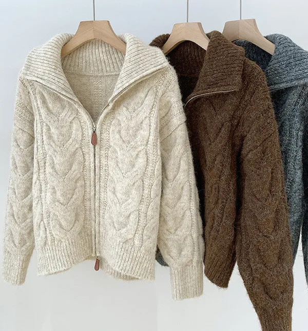 高級感色系|粗麻花雙拉鍊翻領針織開衫 3色