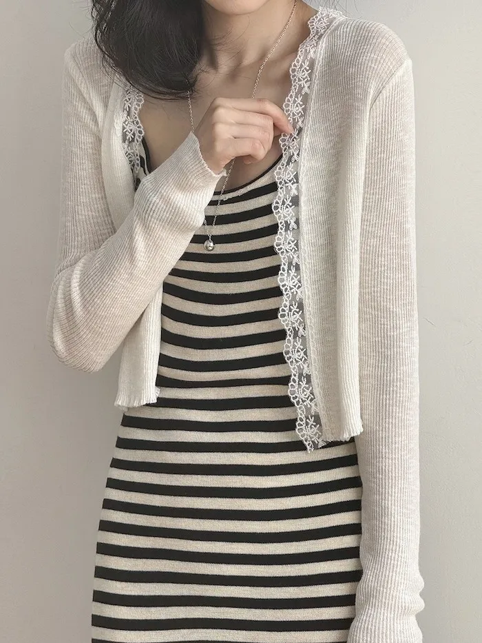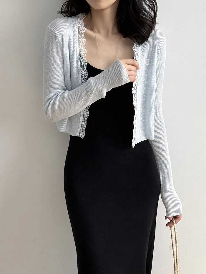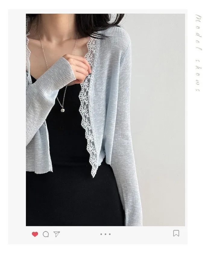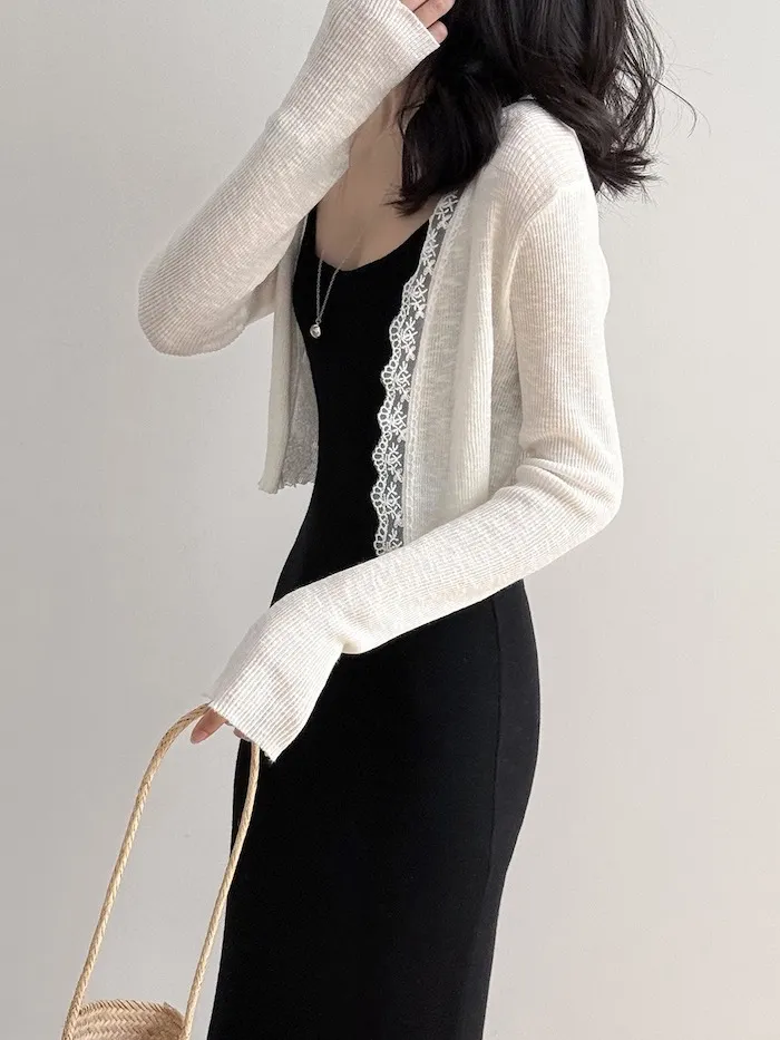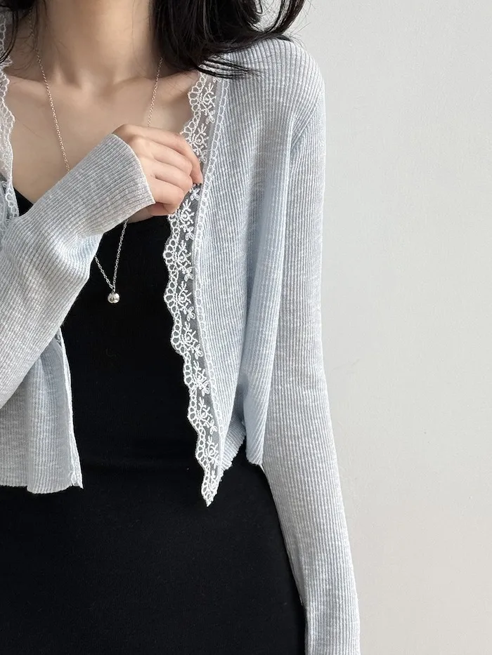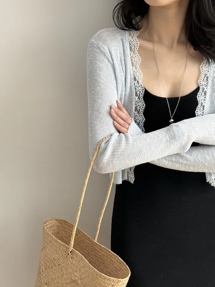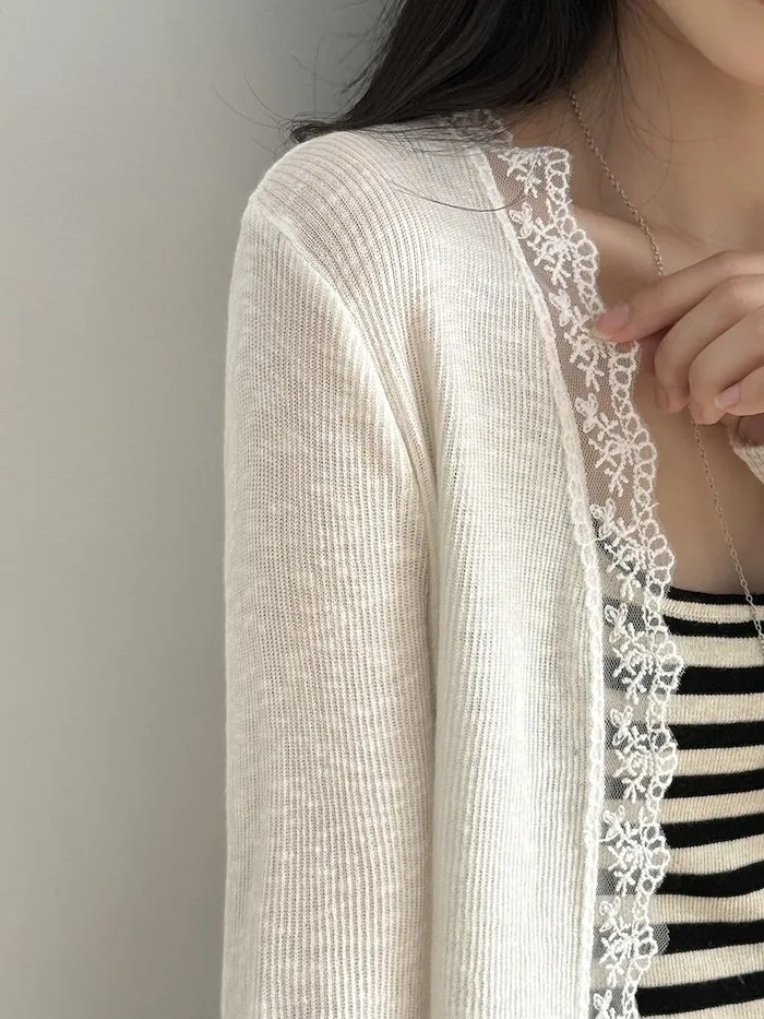 這款針織開衫邊緣點綴著細緻蕾絲,為簡約造型增添一絲浪漫氣息