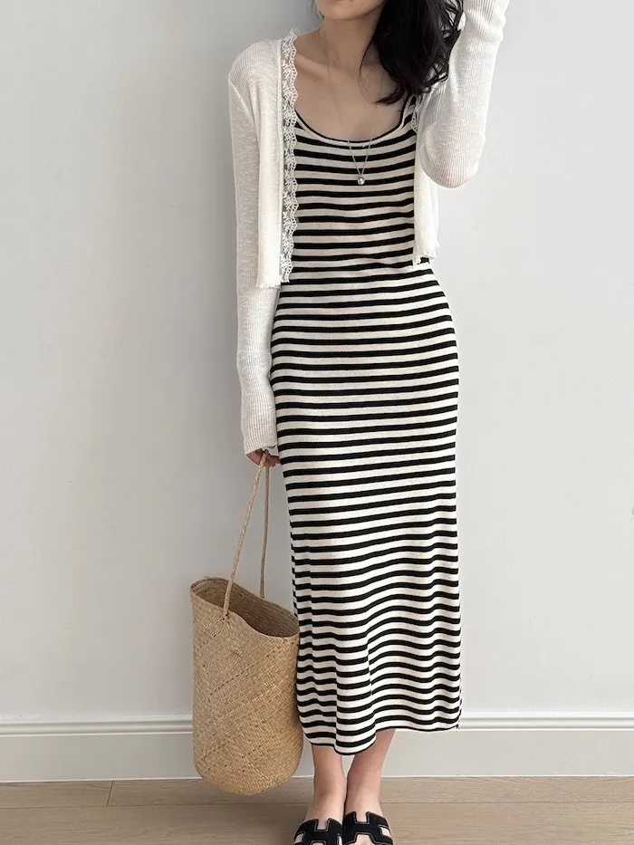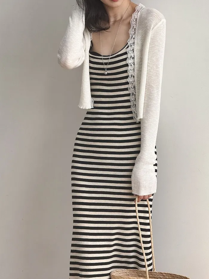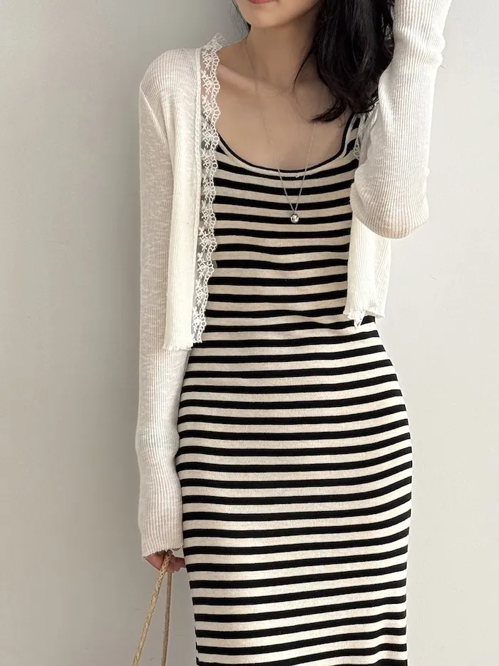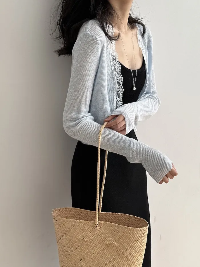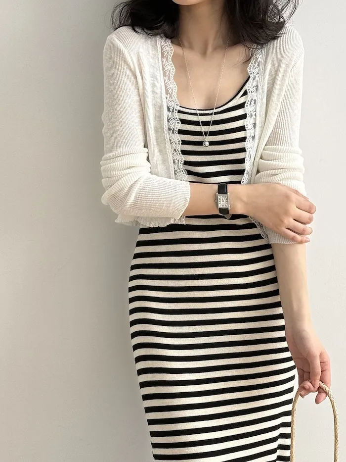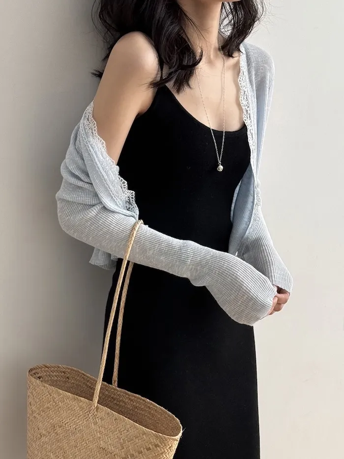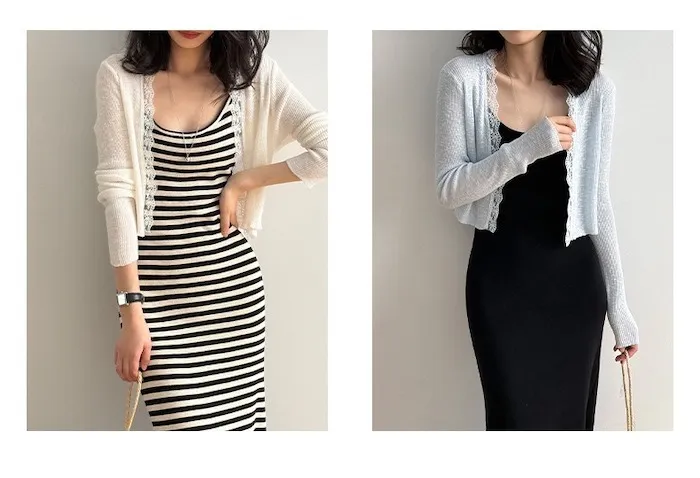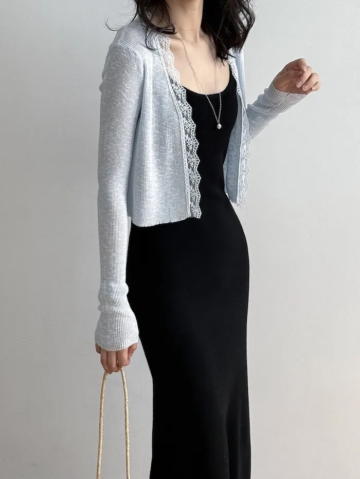 這款針織開衫邊緣點綴著細緻蕾絲,為簡約造型增添一絲浪漫氣息
