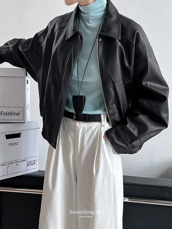 暗夜搖滾寬鬆短版PU機車皮夾克