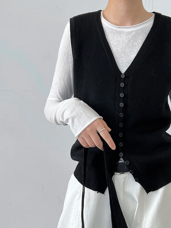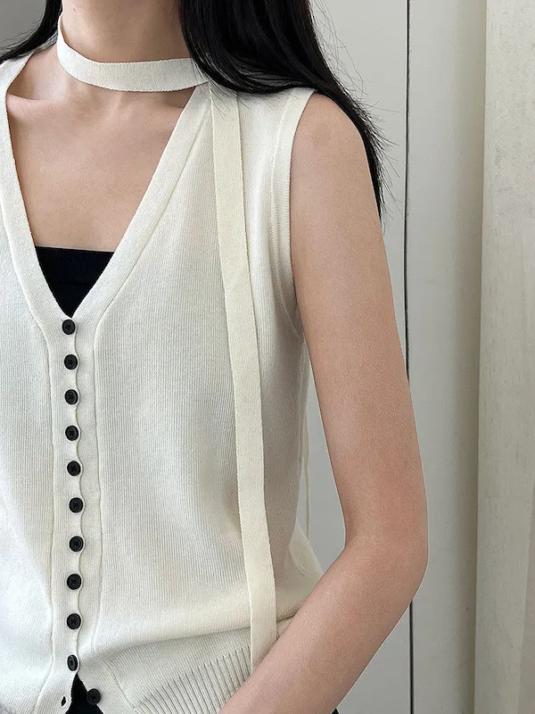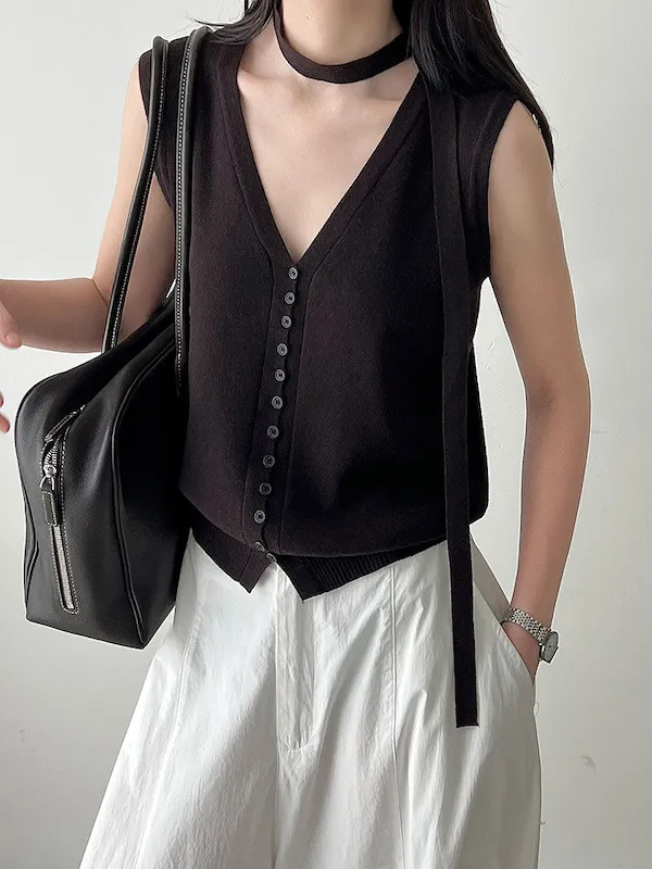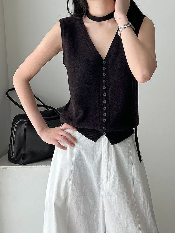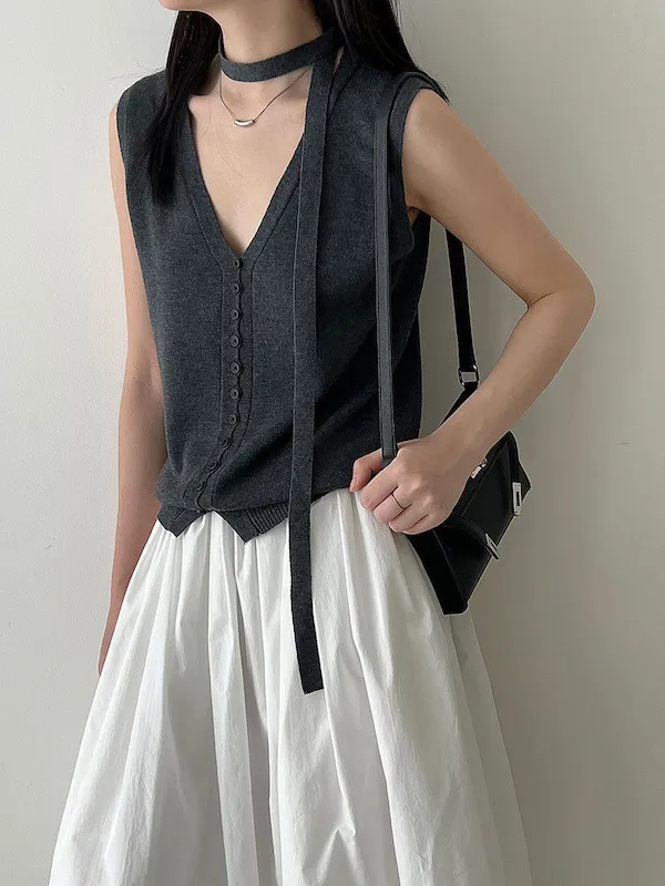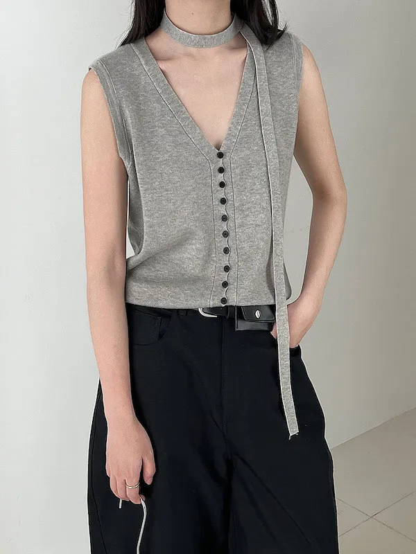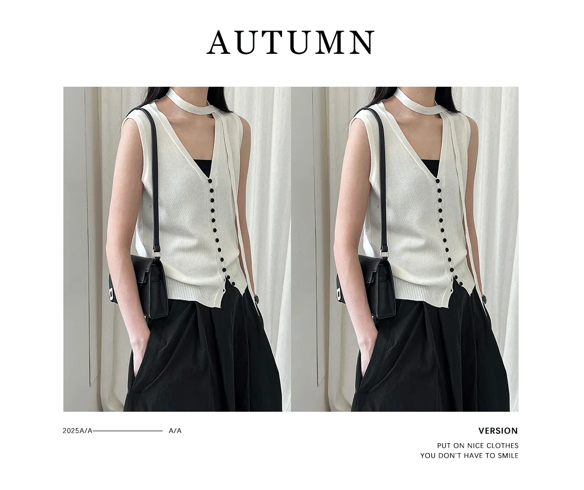 V領針織背心單穿很清爽,配上可拆式領帶就變得很有個性