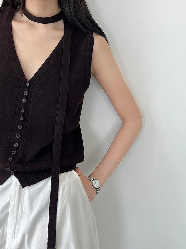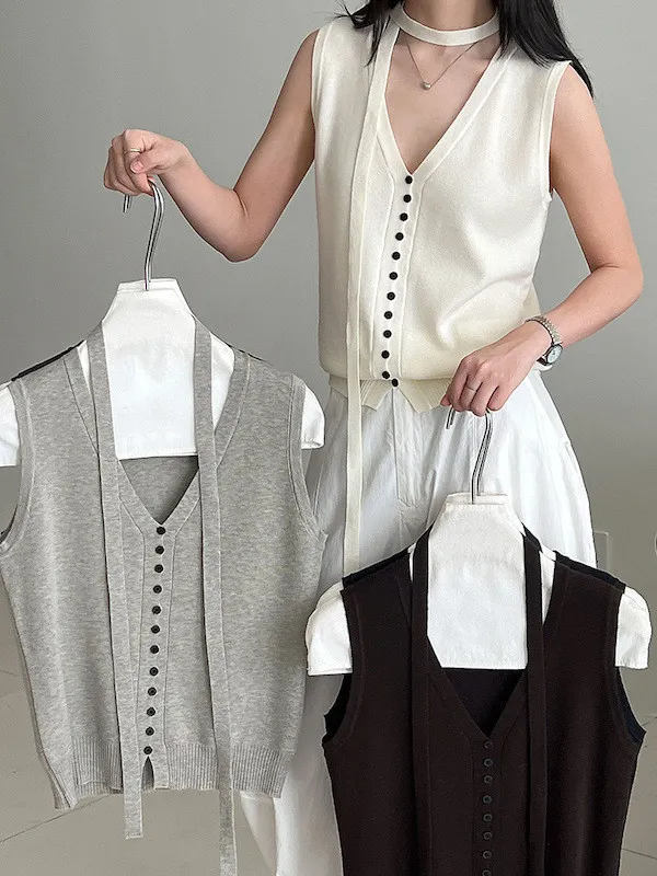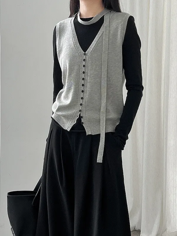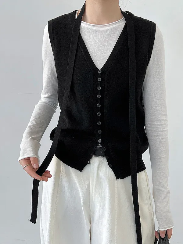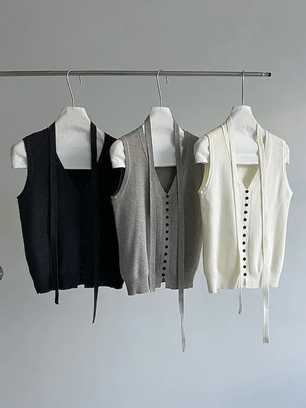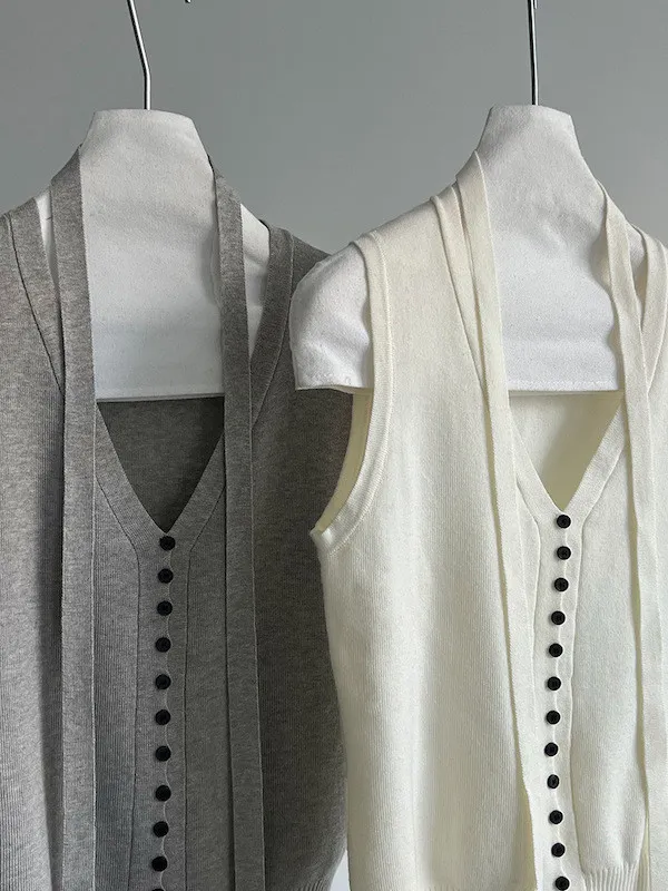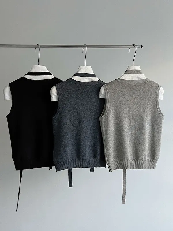 秋日調香 V領羊毛針織背心配領帶上衣 5色