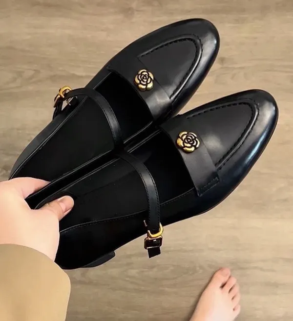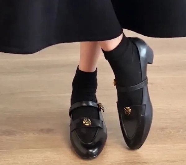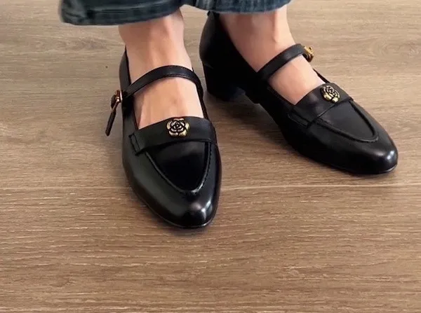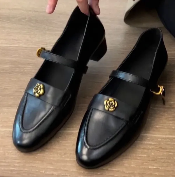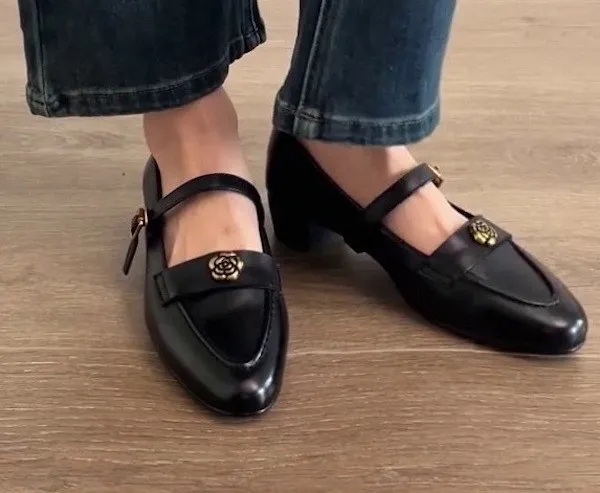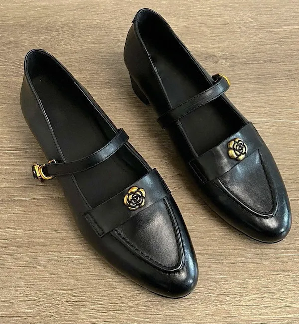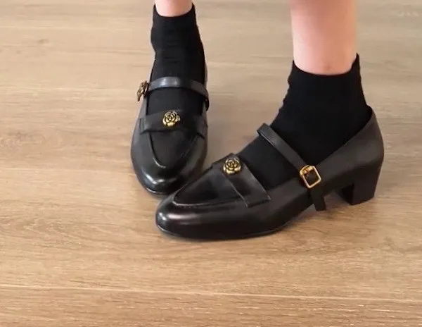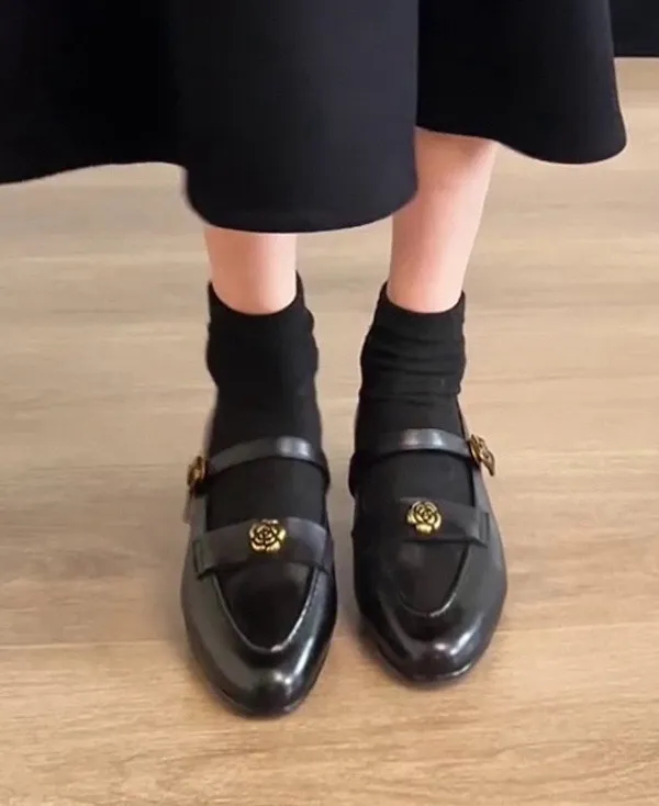 復古巴黎 山茶花真皮粗跟瑪麗珍鞋
