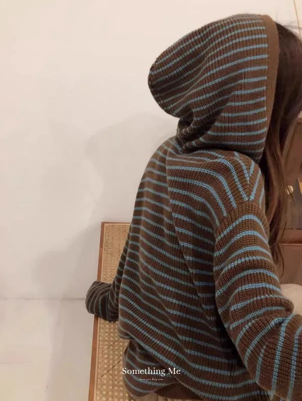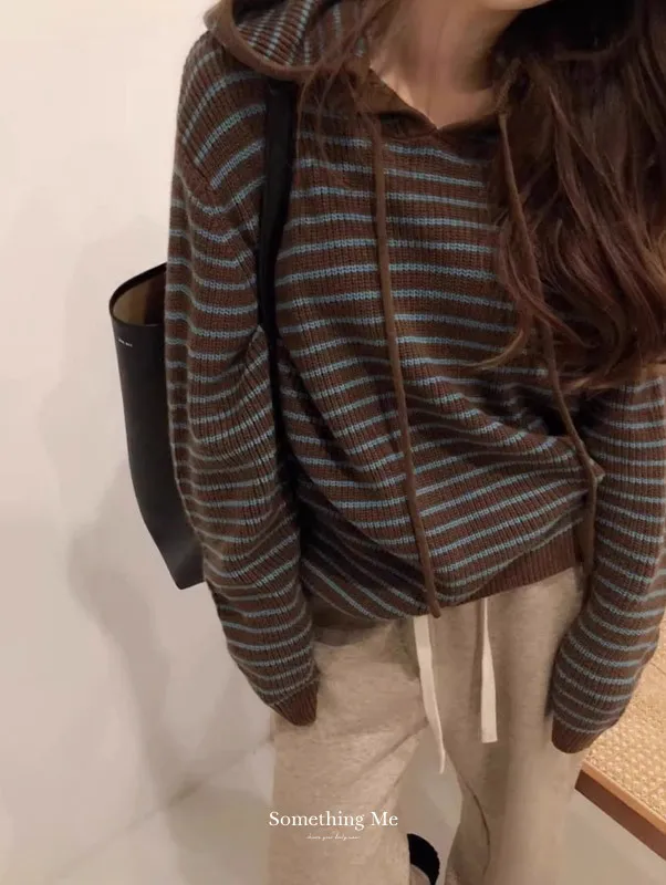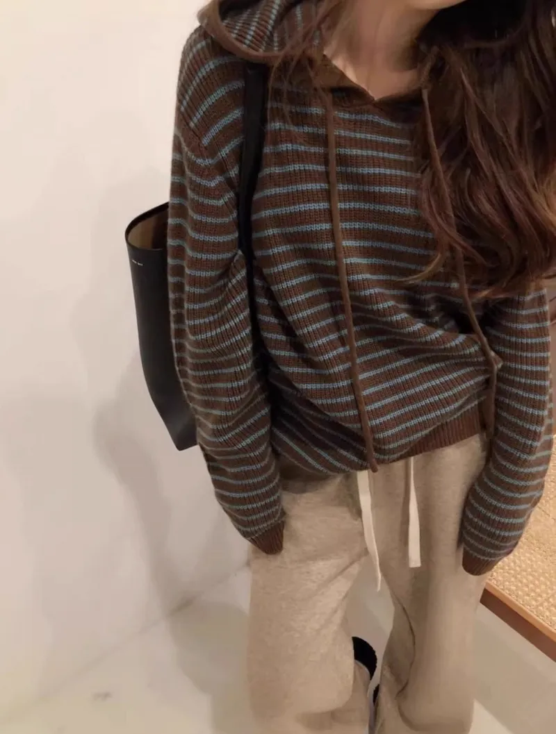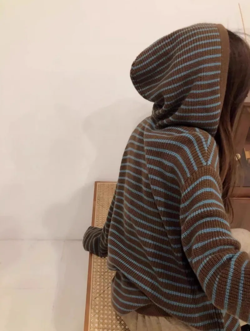 晨曦柔和.寬鬆條紋連帽針織上衣