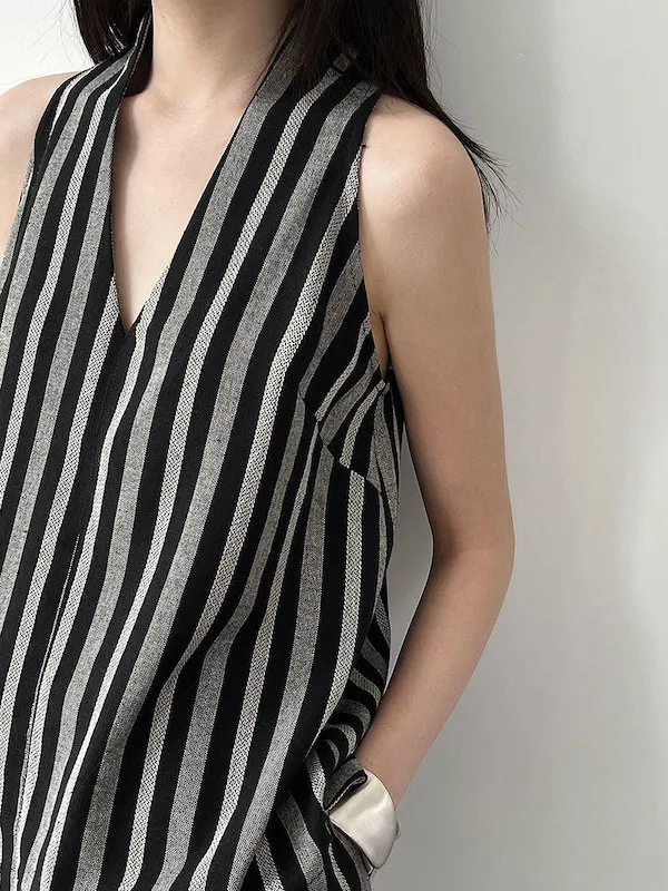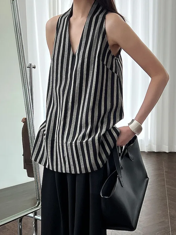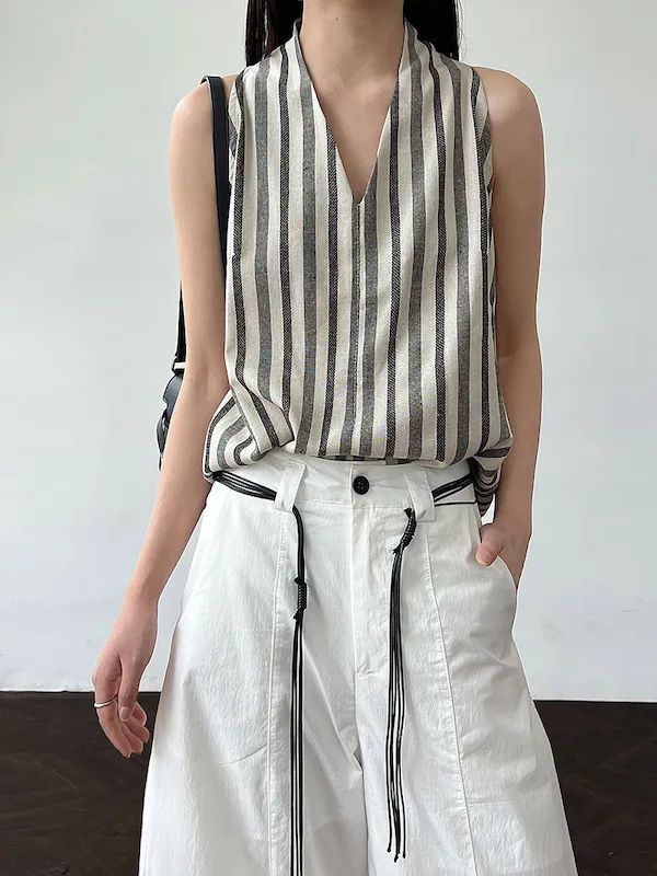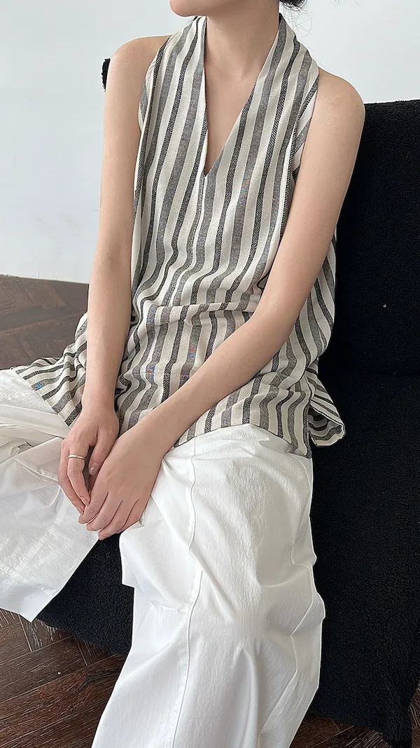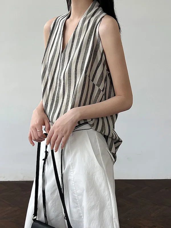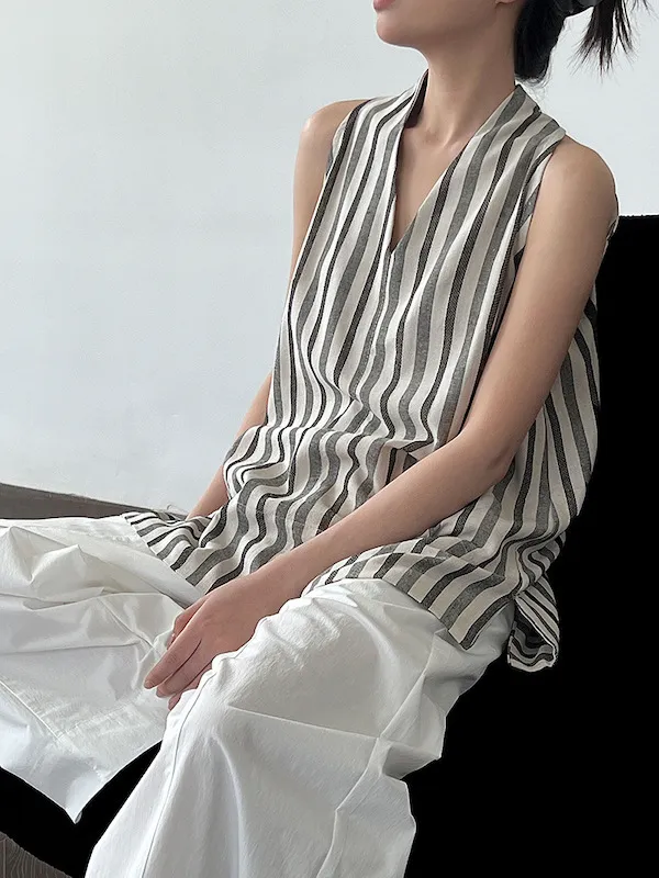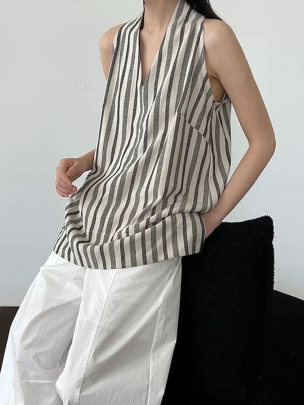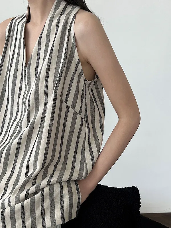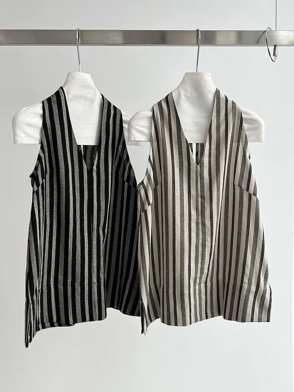 法式慵懶 棉麻條紋V領背心上衣 2色