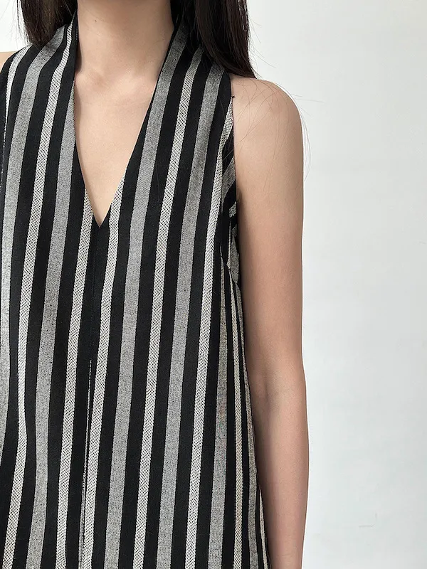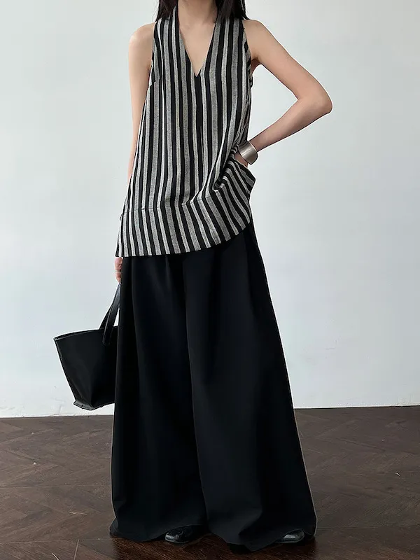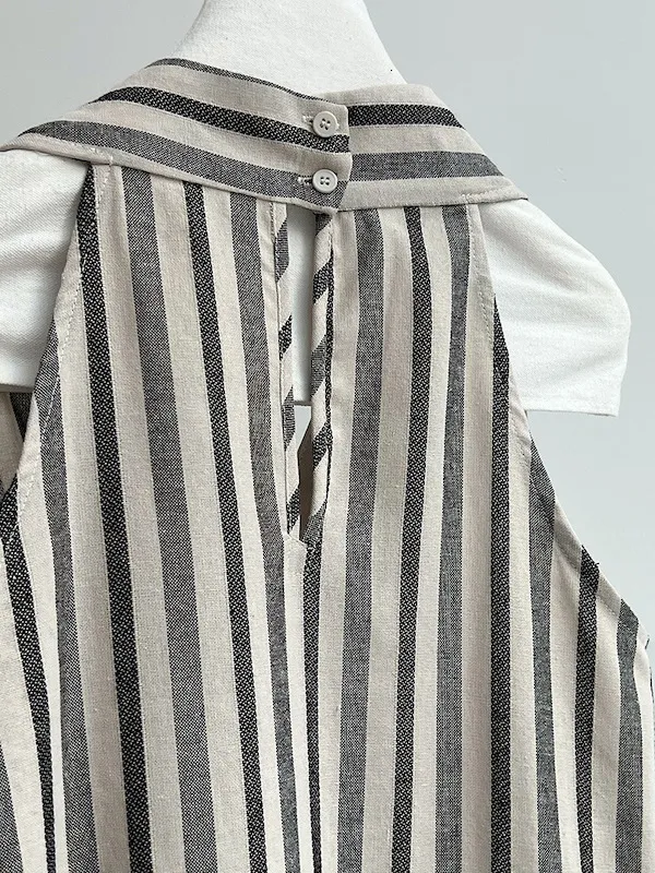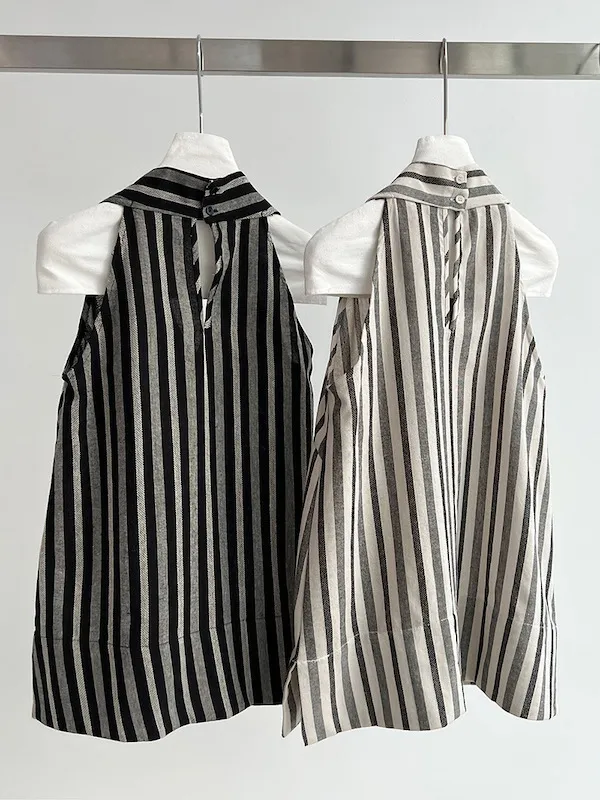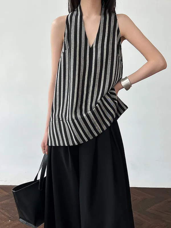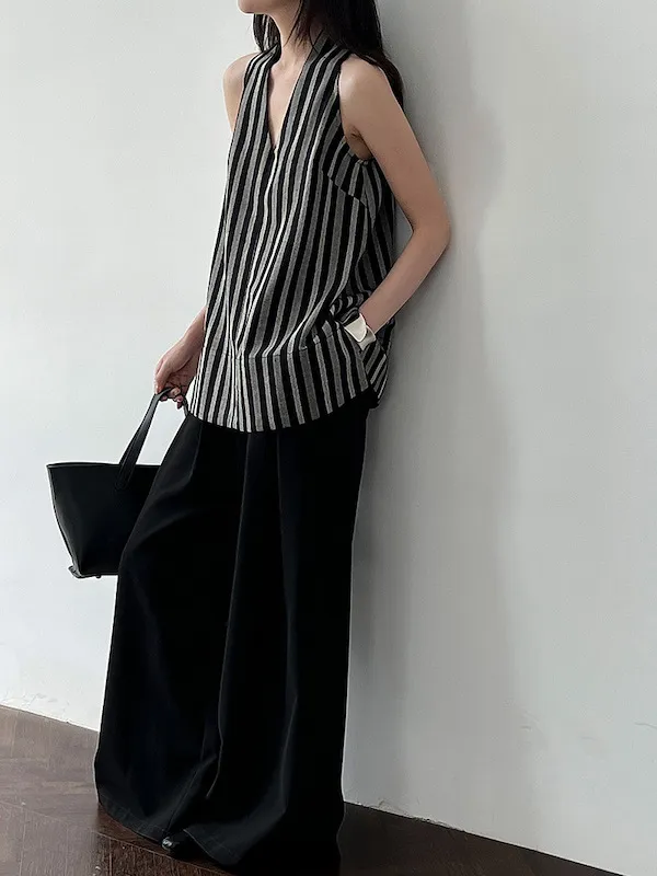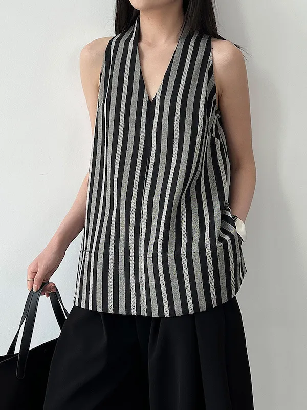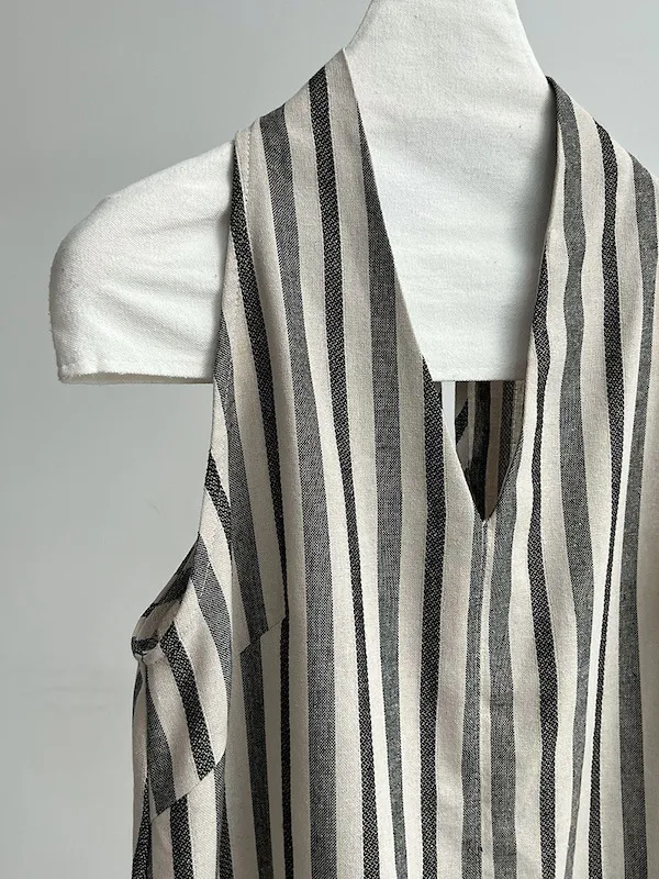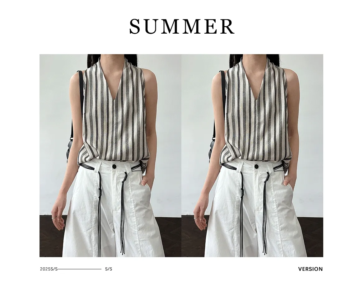 法式慵懶 棉麻條紋V領背心上衣 2色