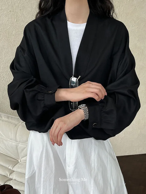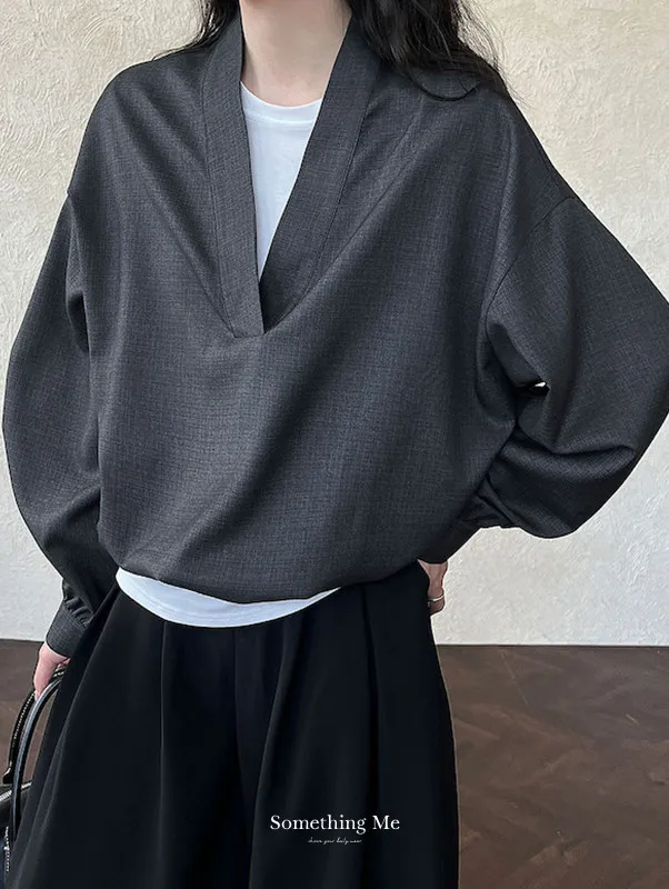 慵懶午後 無印感V領收腰寬鬆長袖上衣 2色