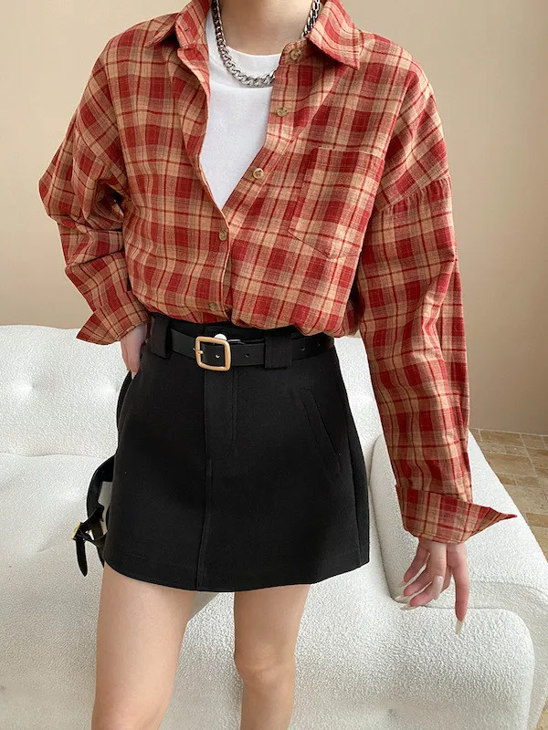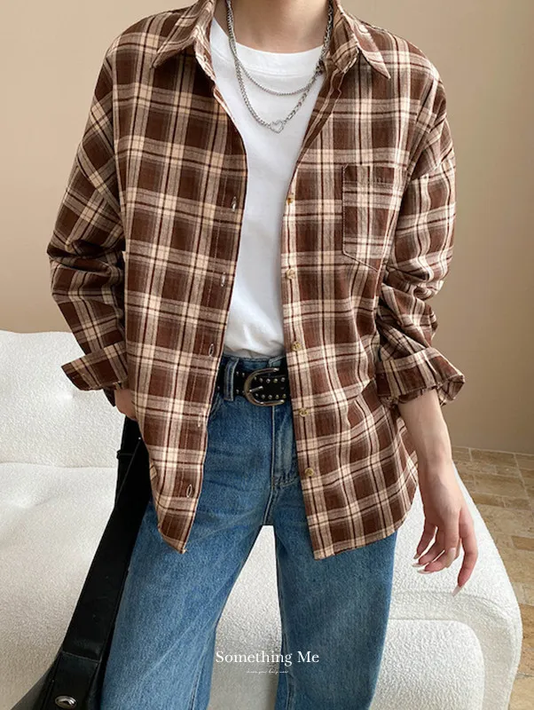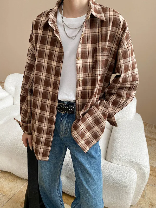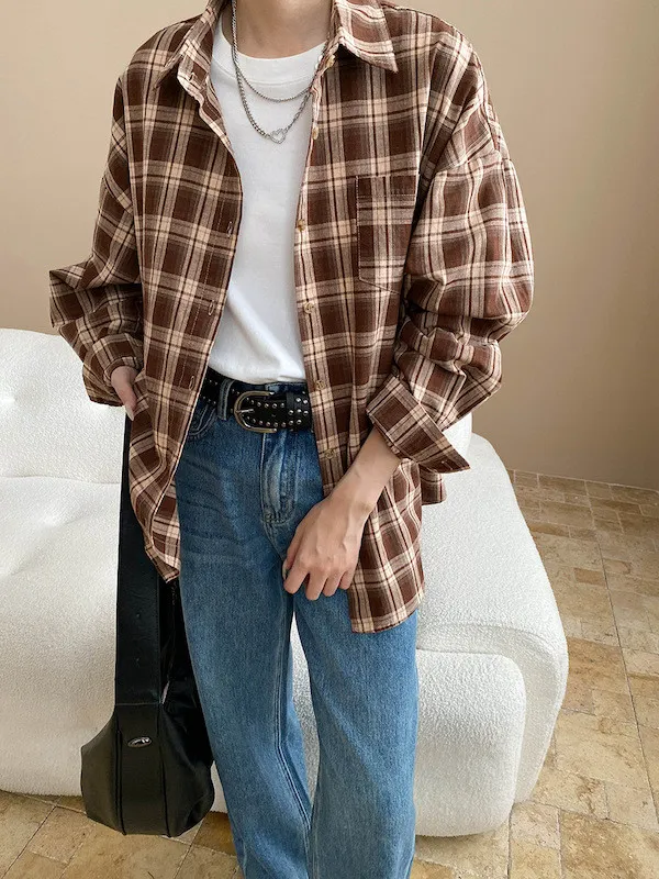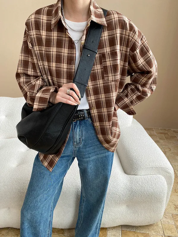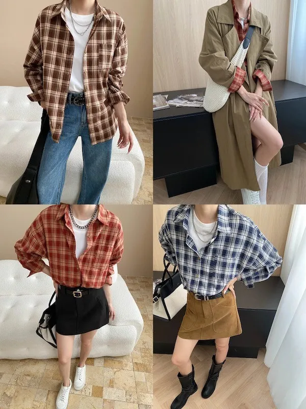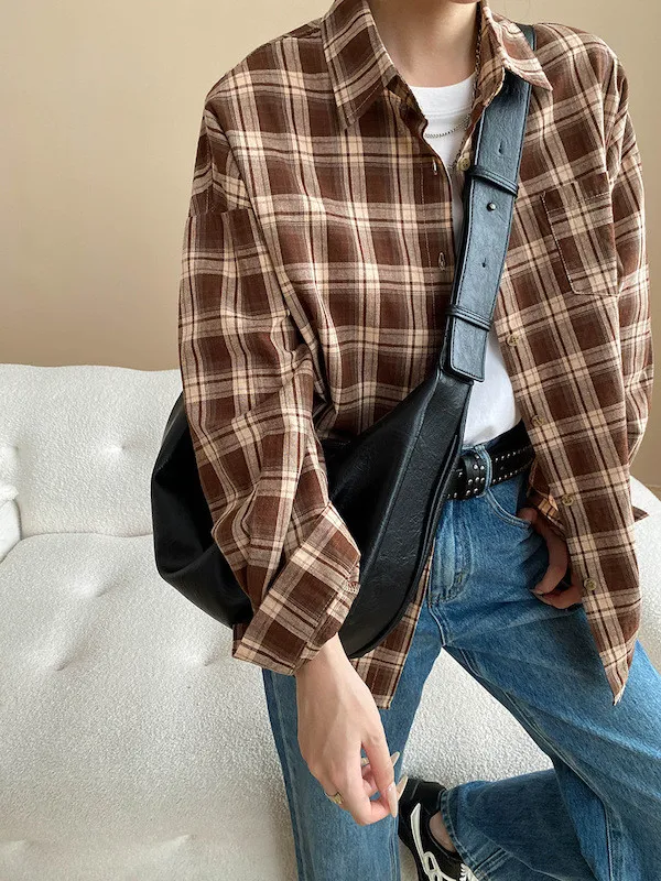 秋日咖啡館 撞色格紋寬鬆長袖襯衫 3色