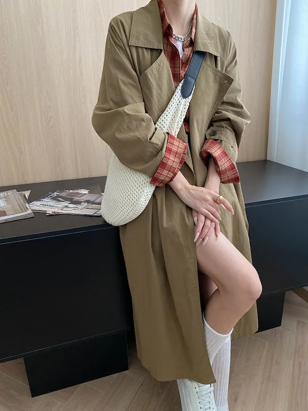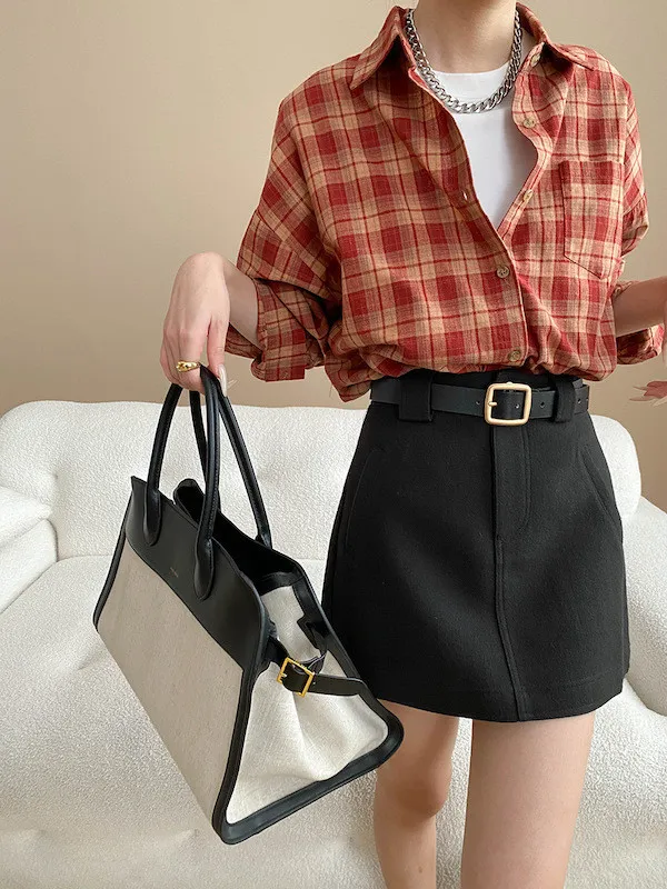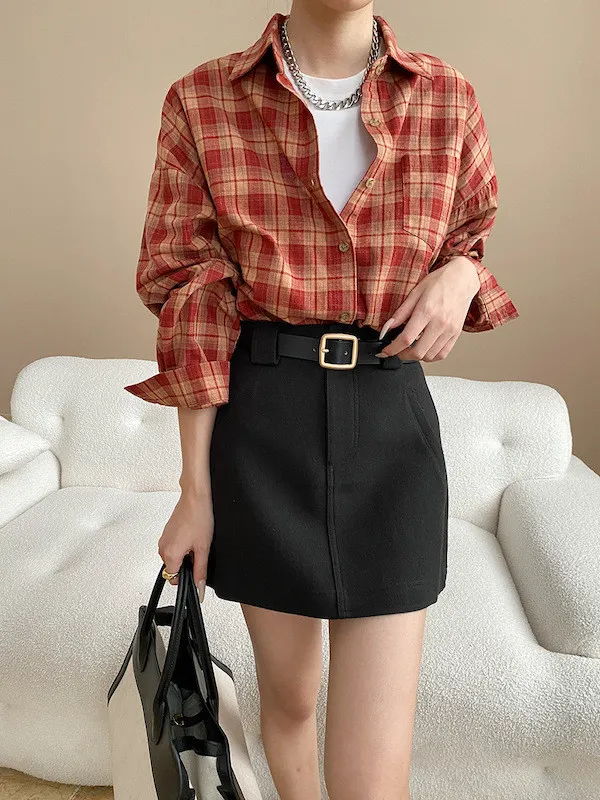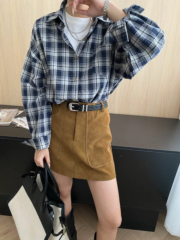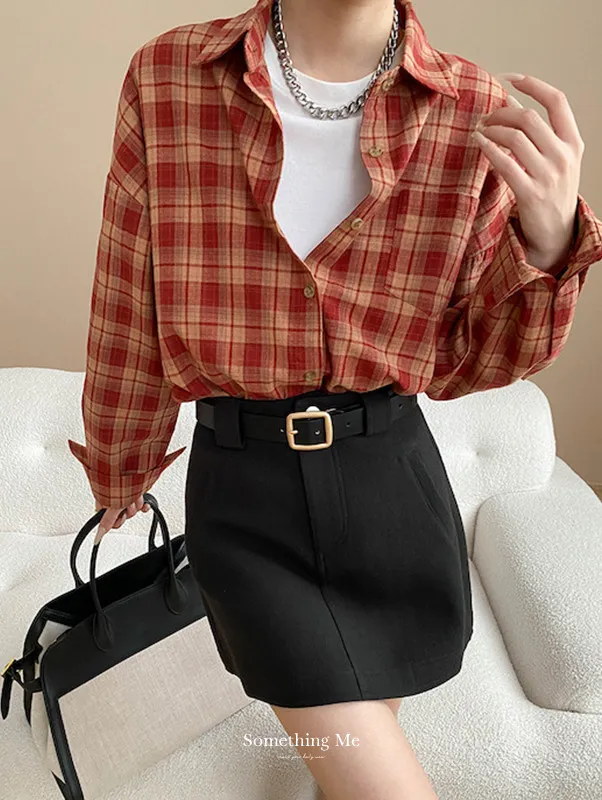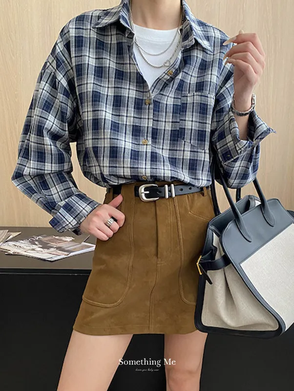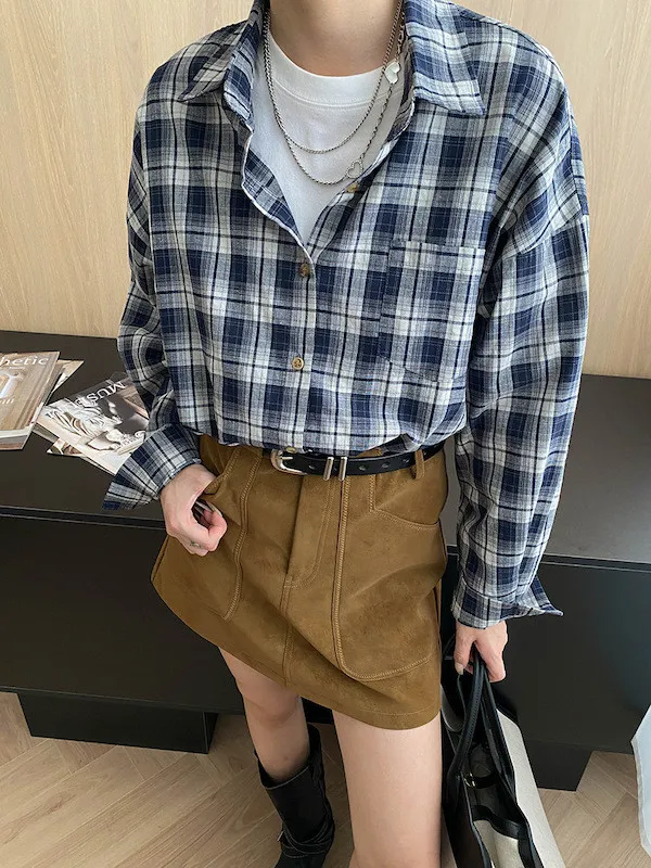 秋日咖啡館 撞色格紋寬鬆長袖襯衫 3色