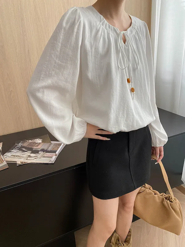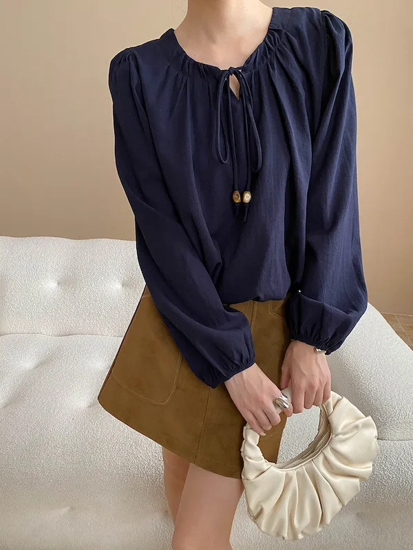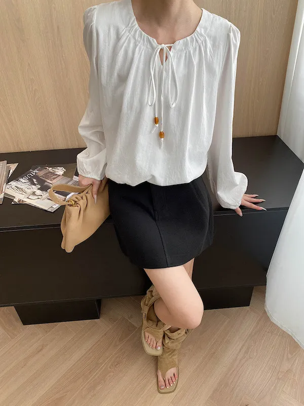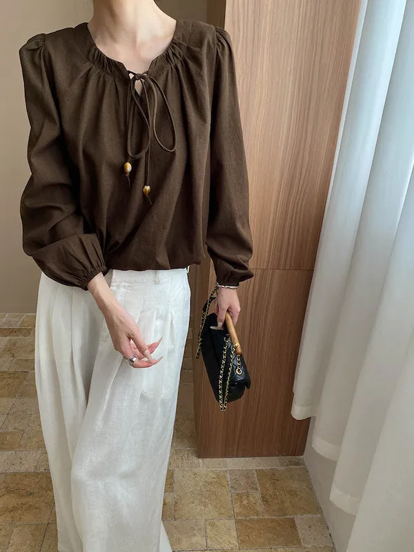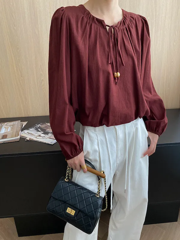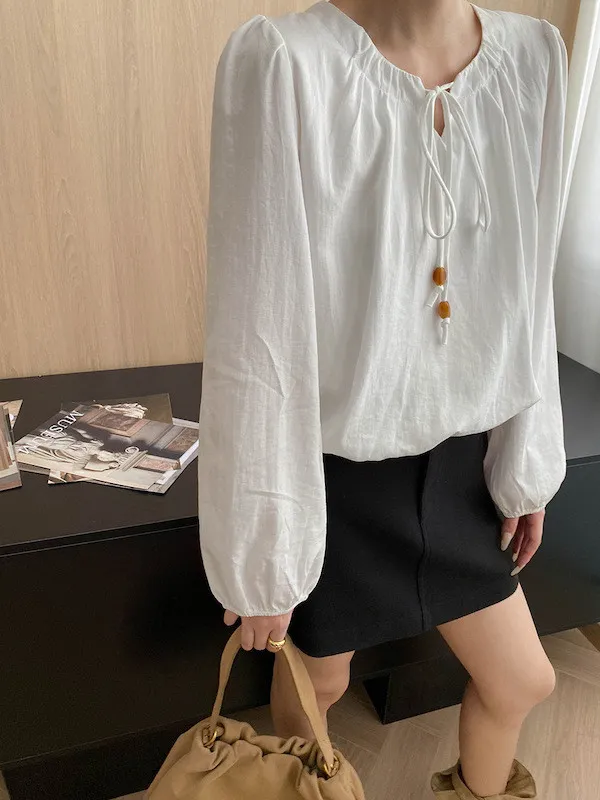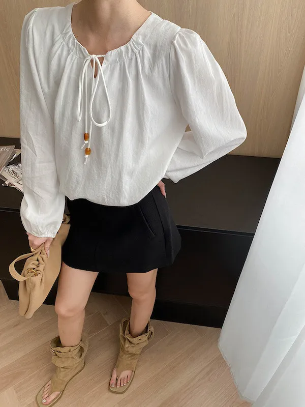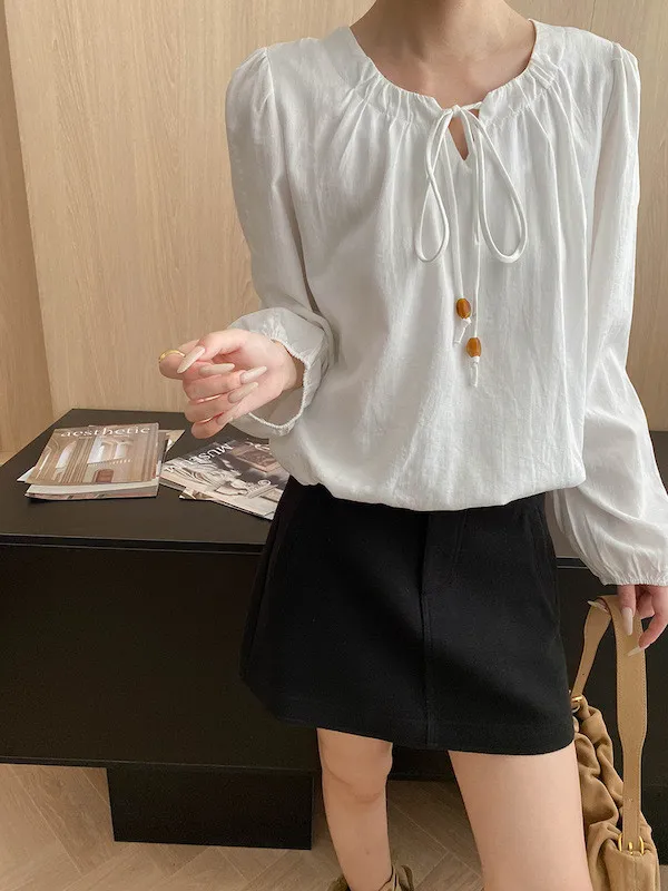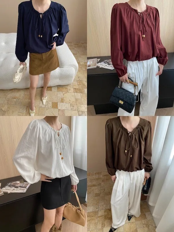 老錢優雅 花苞串珠系帶法式長袖襯衫 4色