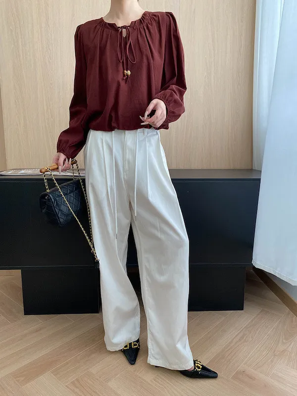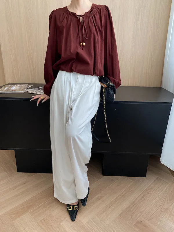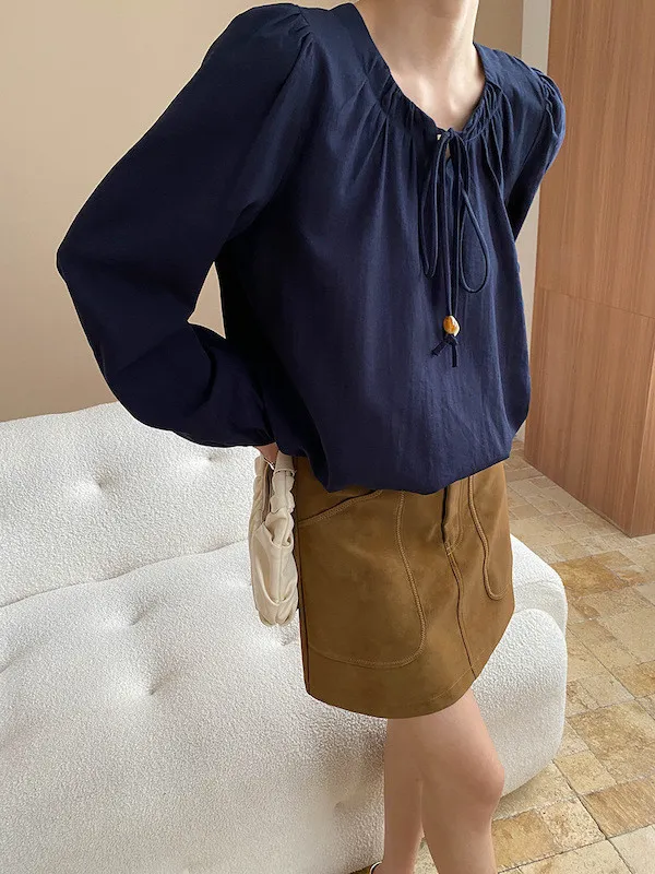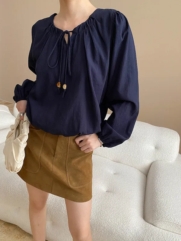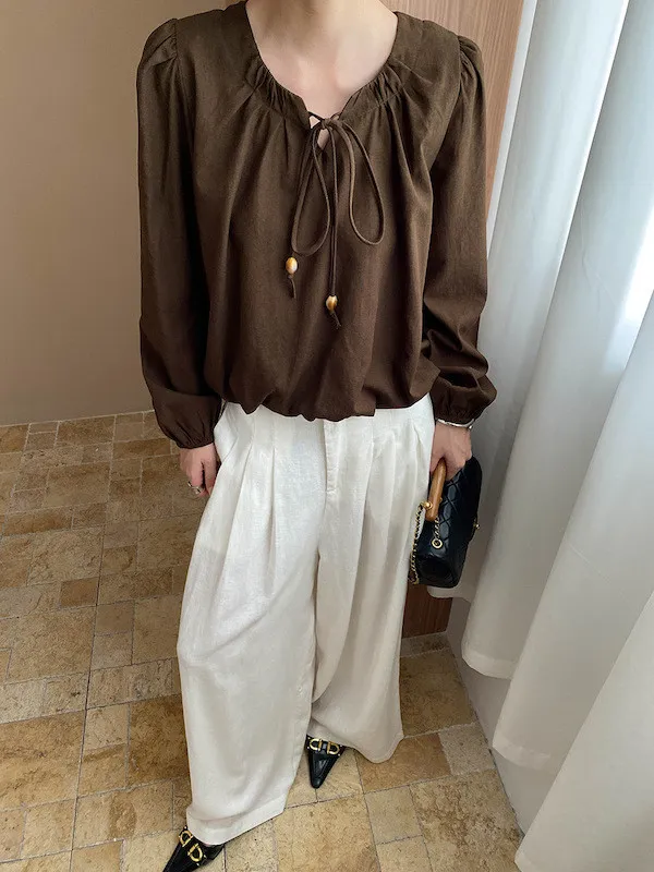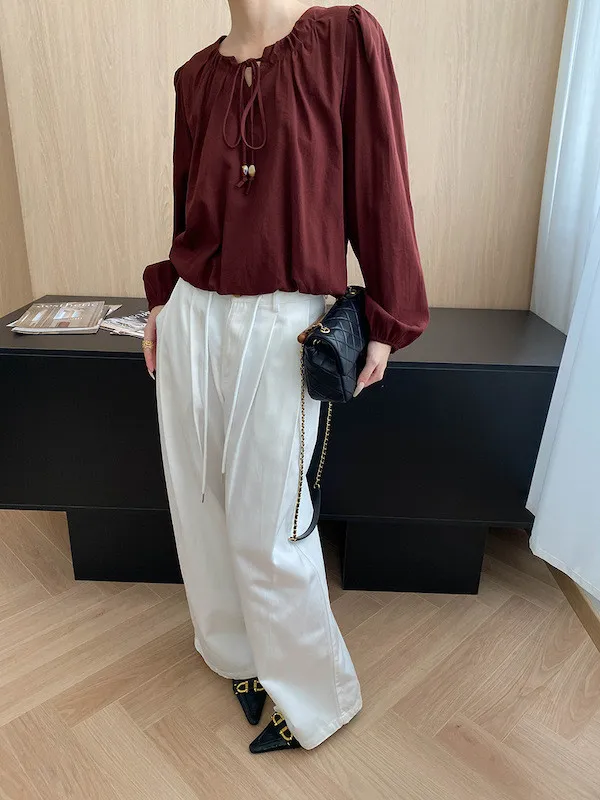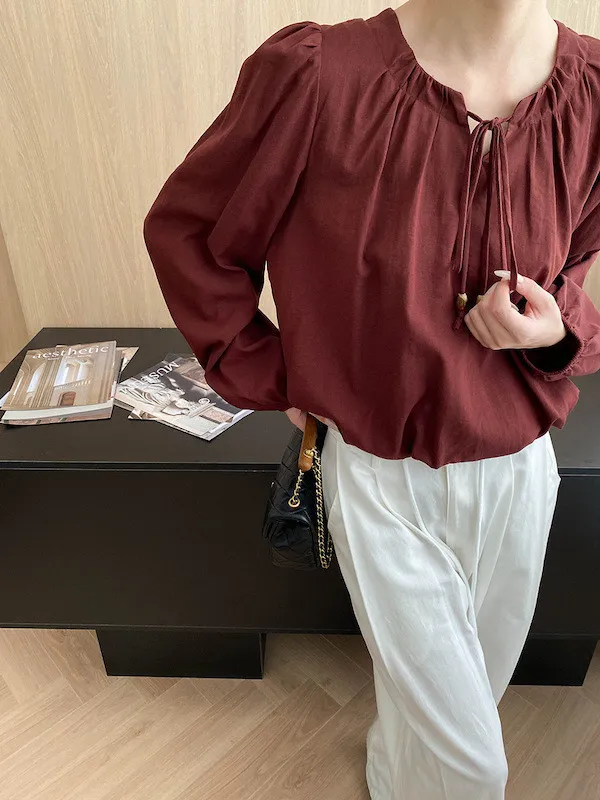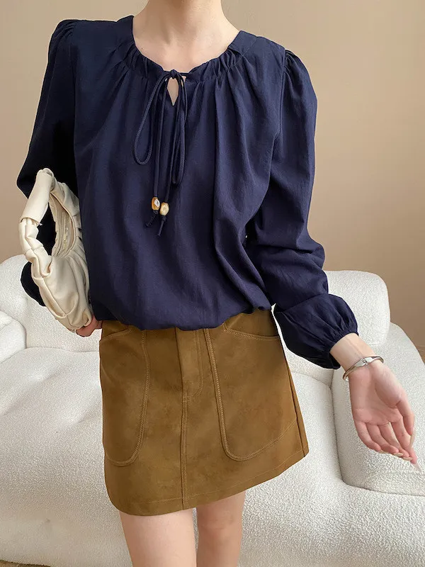 老錢優雅 花苞串珠系帶法式長袖襯衫 4色