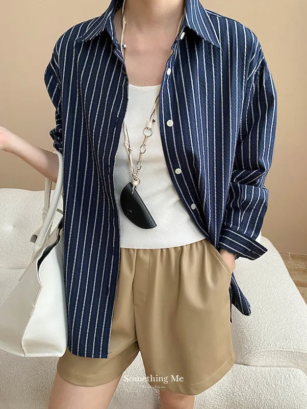 老錢氛圍!質感直條紋寬鬆長袖襯衫 2色