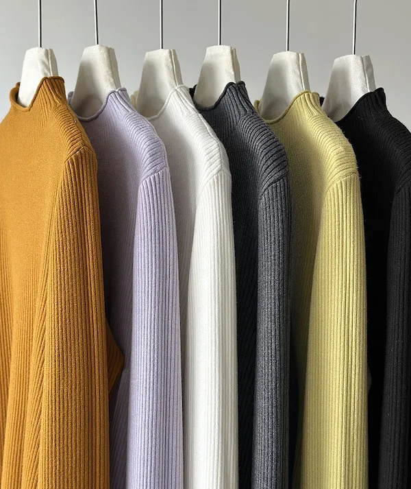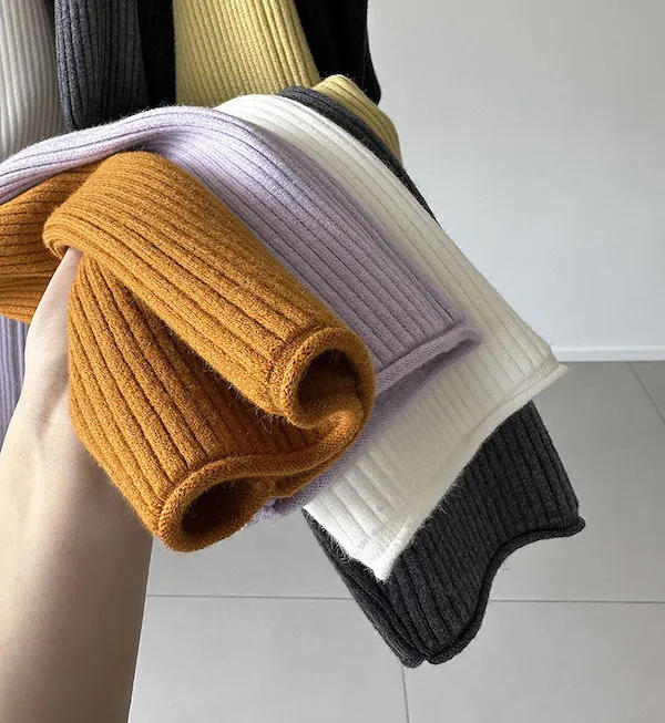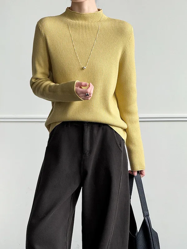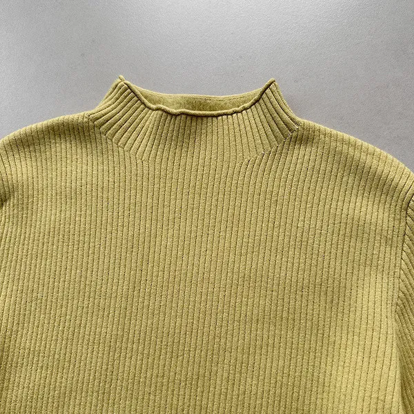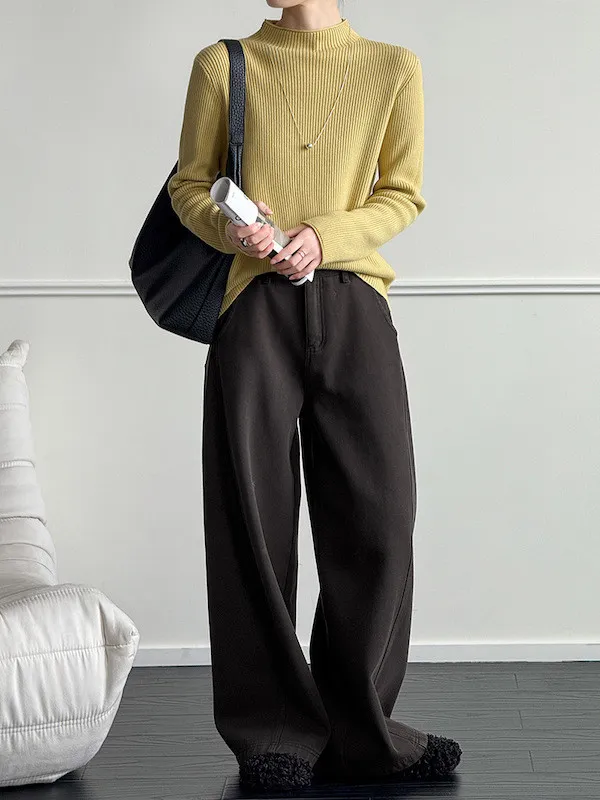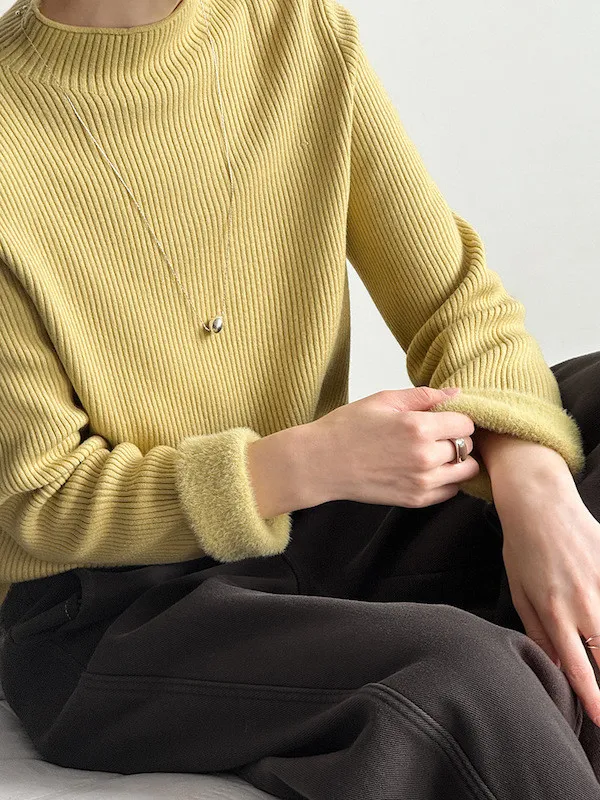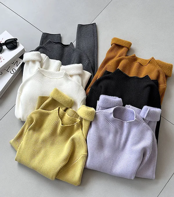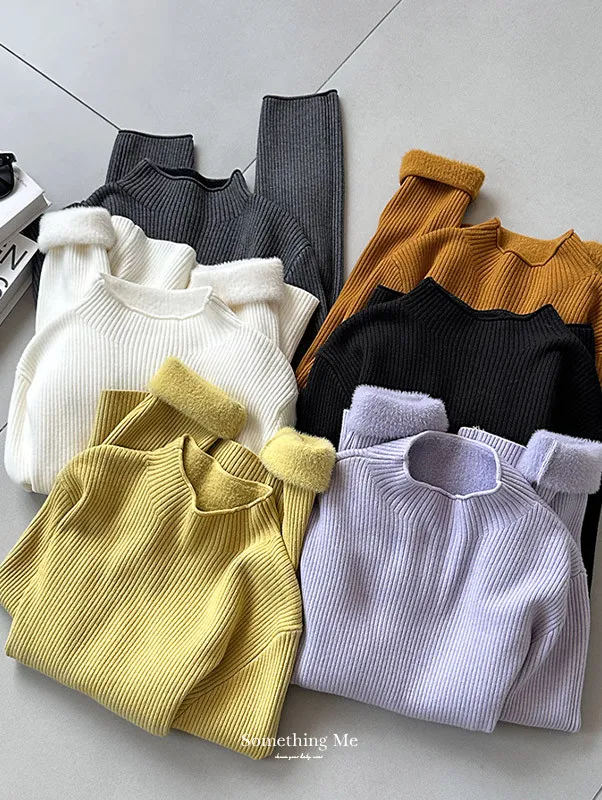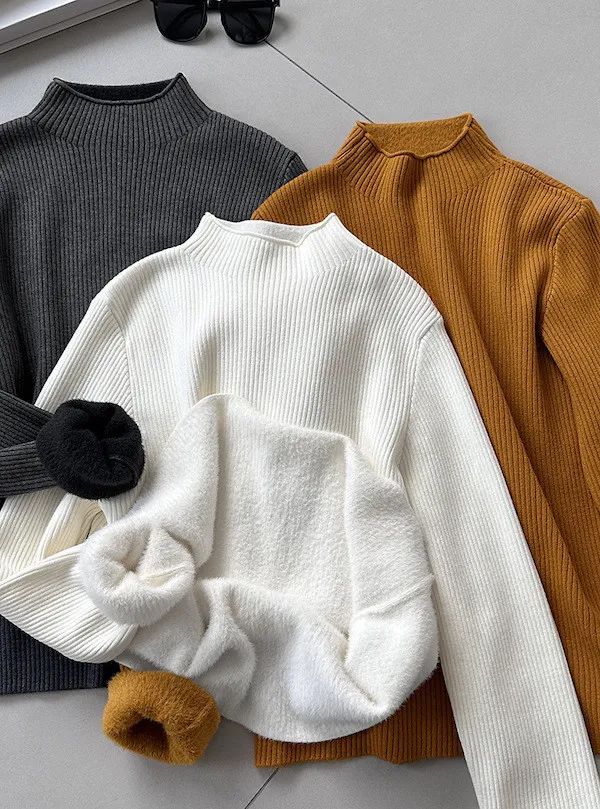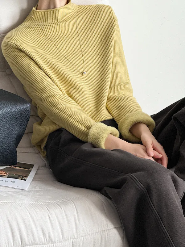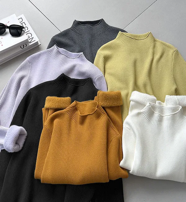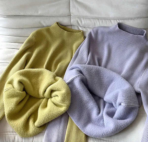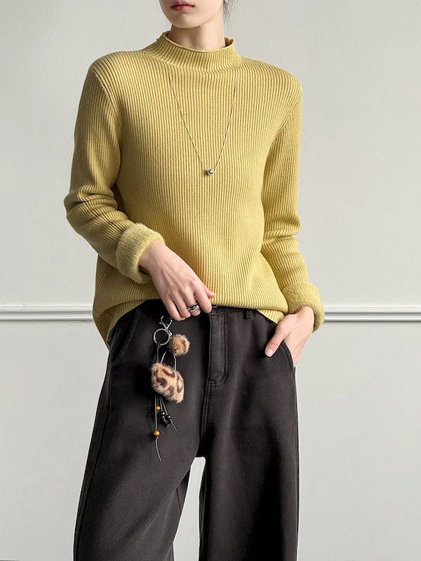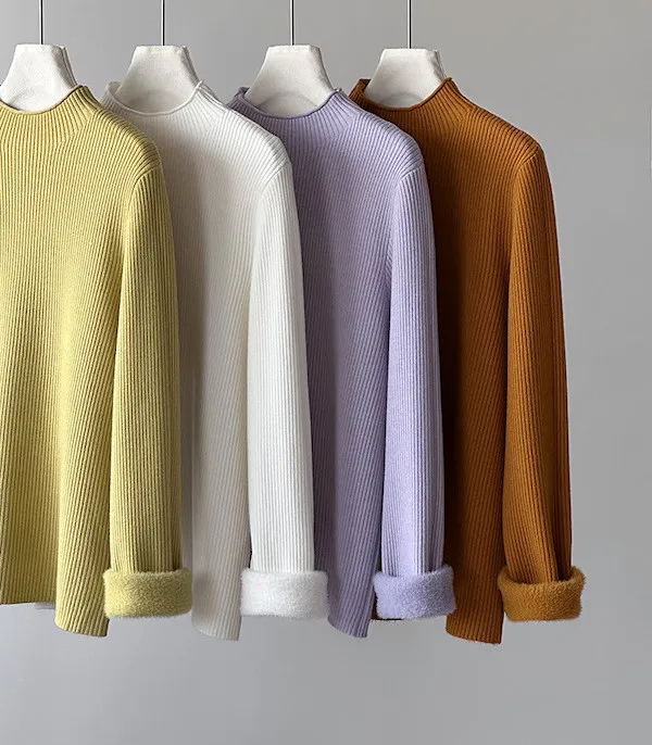 復古簡約豎條半高領針織毛衣(內刷毛) 6色