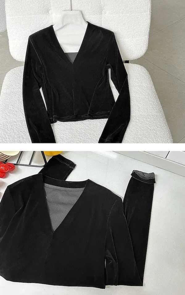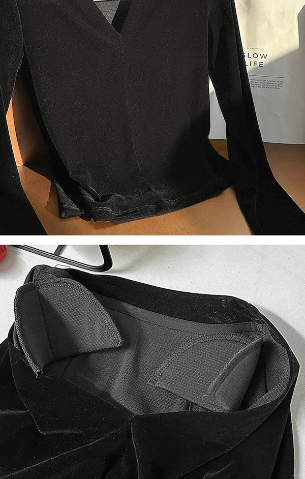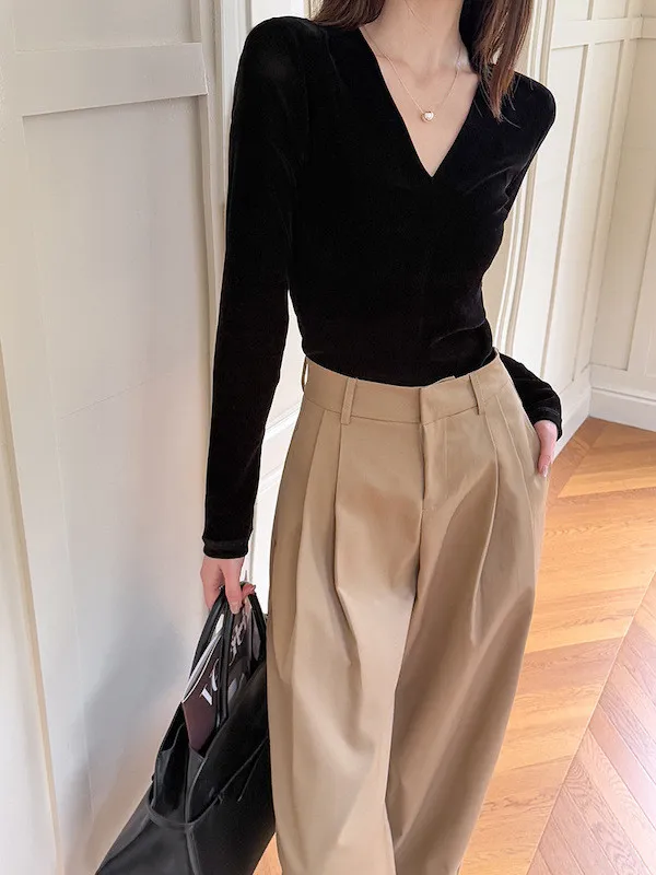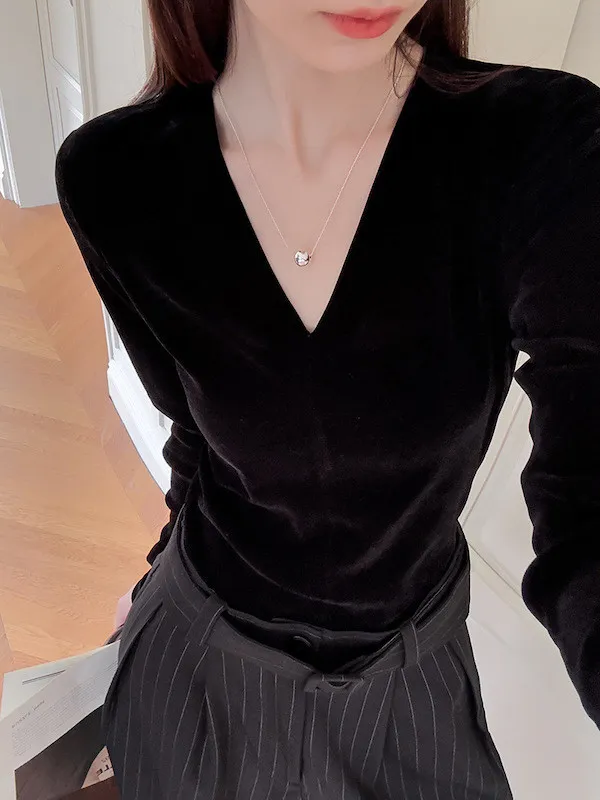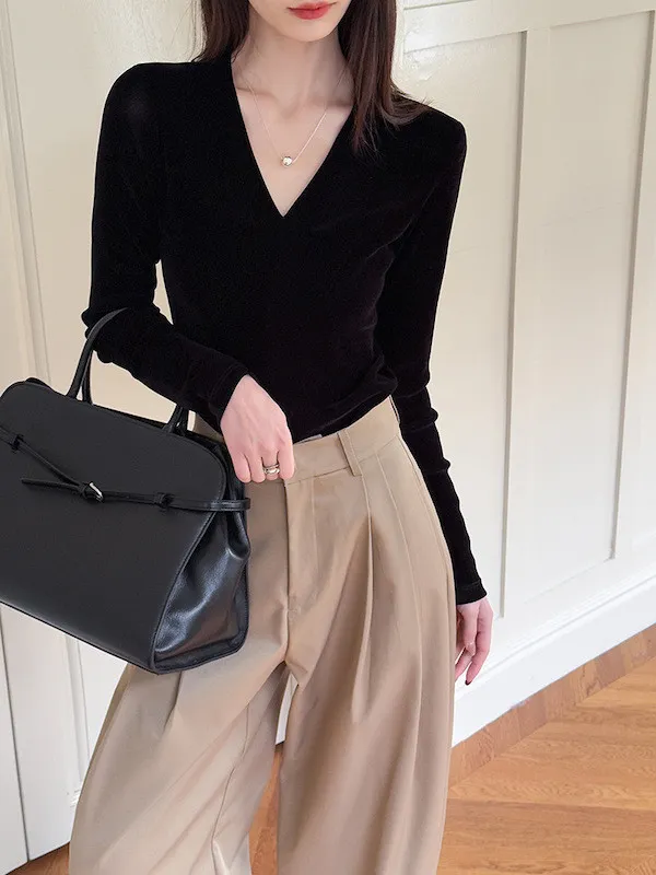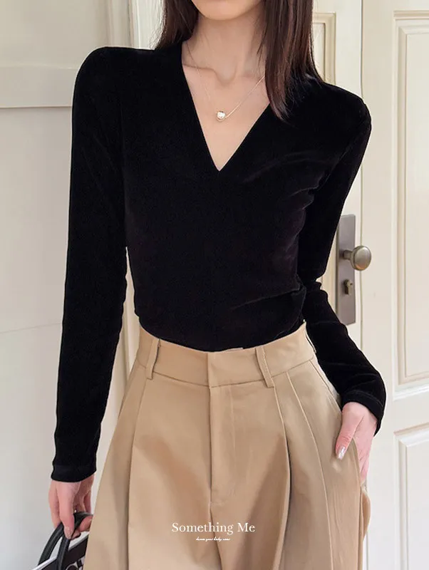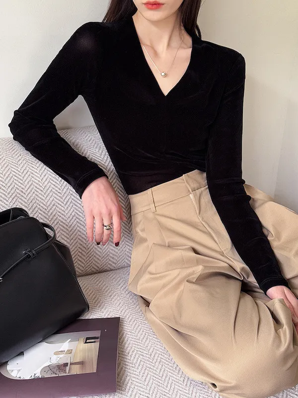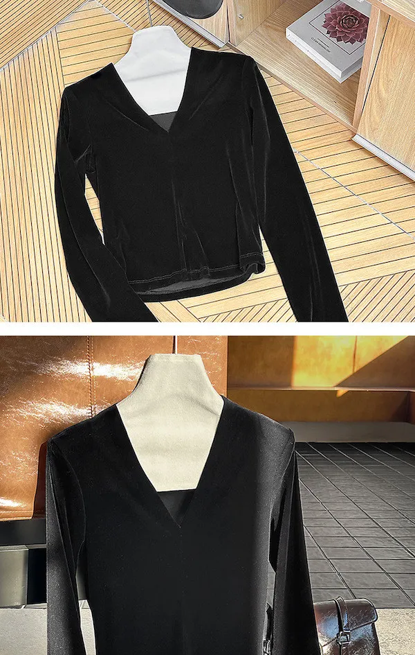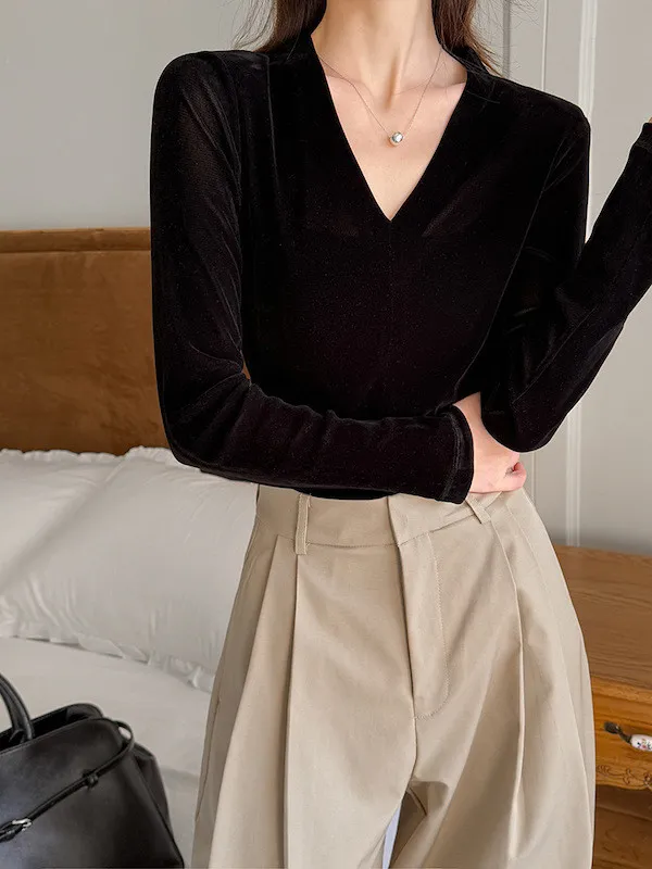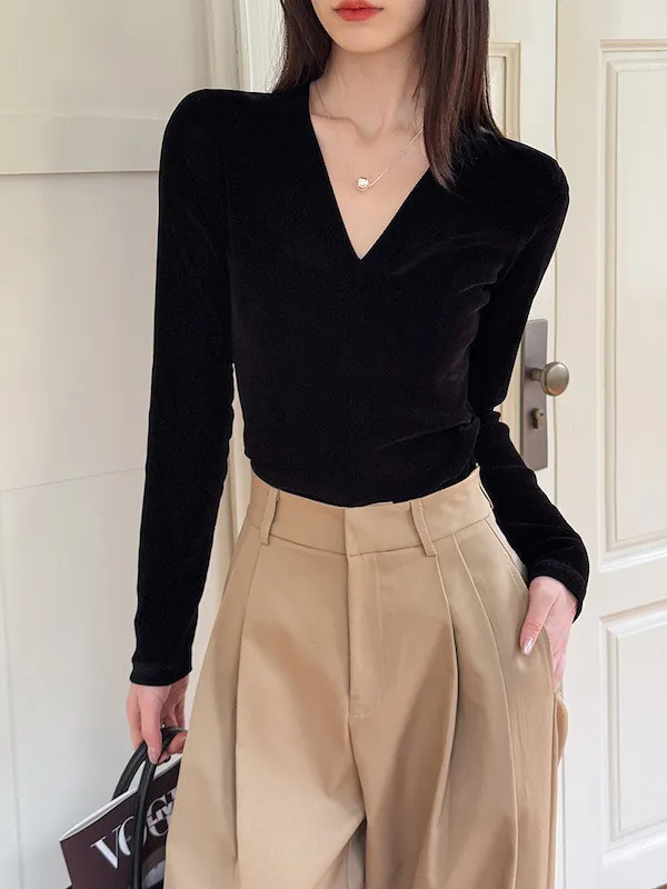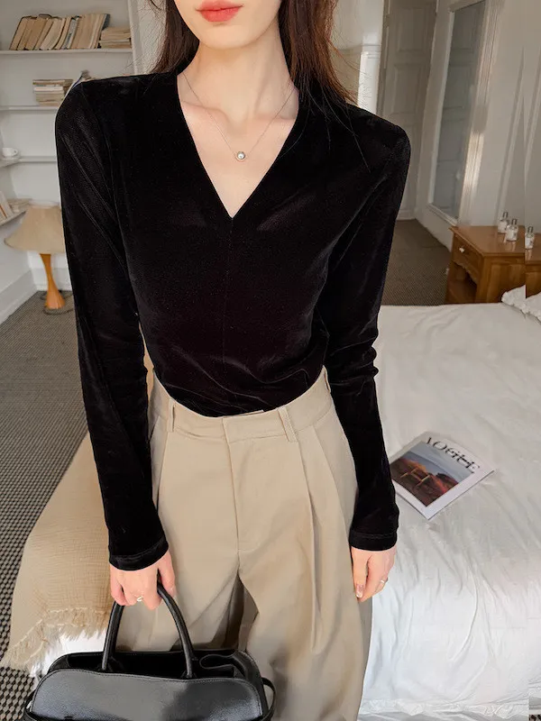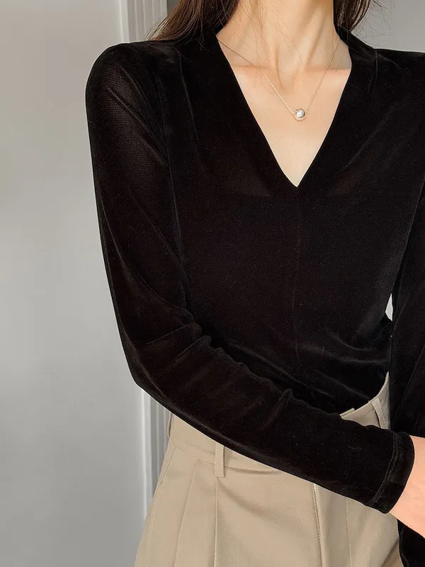 顯瘦靜奢風|V領修身絲絨上衣