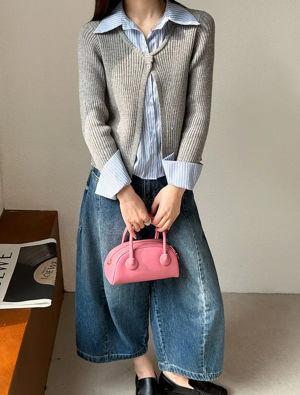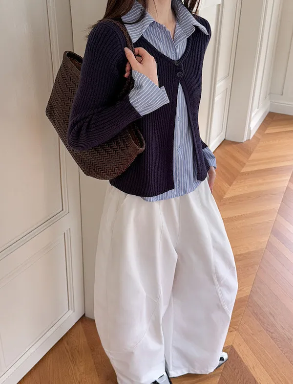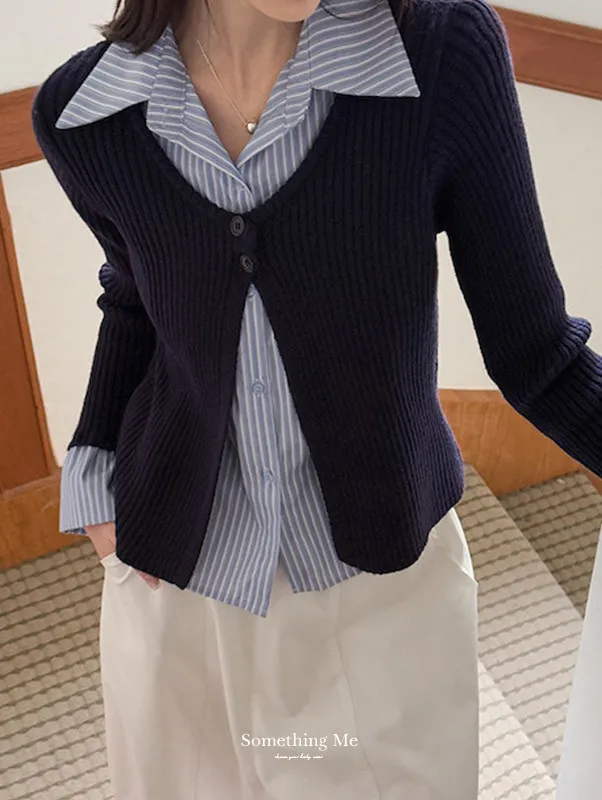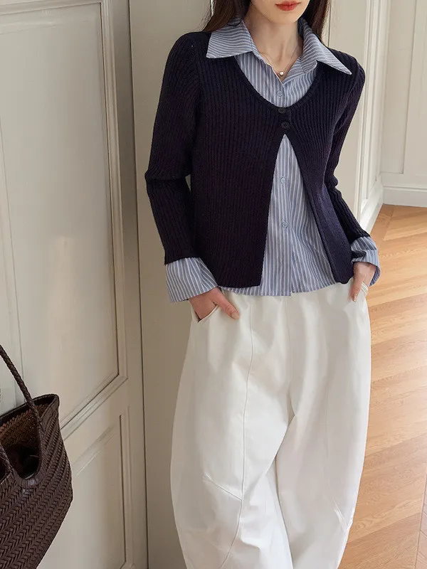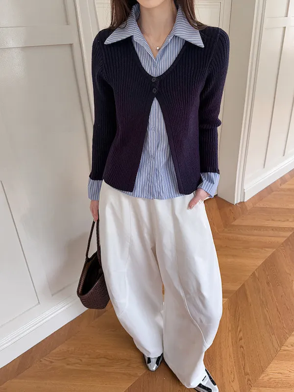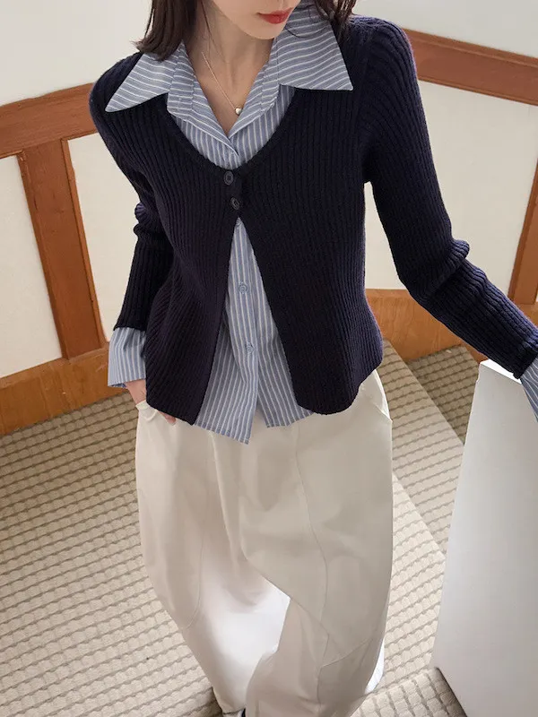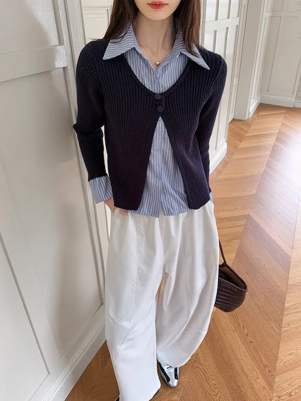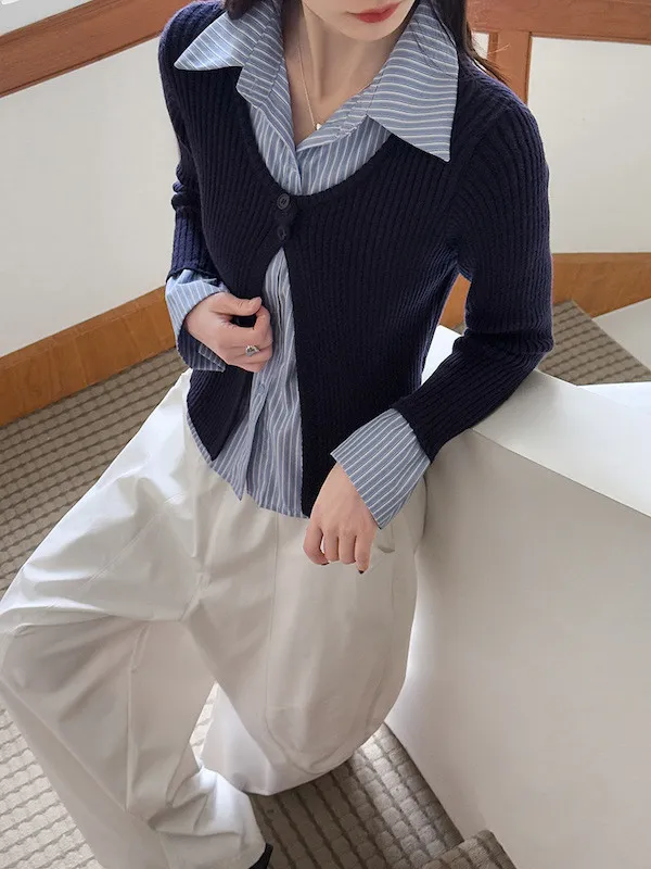 藍白條紋襯衫拼接深色坑條針織,精準修飾腰線