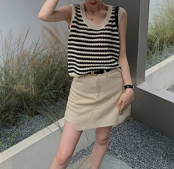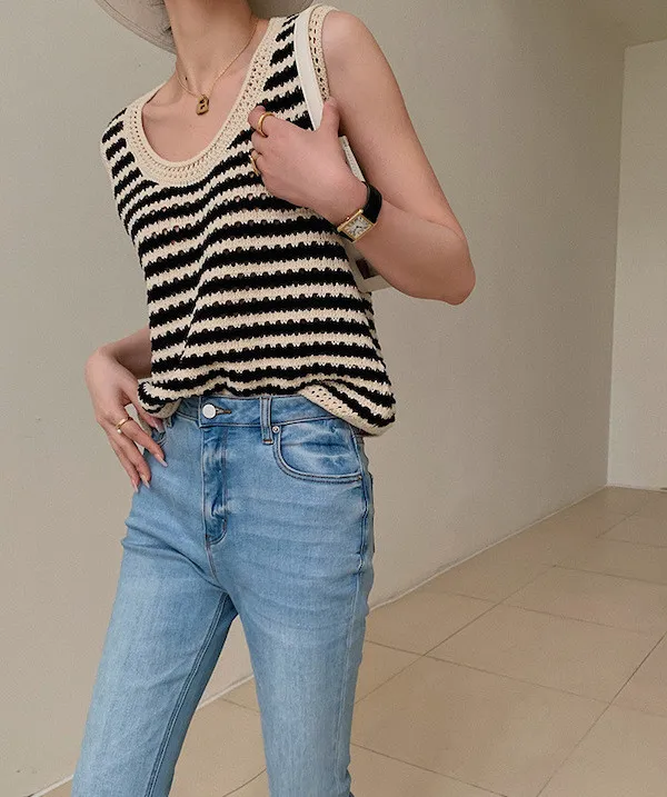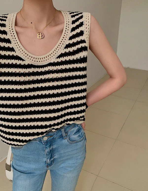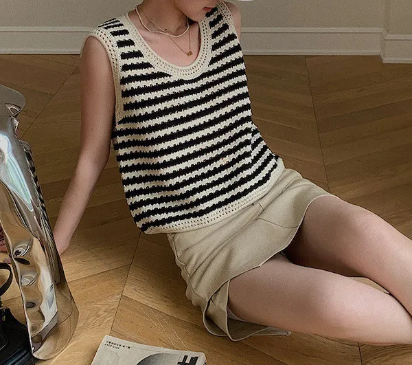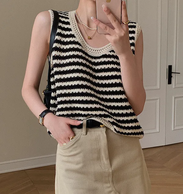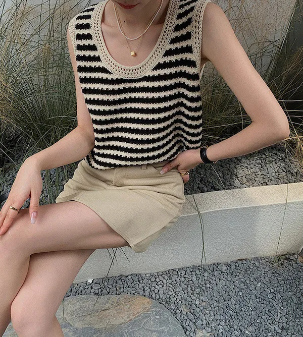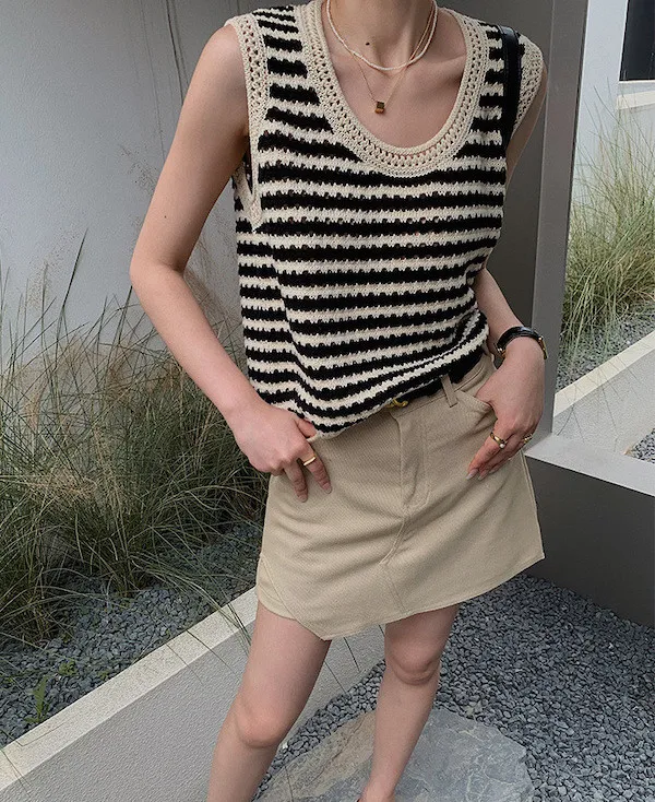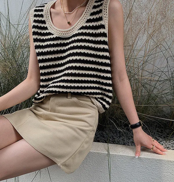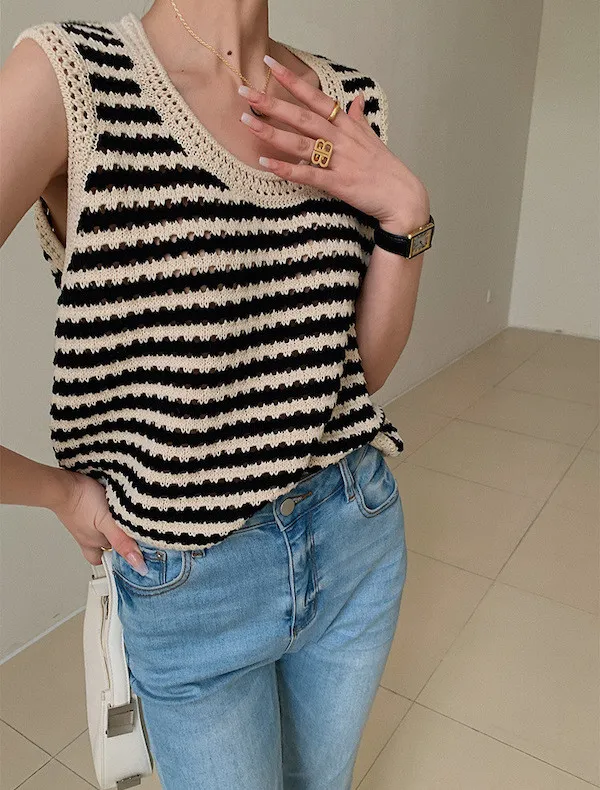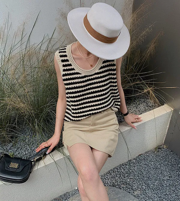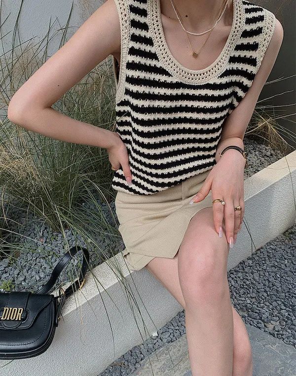 度假感黑白條紋針織無袖背心