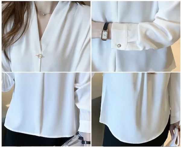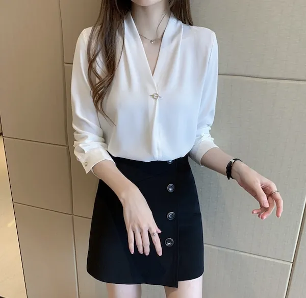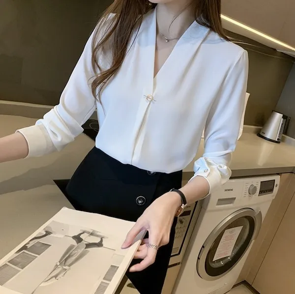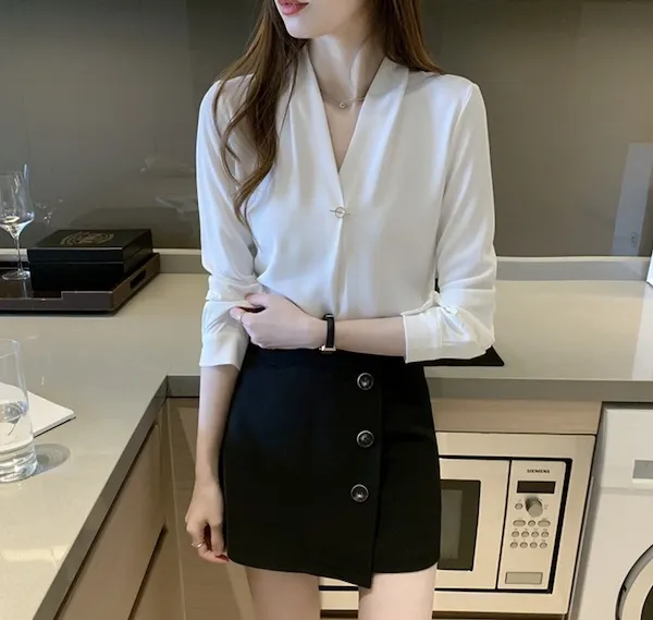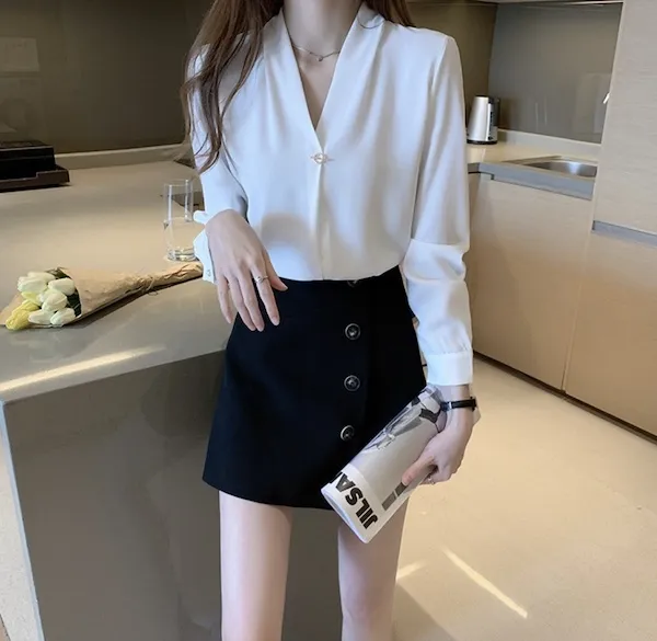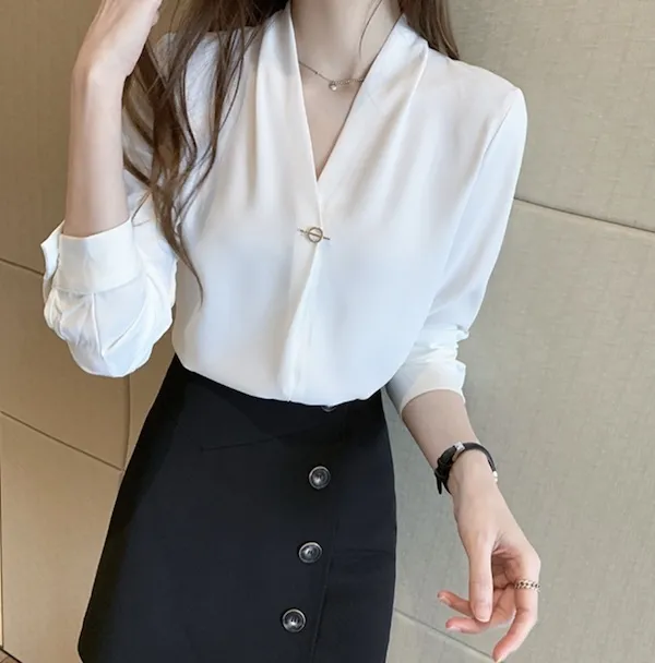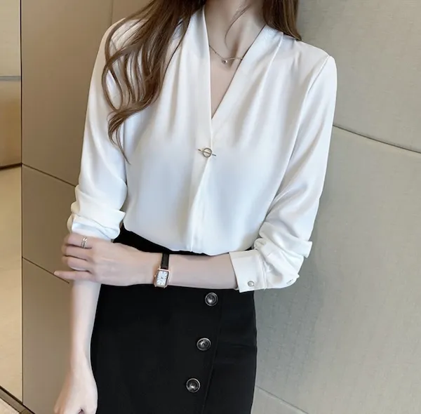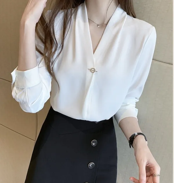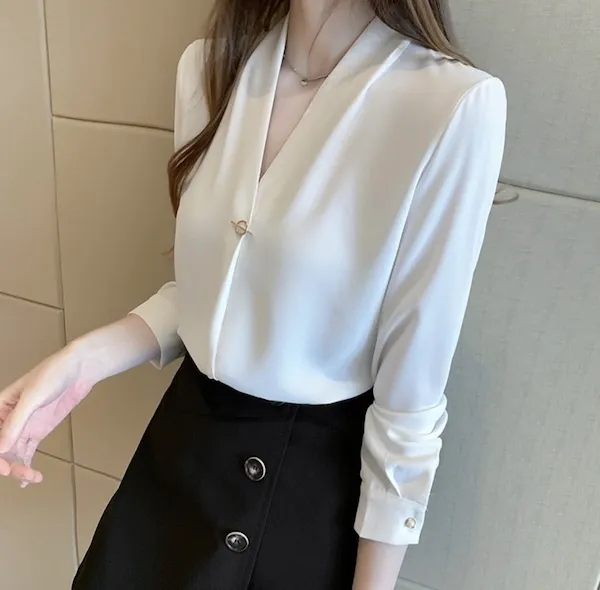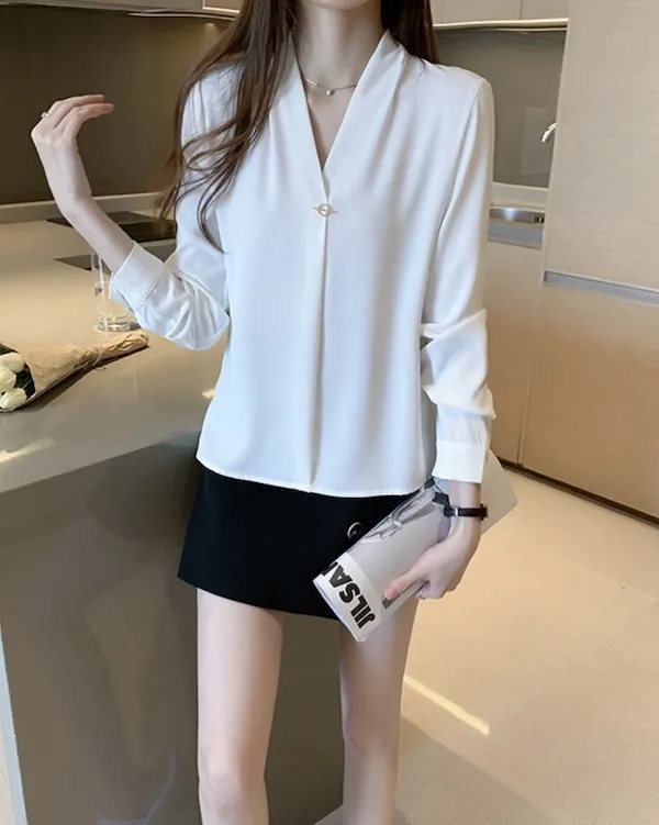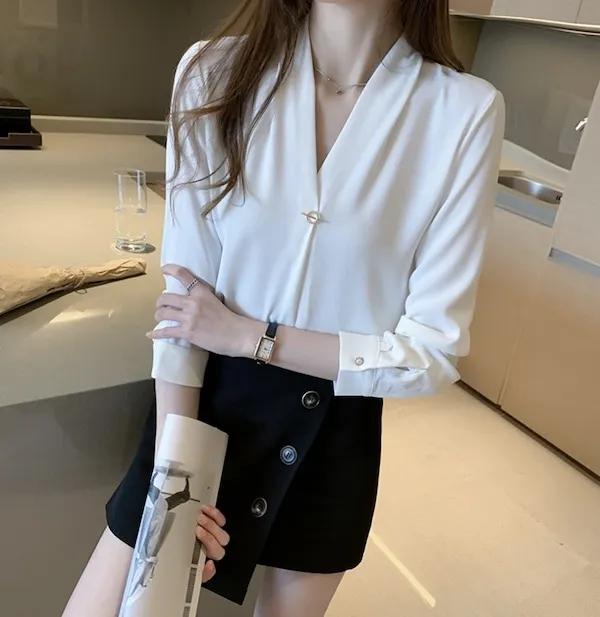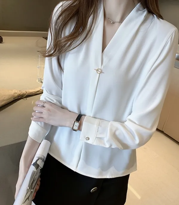 浪漫V領金屬釦雪紡長袖襯衫