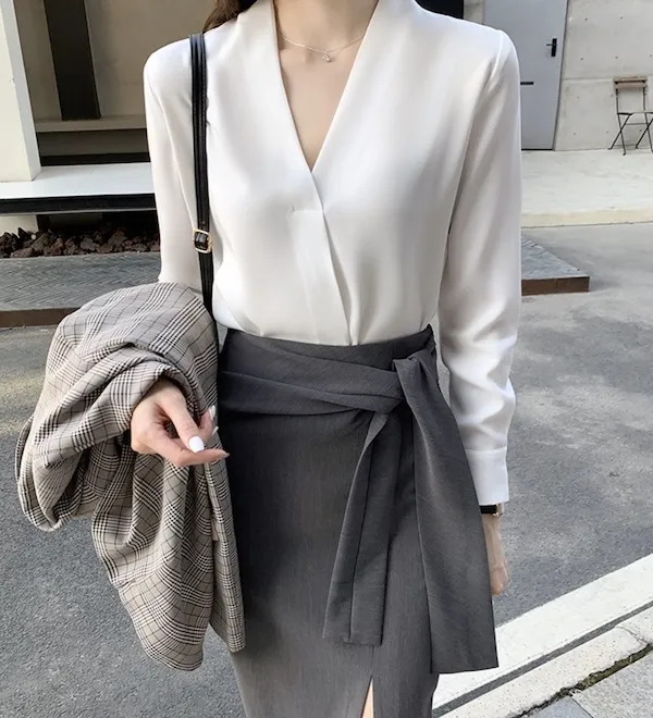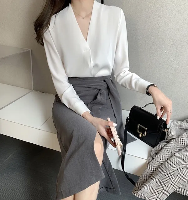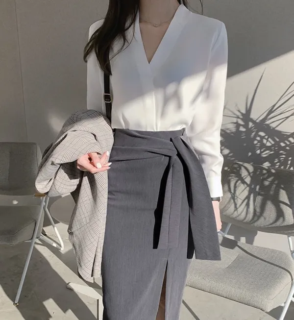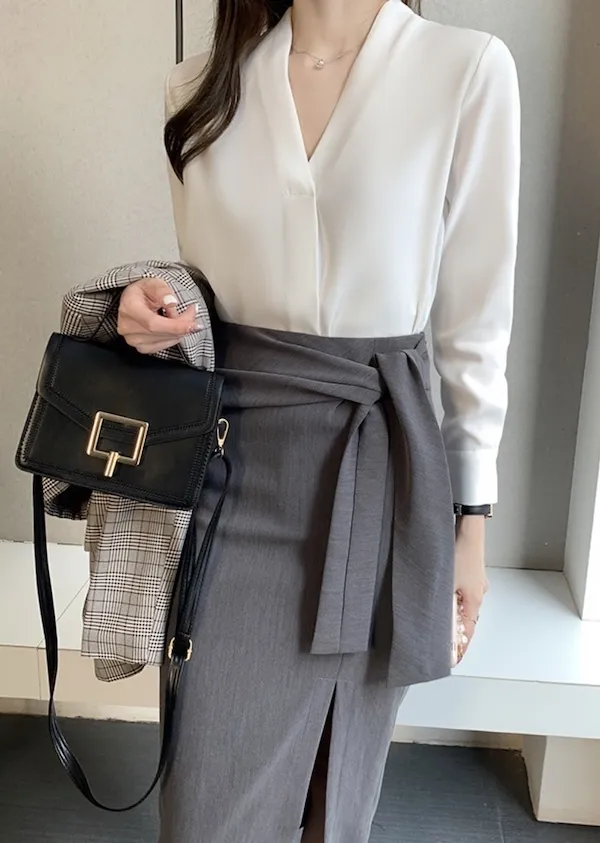 BF231216 赫本高腰剪裁中長裙(送腰帶)