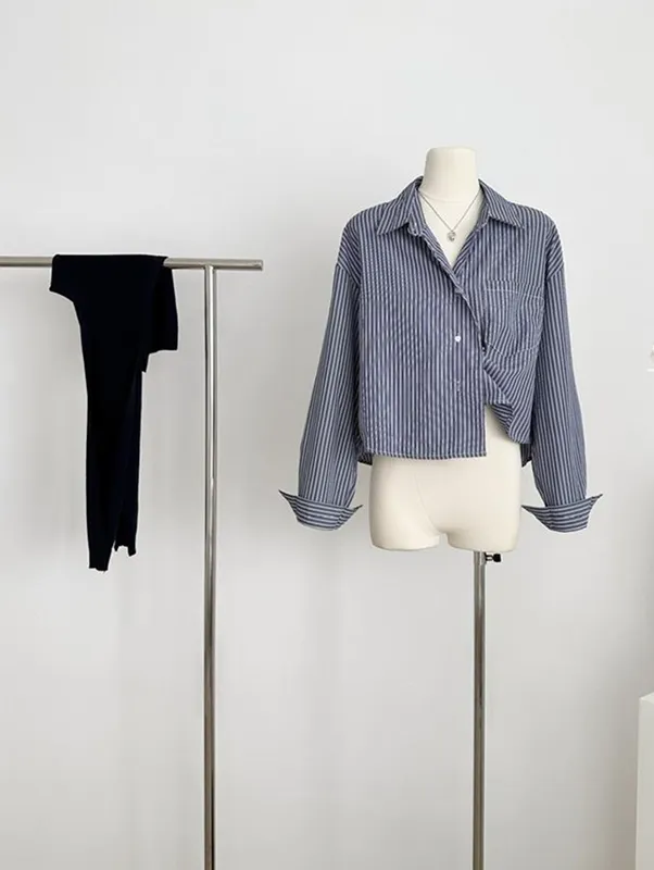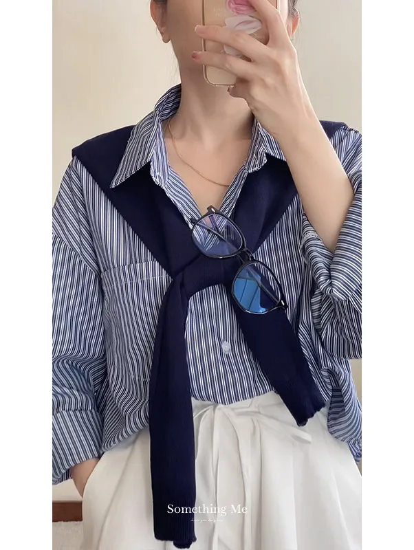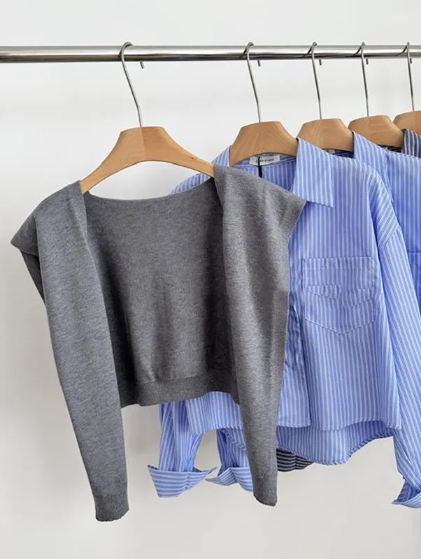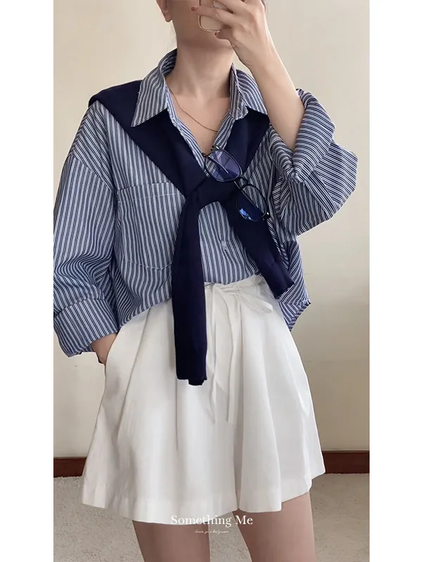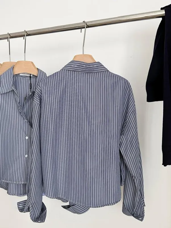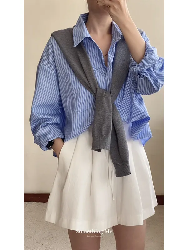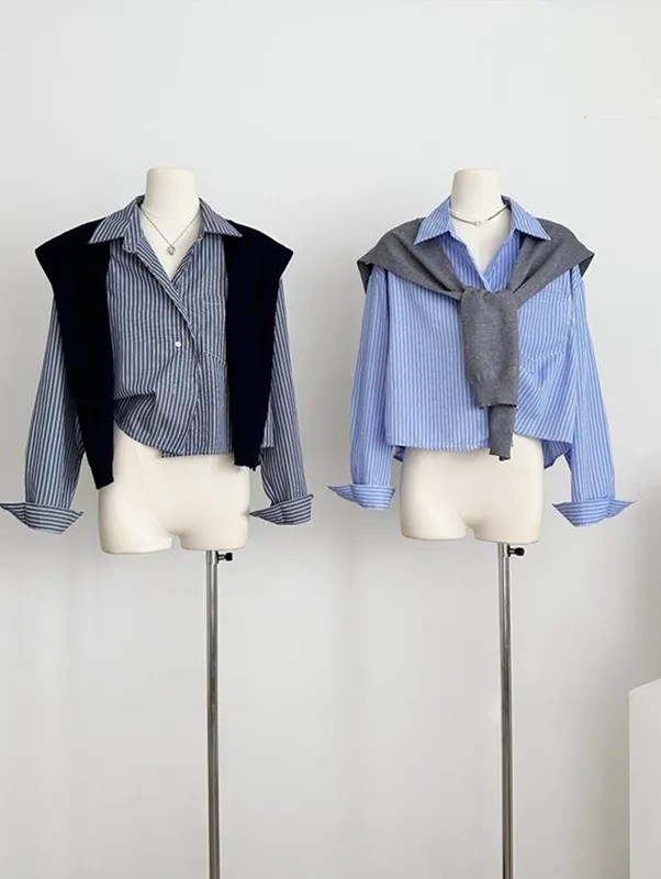 現貨!時髦豎紋短版長袖襯衫(附披肩) 2色